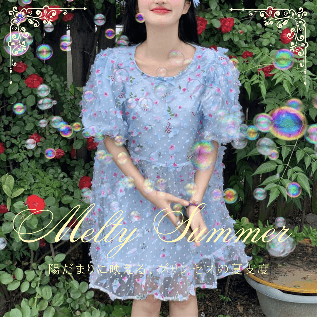 《ふわふわ透け感スカート》きらめく庭園のロマンティックリボンワンピース(全2色)