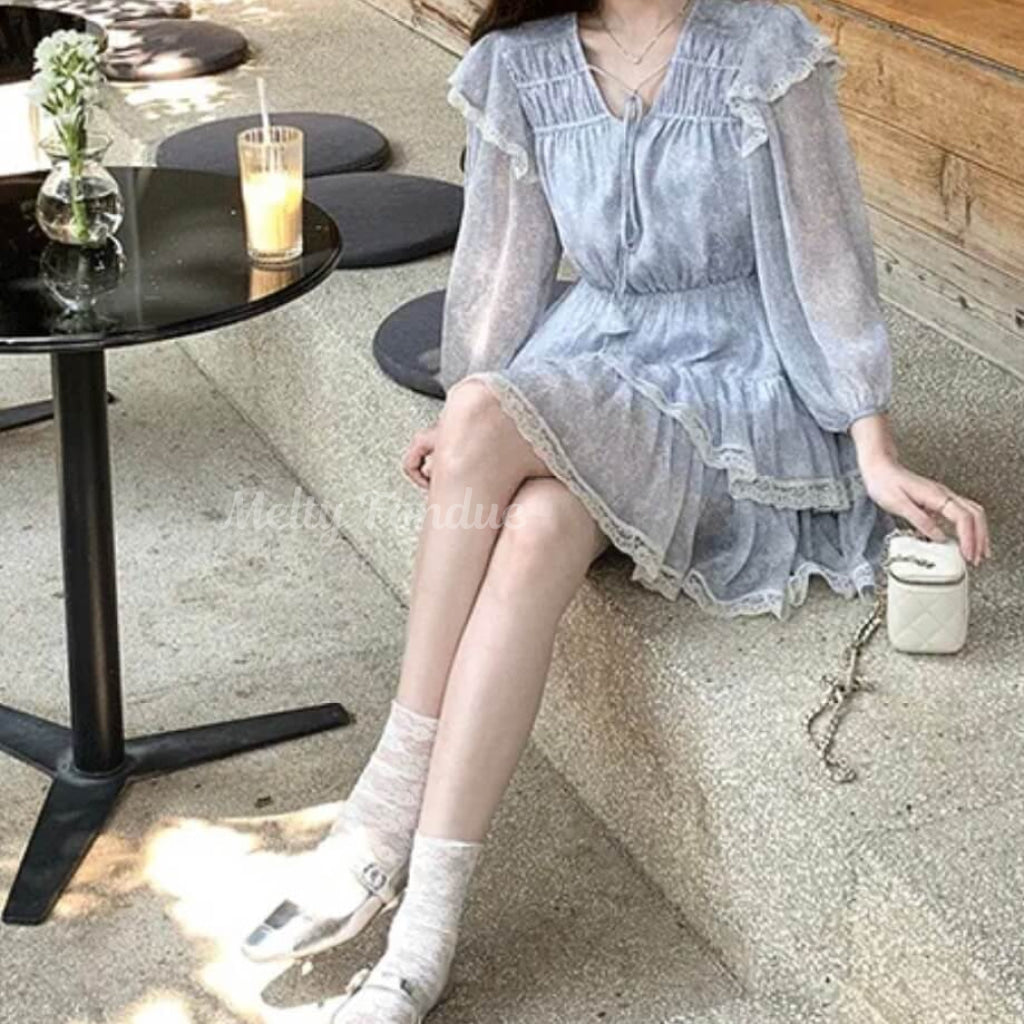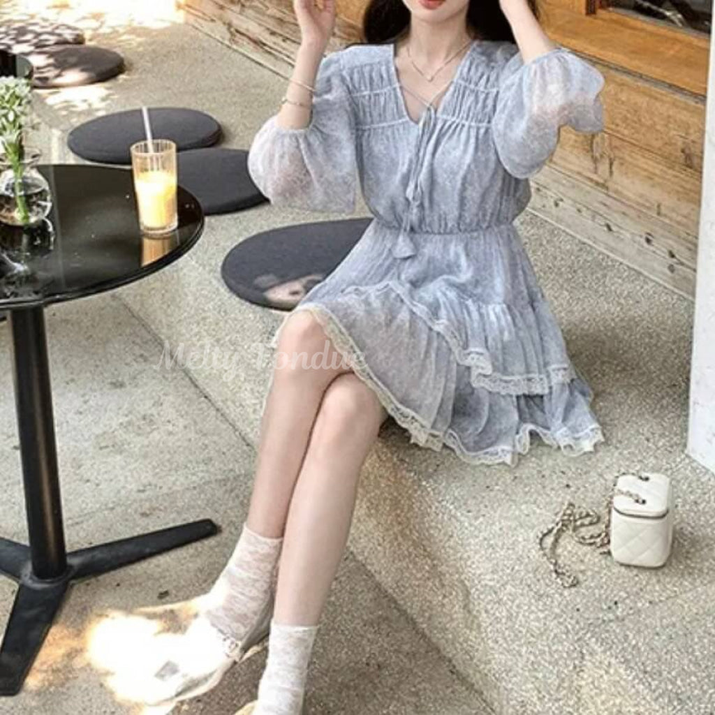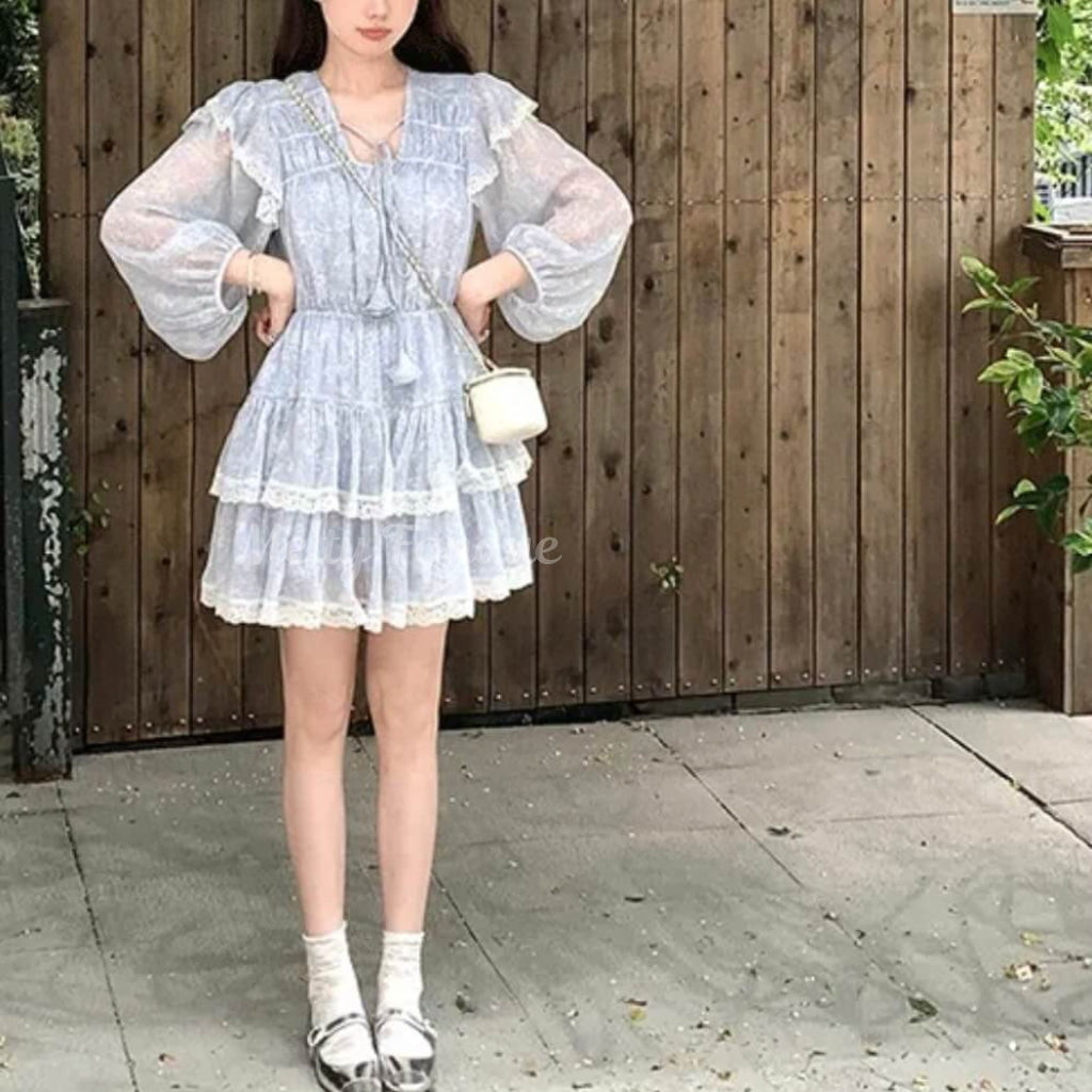 空の色を写したようなライトブルーカラーが特徴のガーリーワンピース。