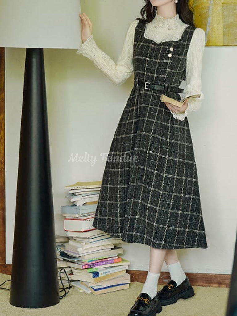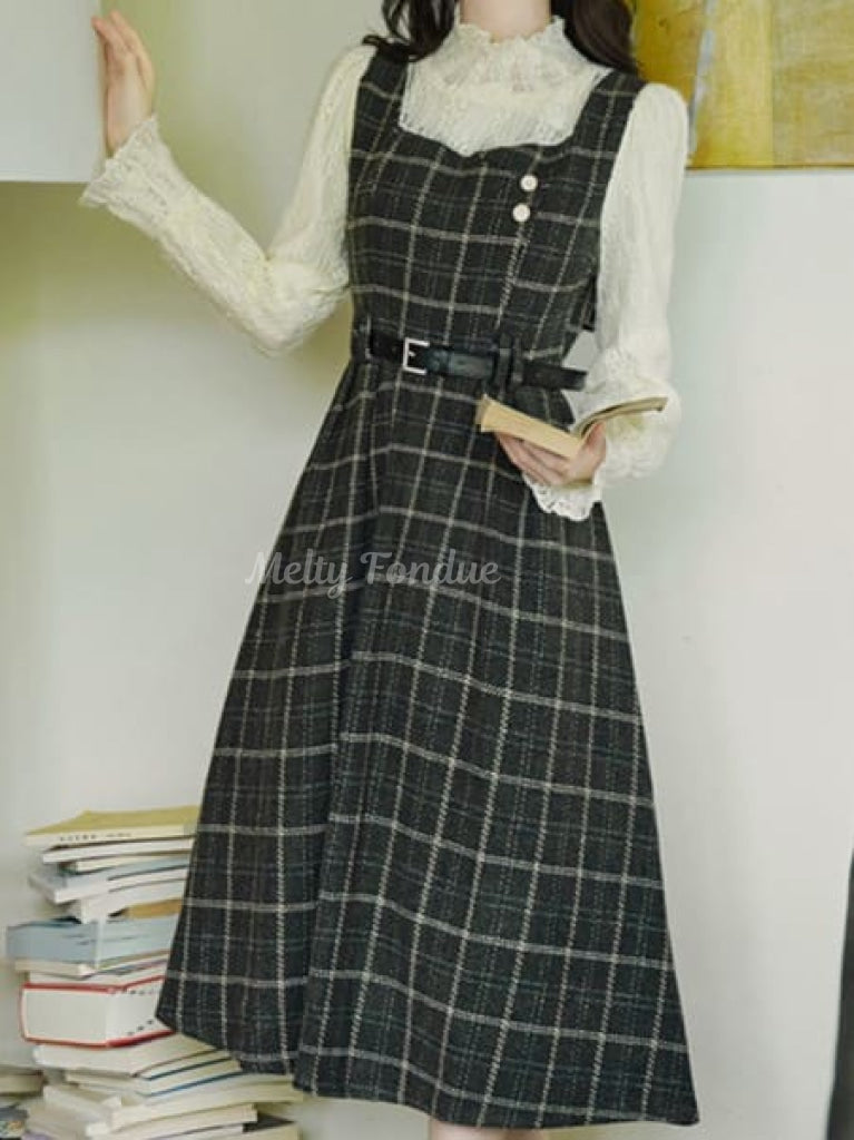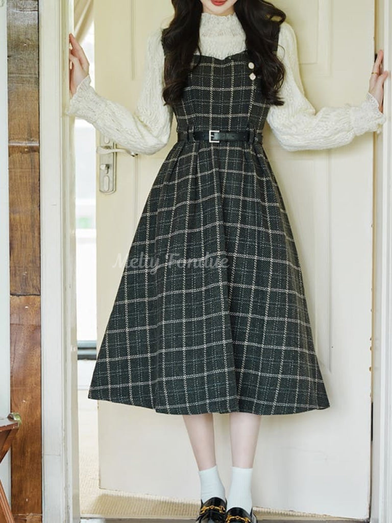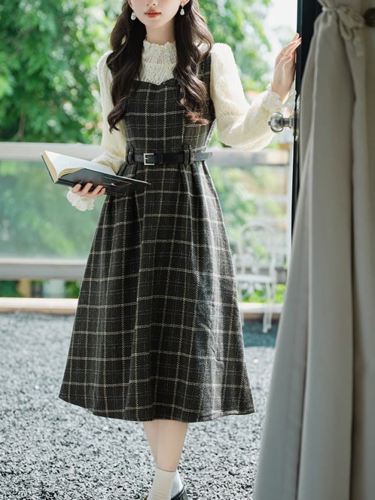 チェック柄がクラシカルでありながら、ベルトでウエストを引き締めるデザインがモダンな雰囲気を演出しています。