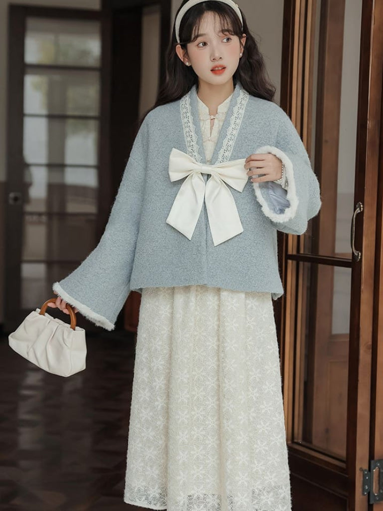 春(3月~5月):軽やかなホワイトレースやリボン付きのスカートと合わせ、春らしいフェミニンなコーディネートに。