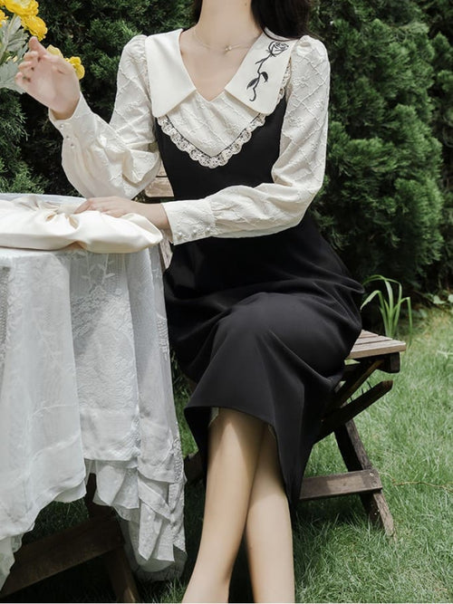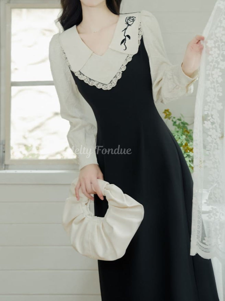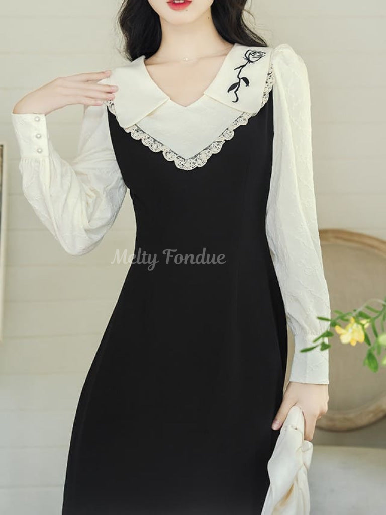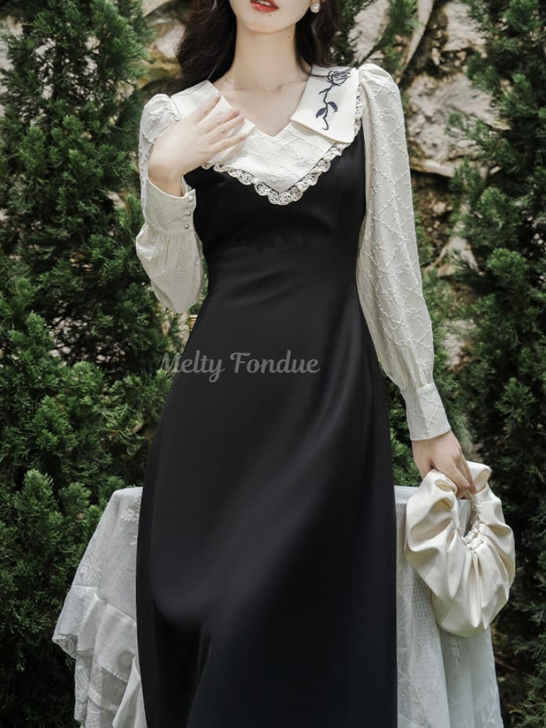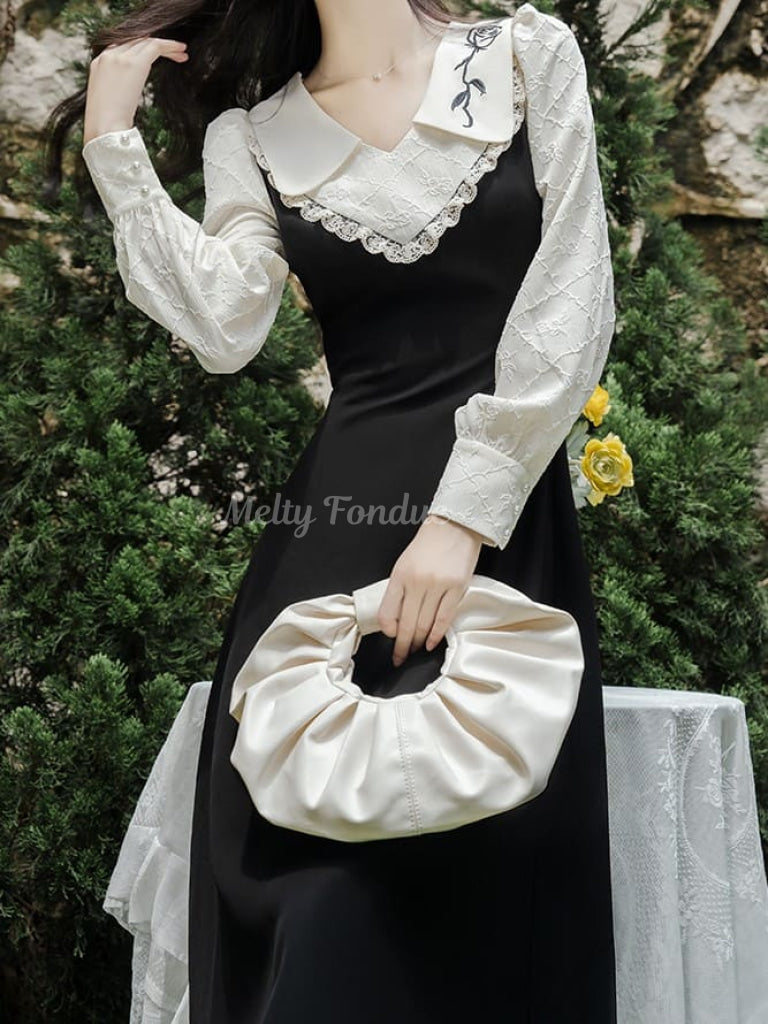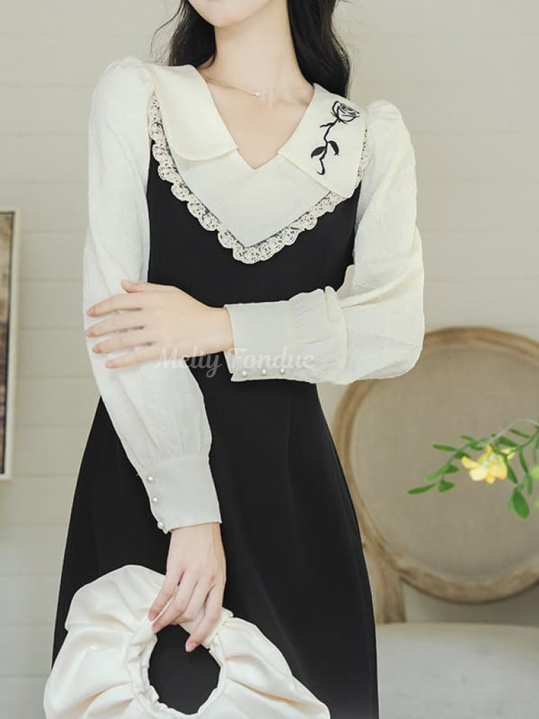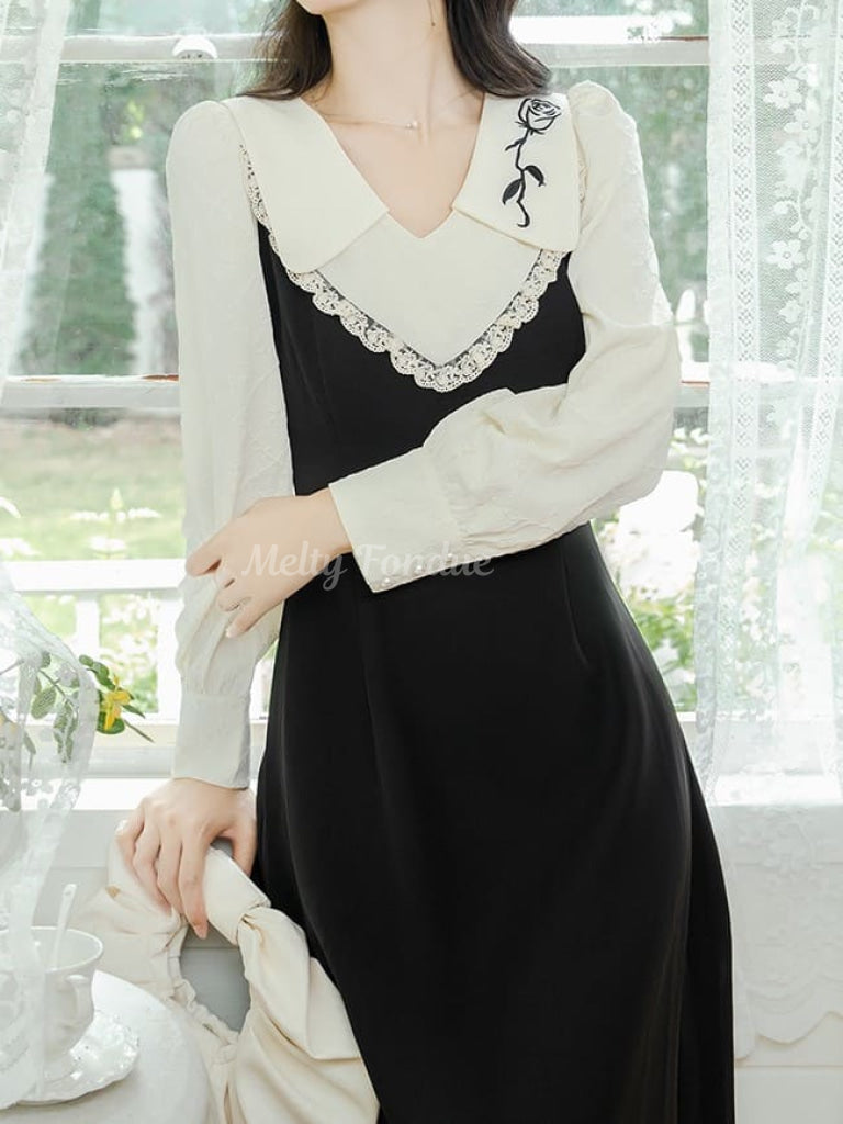 大きな襟とレースのデザインが、全体に優雅で上品な印象を与えます。