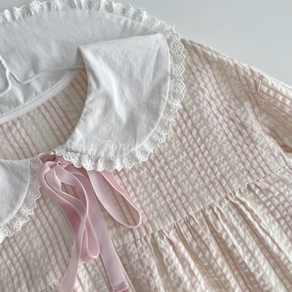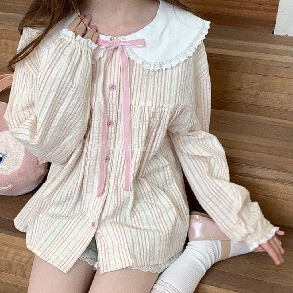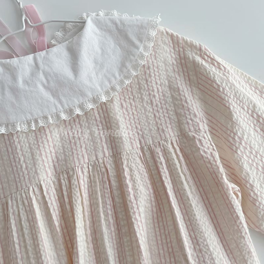 ・大きな丸襟に繊細なレースがあしらわれており、クラシカルでガーリーな雰囲気を演出。