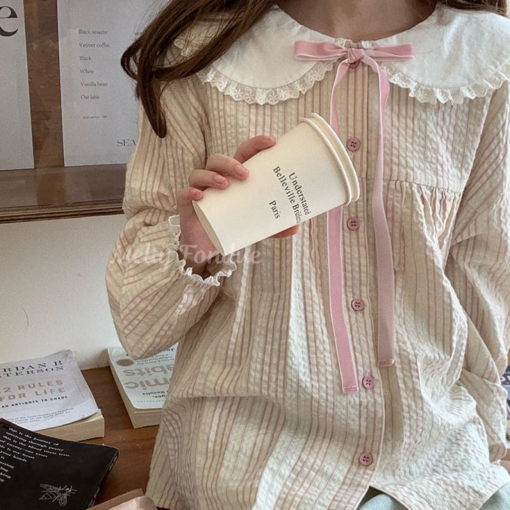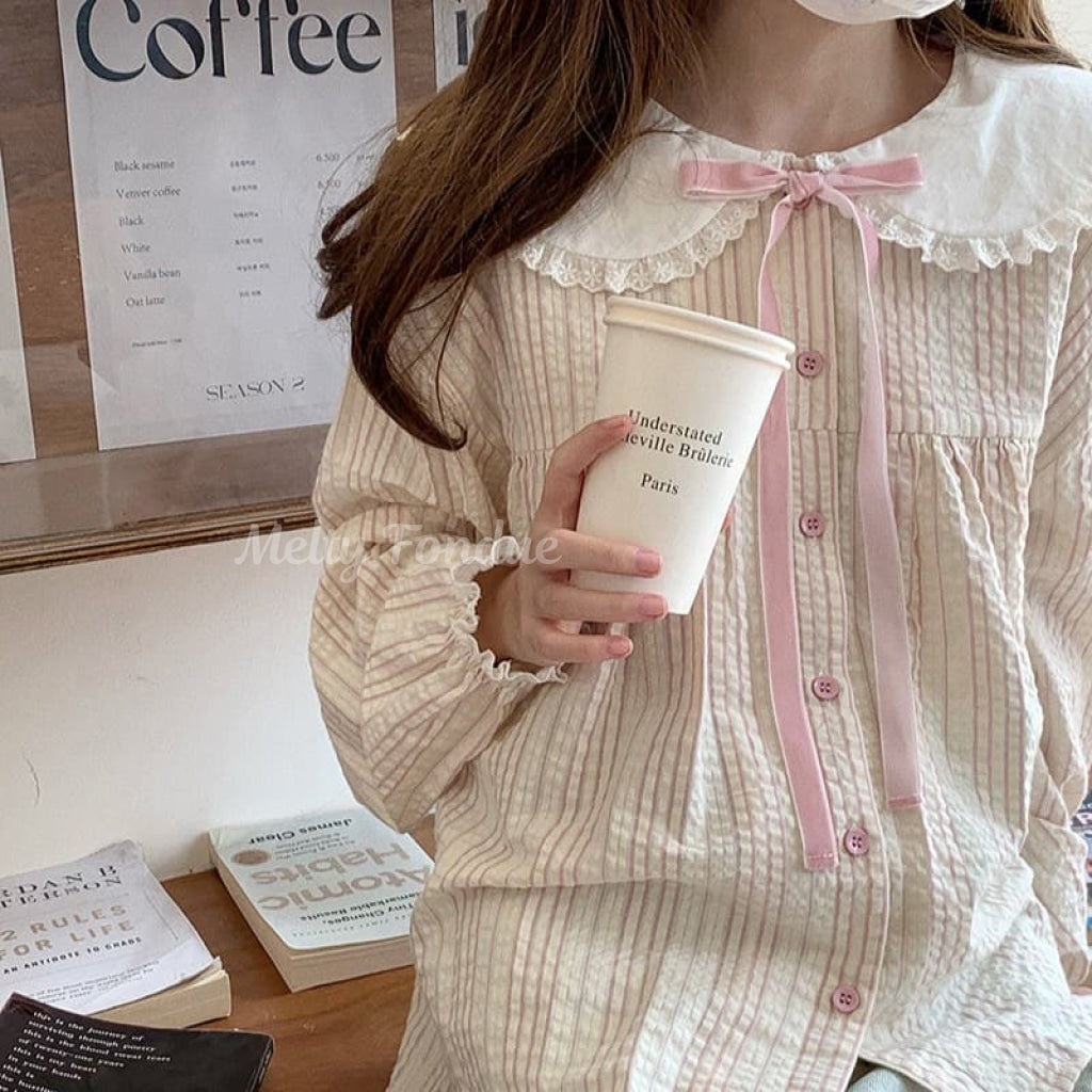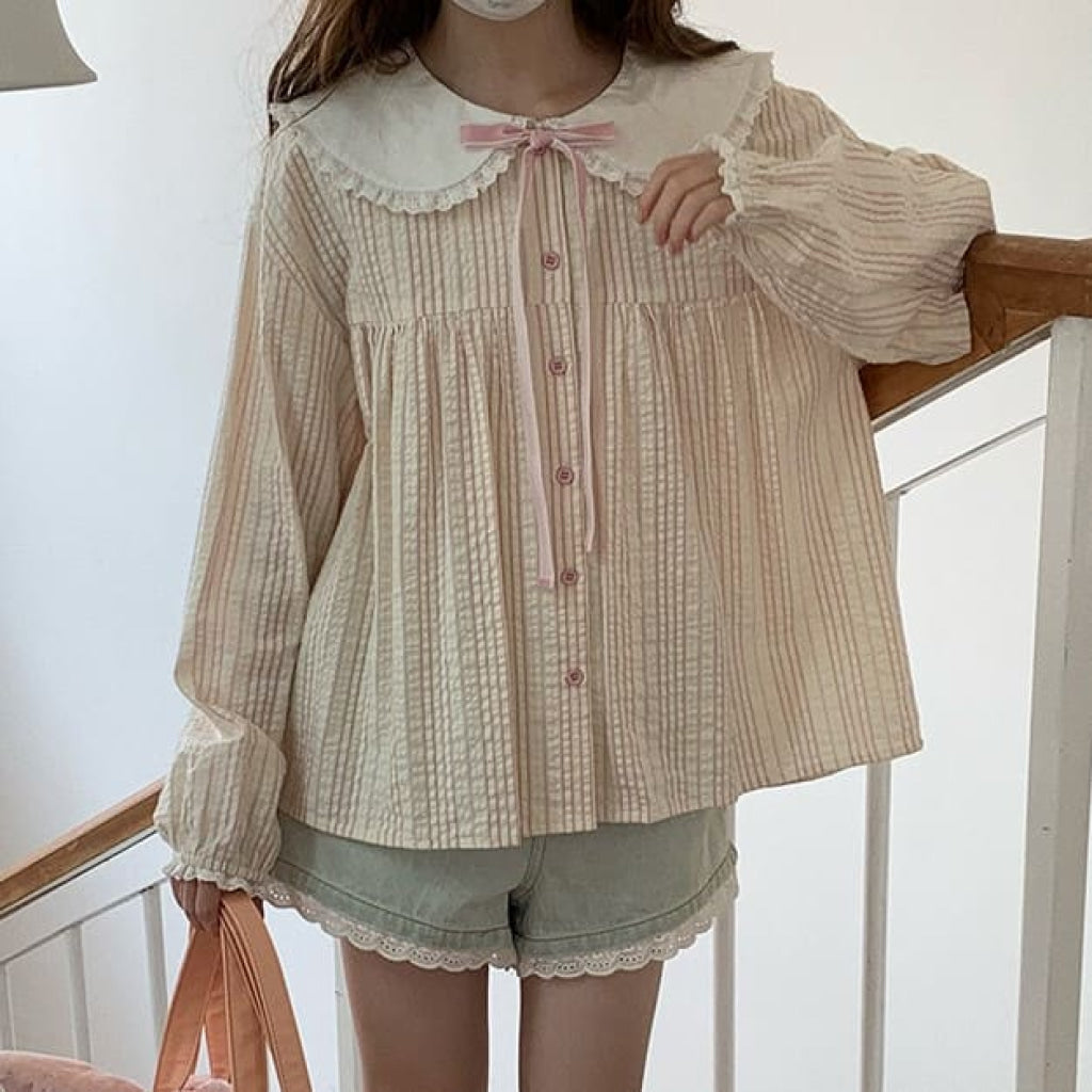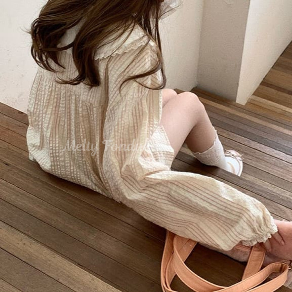 ・大きな丸襟に繊細なレースがあしらわれており、クラシカルでガーリーな雰囲気を演出。