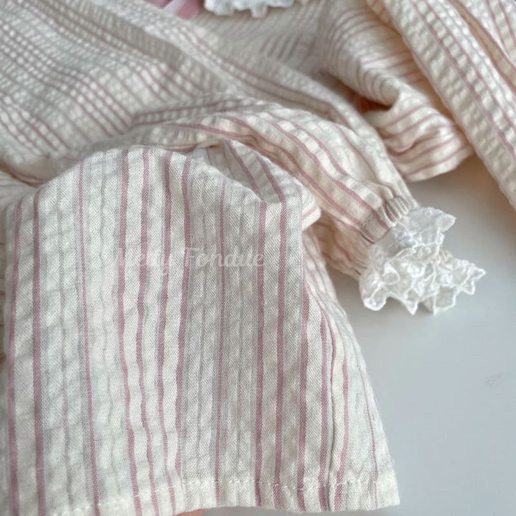・淡いピンクとベージュのストライプ柄で、柔らかく女性らしい印象を与えます。