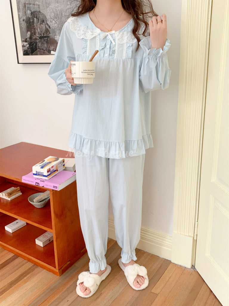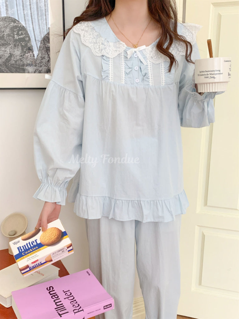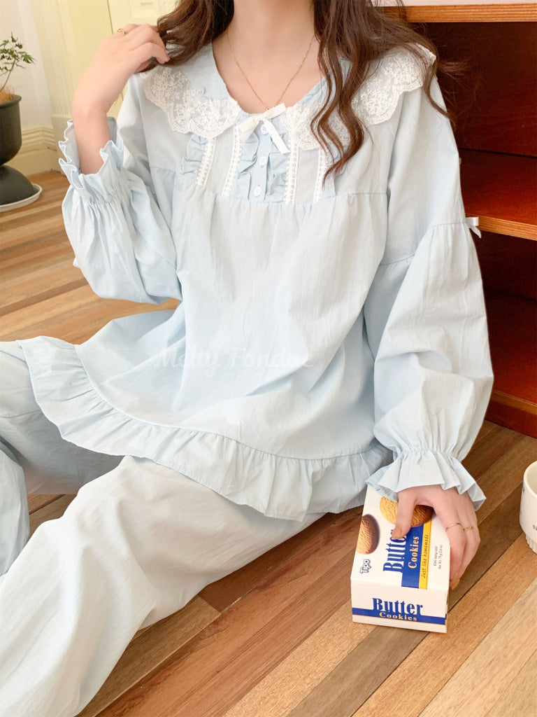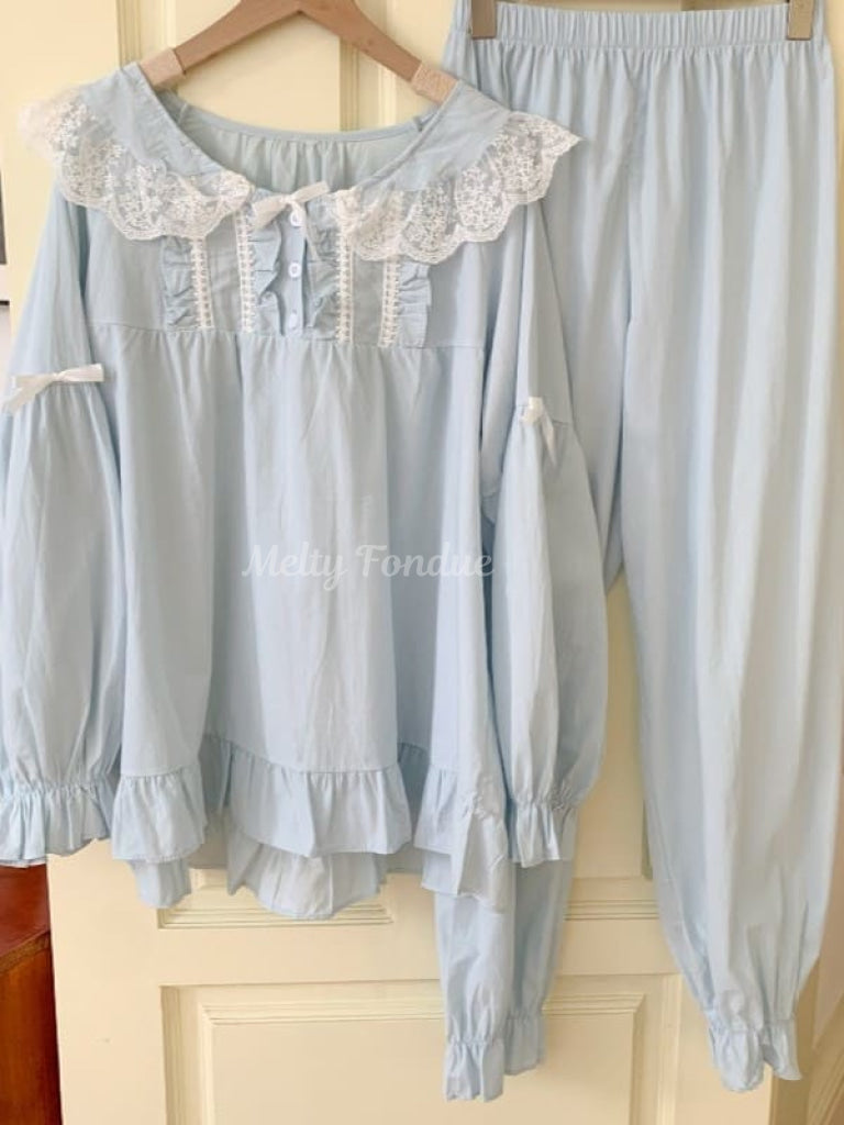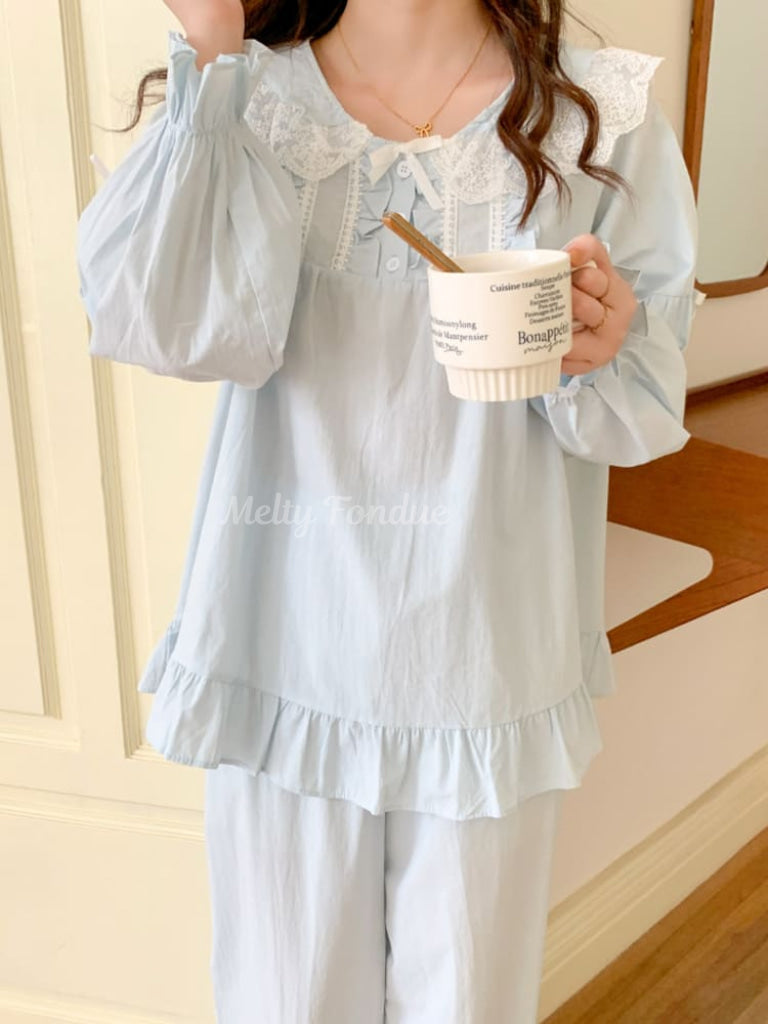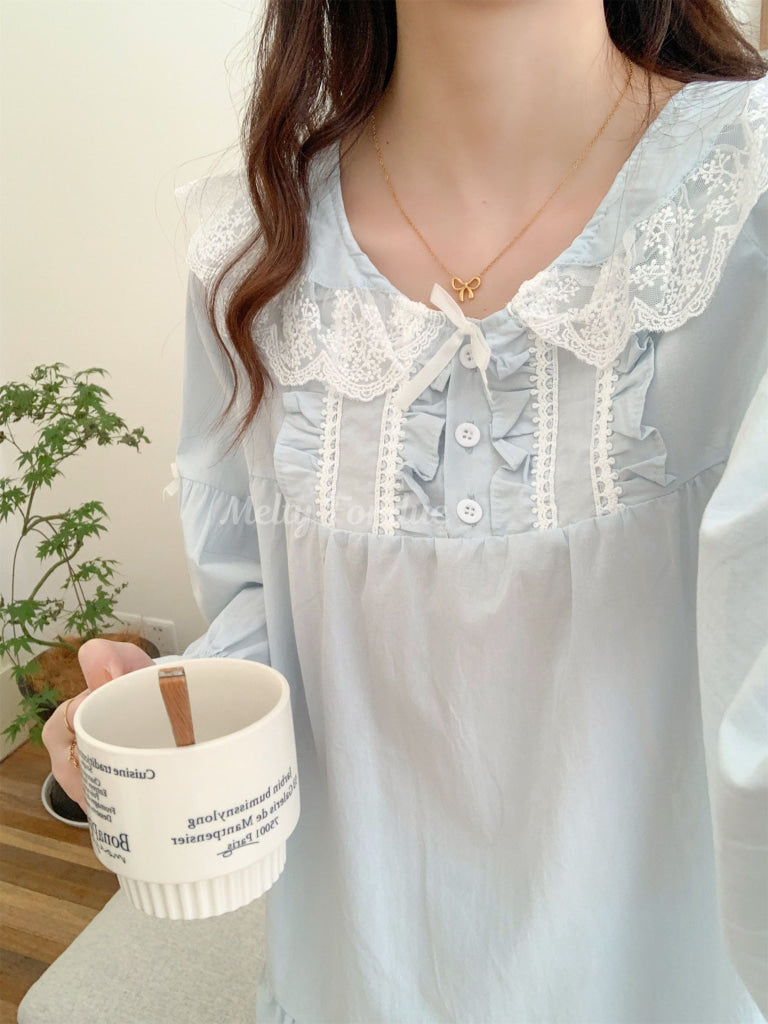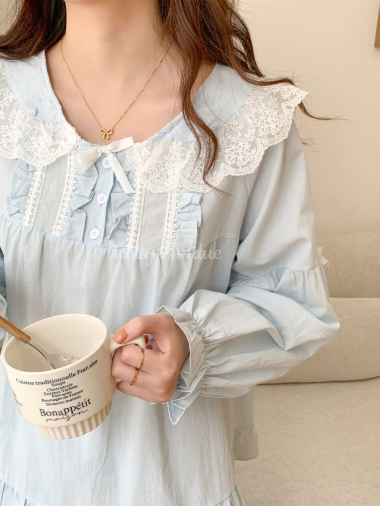 繊細なレース襟とフリルディテールが優雅な雰囲気を醸し出し、パステルブルーが落ち着きと清潔感をプラスします。