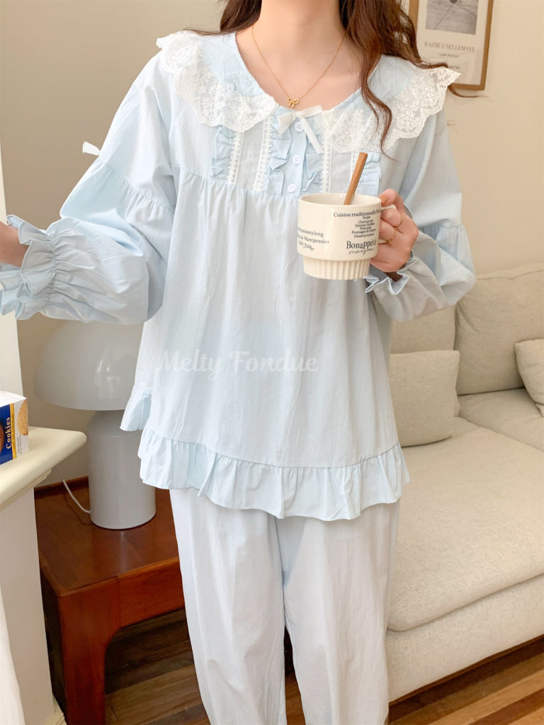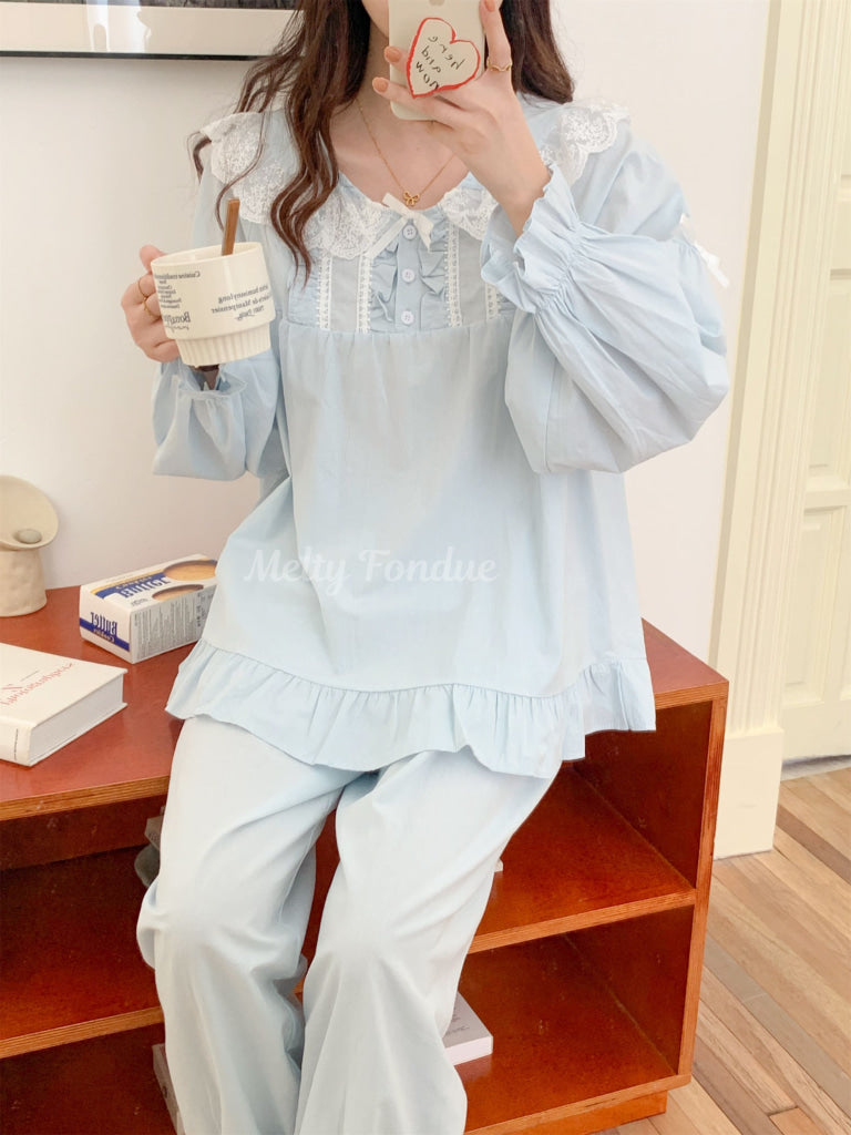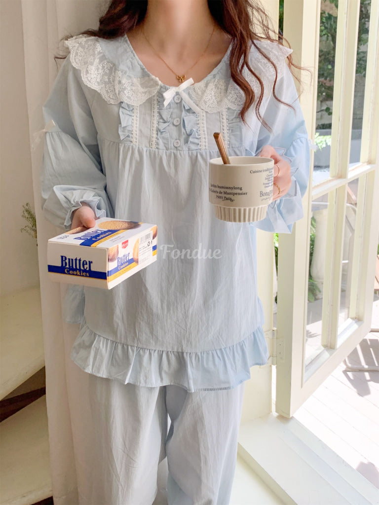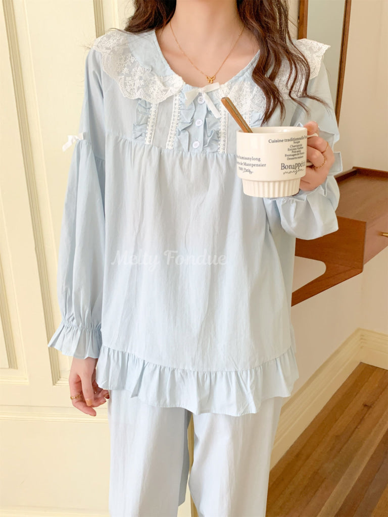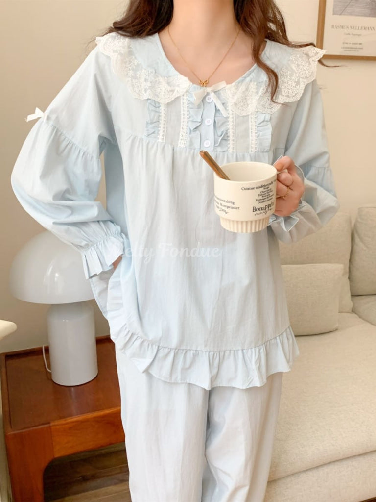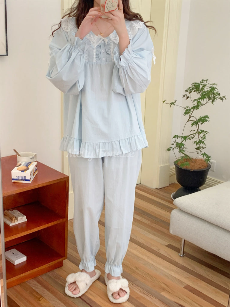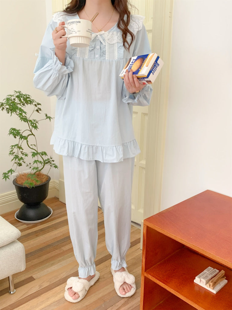 繊細なレース襟とフリルディテールが優雅な雰囲気を醸し出し、パステルブルーが落ち着きと清潔感をプラスします。