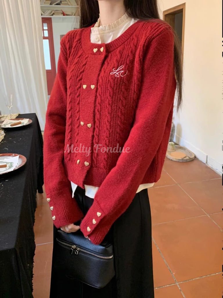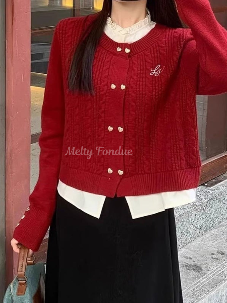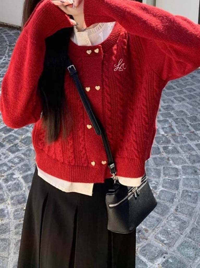 ハート型ボタンとケーブル編みが特徴の、どこか懐かしくも新鮮なトップス。