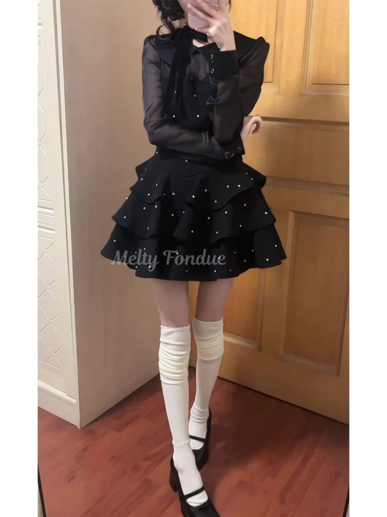 ティアードスカートが動きに華やかさを加え、シアーなスリーブでエレガントなポイントをプラスします。