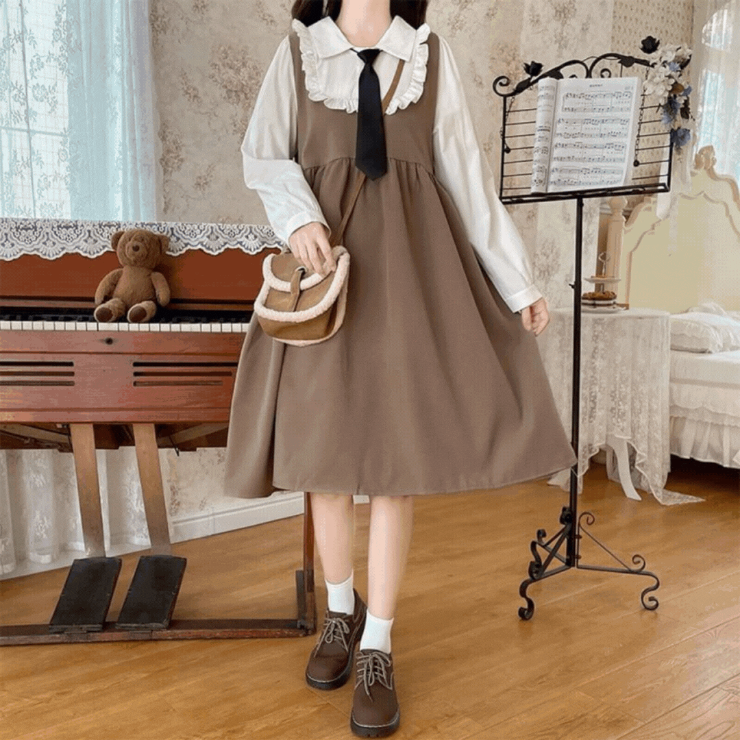 フリル襟とネクタイ風リボンがクラシカルな印象を与える、品のあるジャンパースカート風ワンピース
