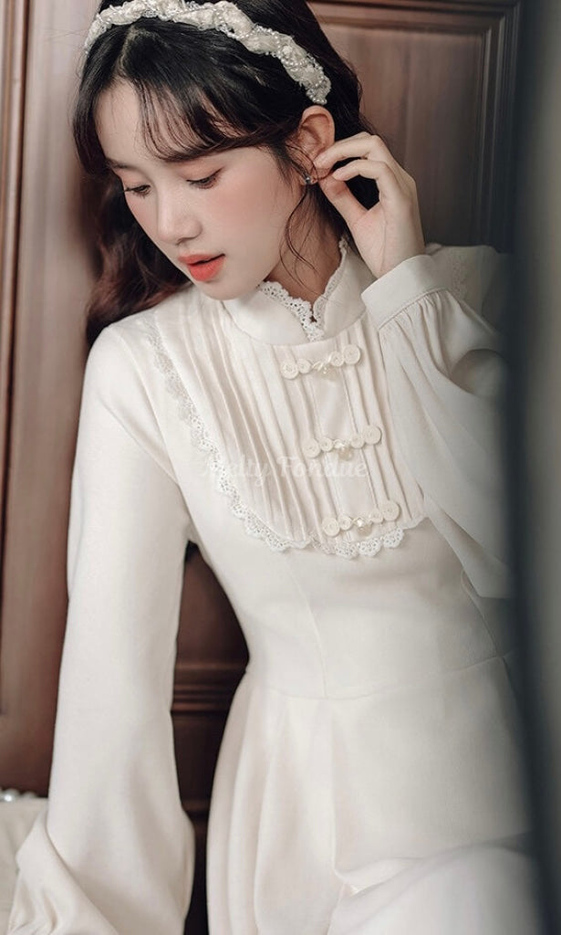 ・首周りはきゅっと詰まったデザイン。 細かいレースが可愛いらしい印象に。