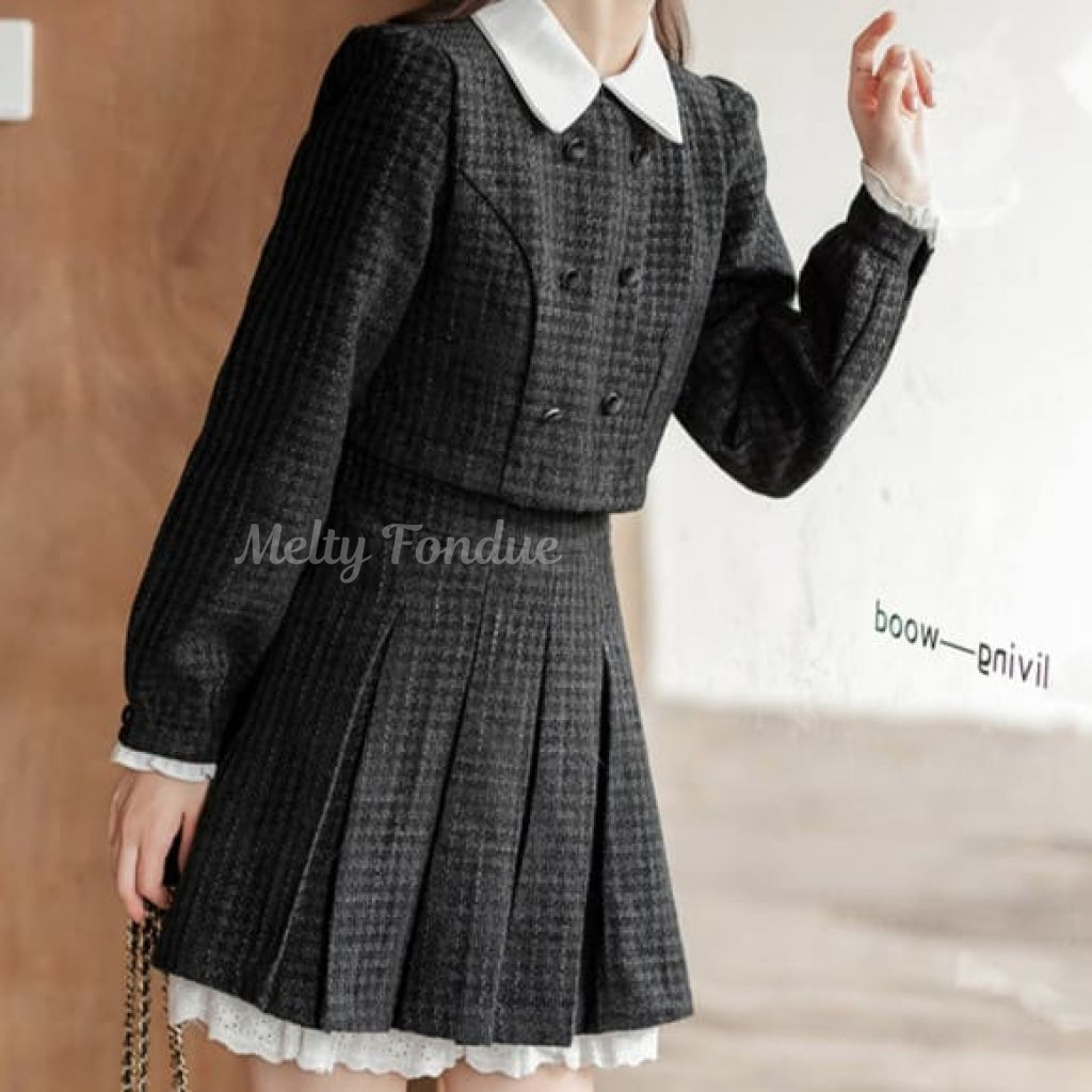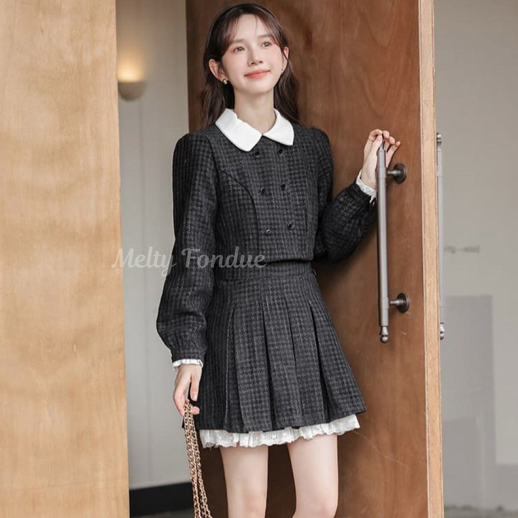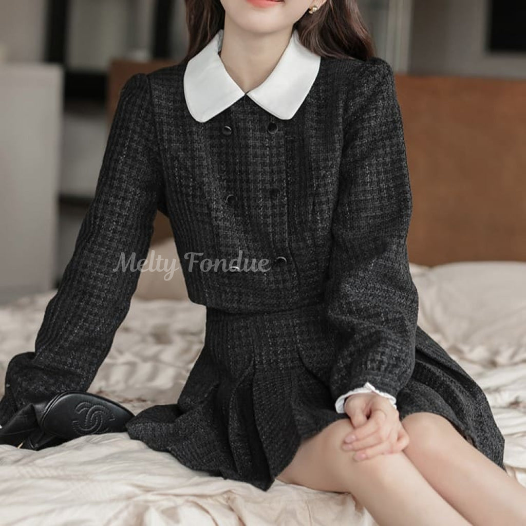 ダブルボタンがクラシカルな雰囲気を作り、スカートのプリーツデザインが動きやすさをプラス。