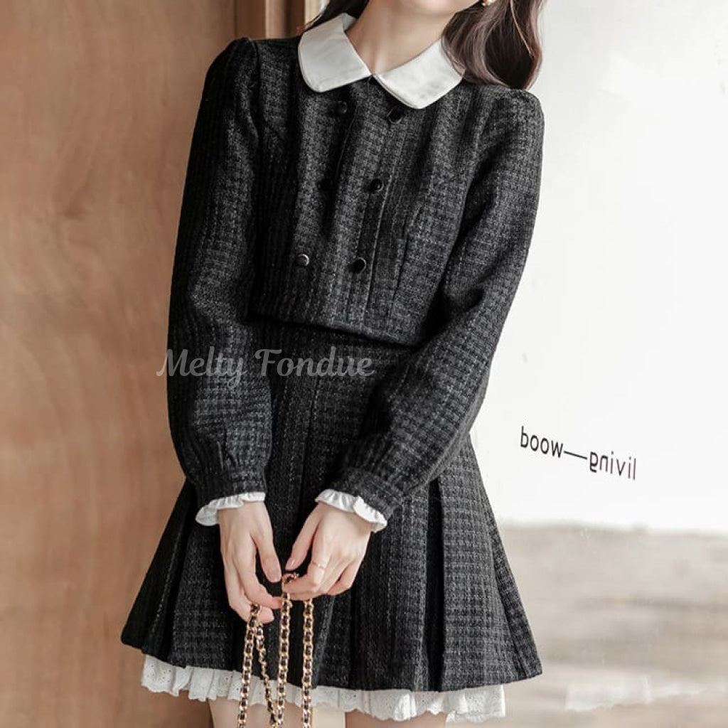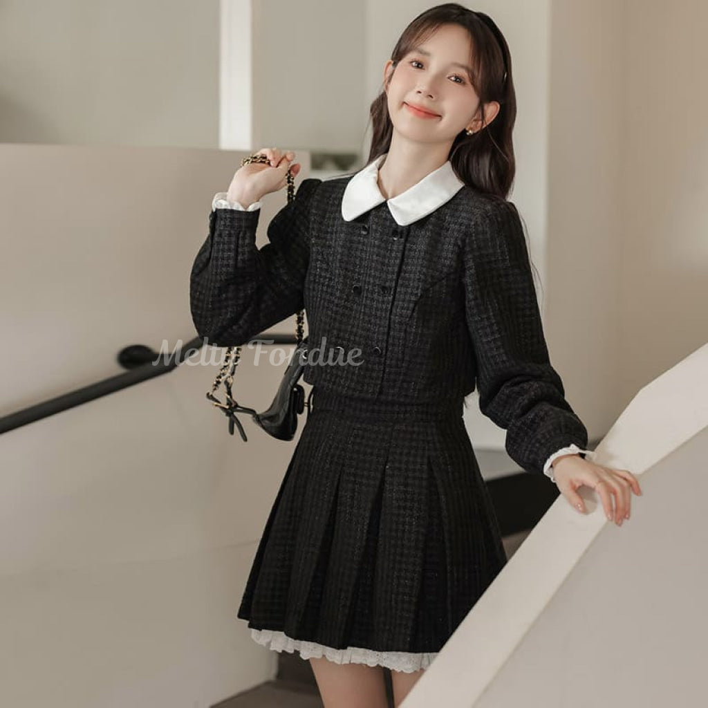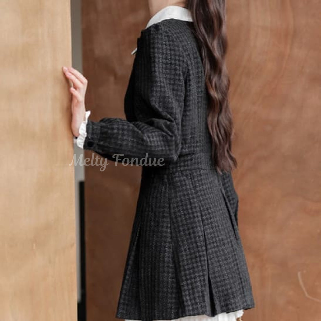 ダブルボタンがクラシカルな雰囲気を作り、スカートのプリーツデザインが動きやすさをプラス。
