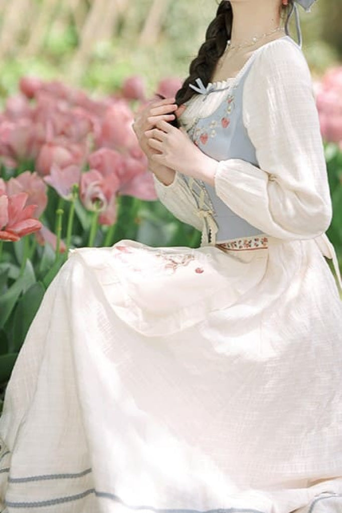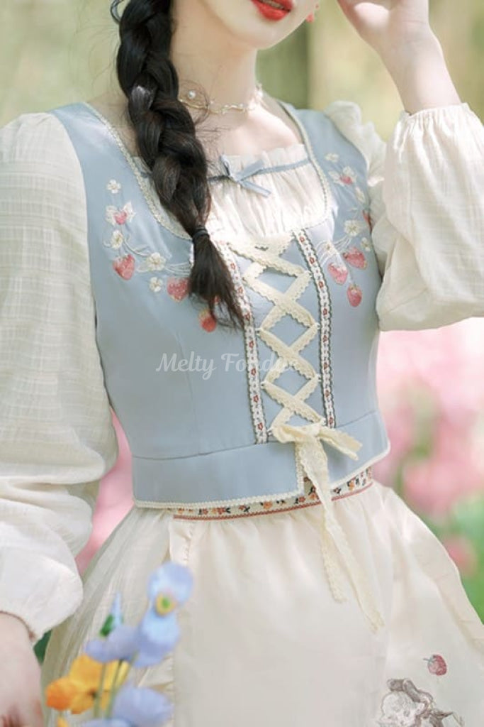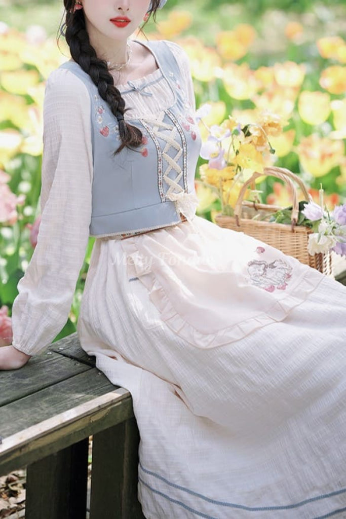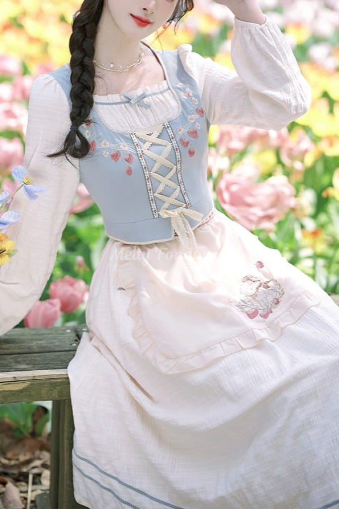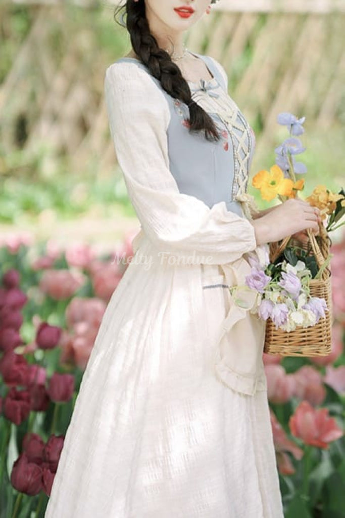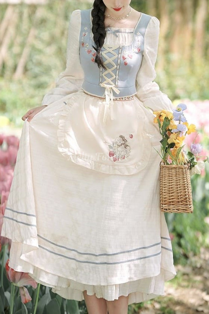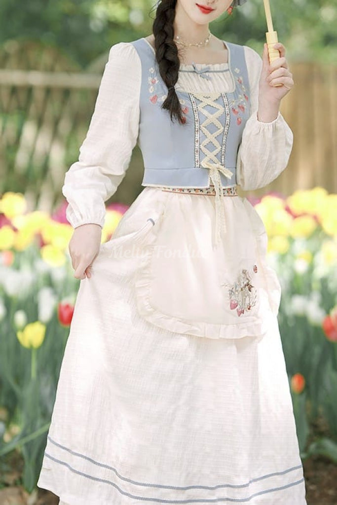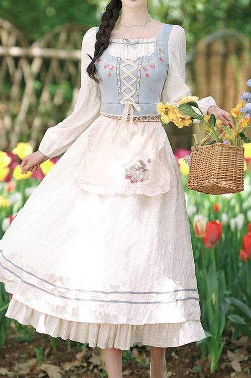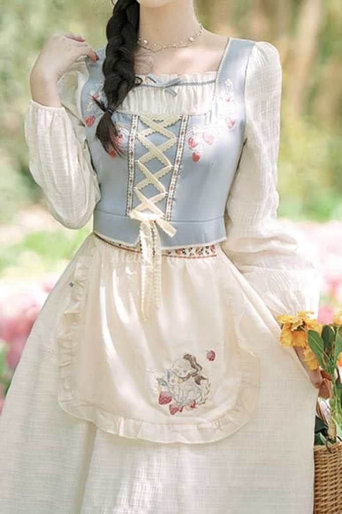 レースアップディテールやエプロンがガーリーな魅力を引き立て、ふんわりとしたスカートが優美なシルエットを作り出します。