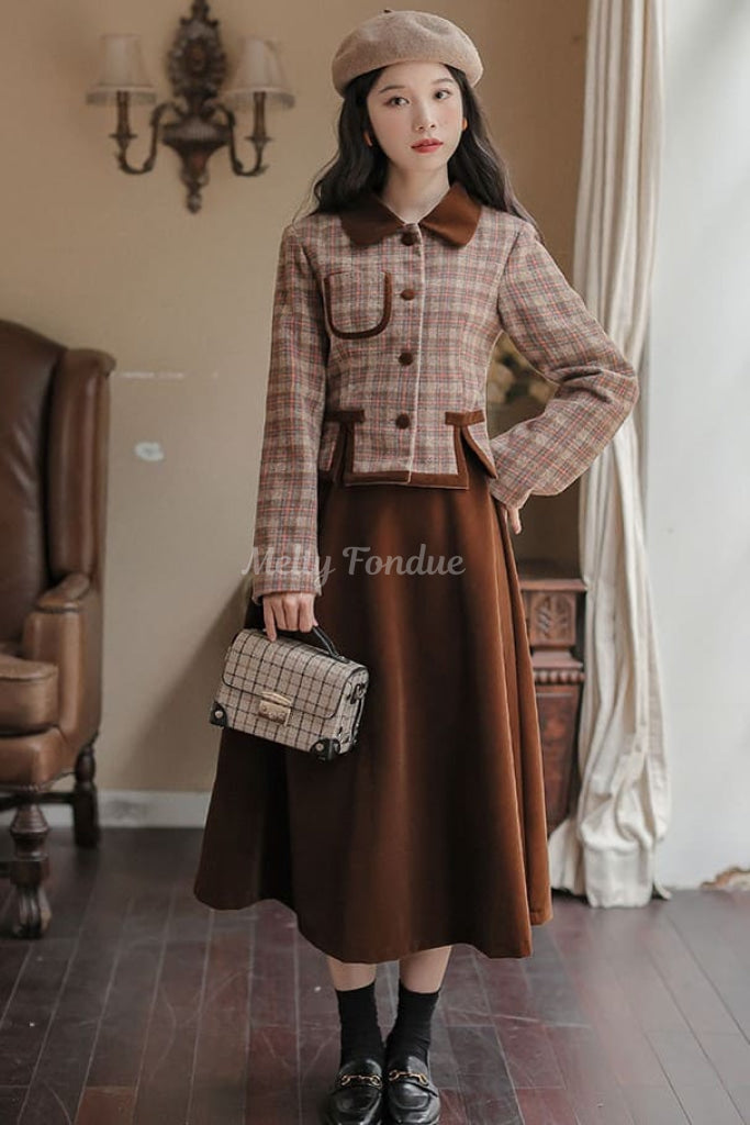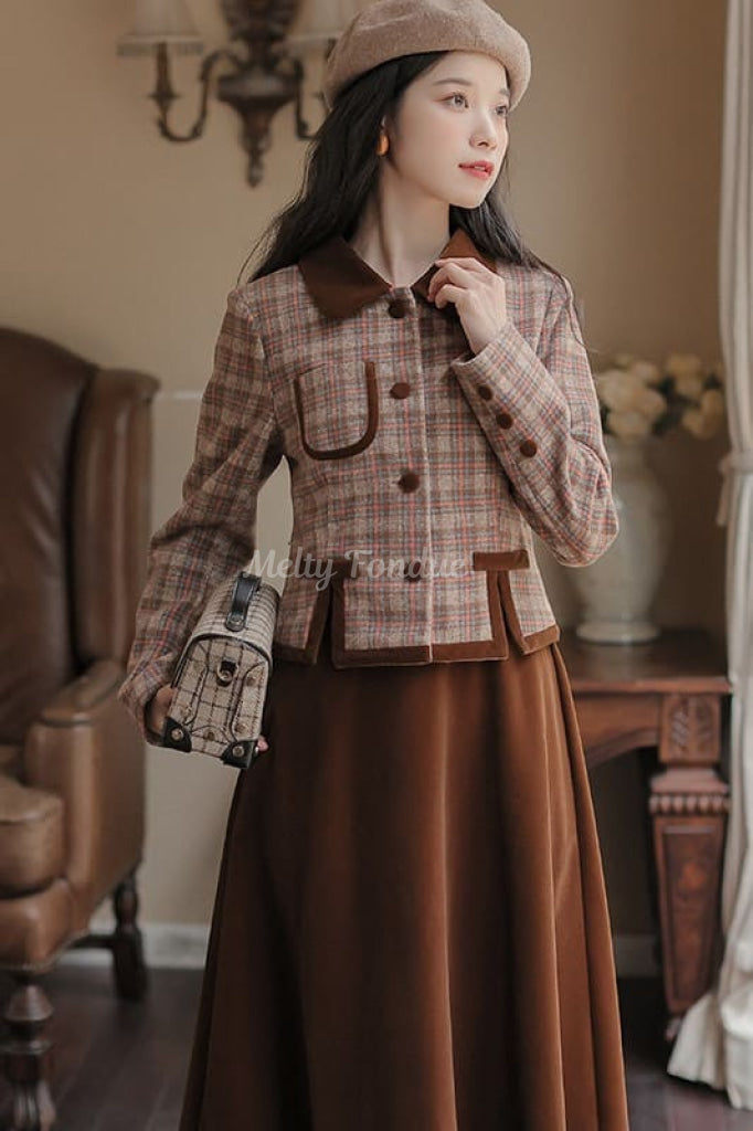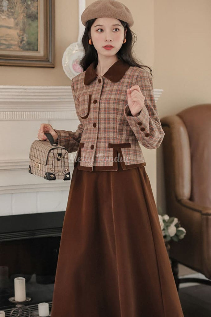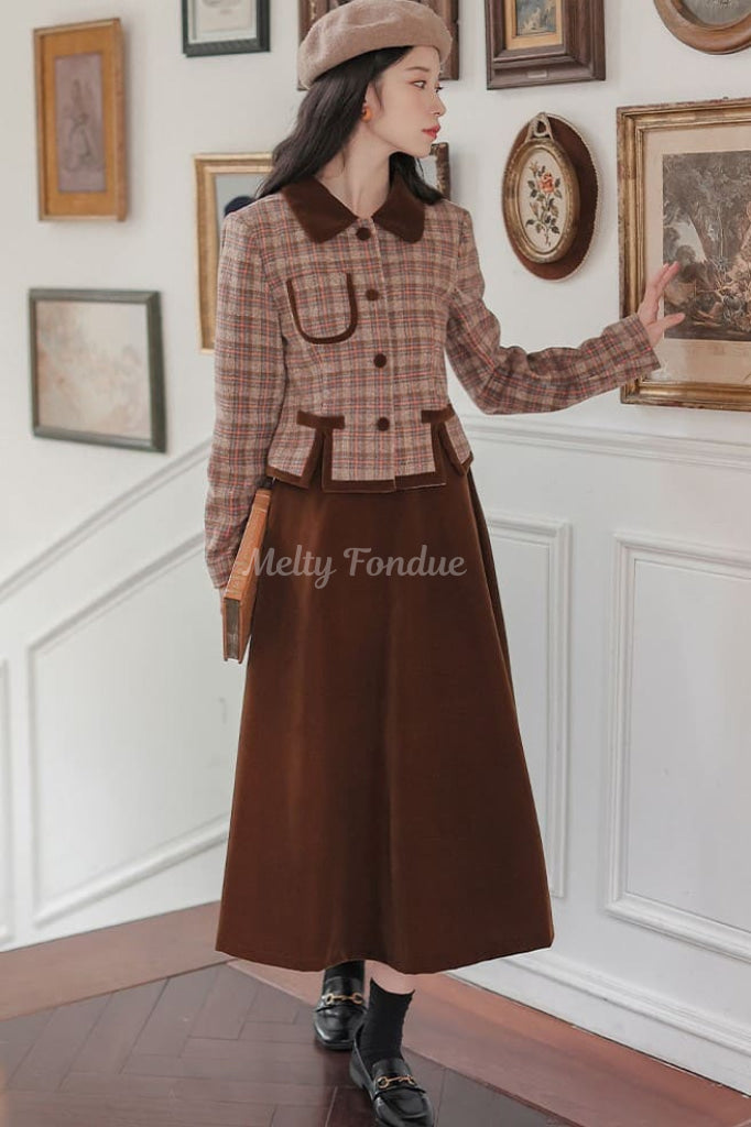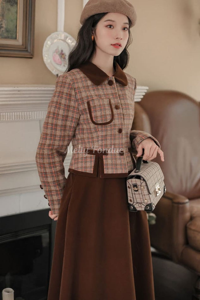 クラシカルなチェック柄と深みのあるブラウンのスカートが美しいセットアップ
