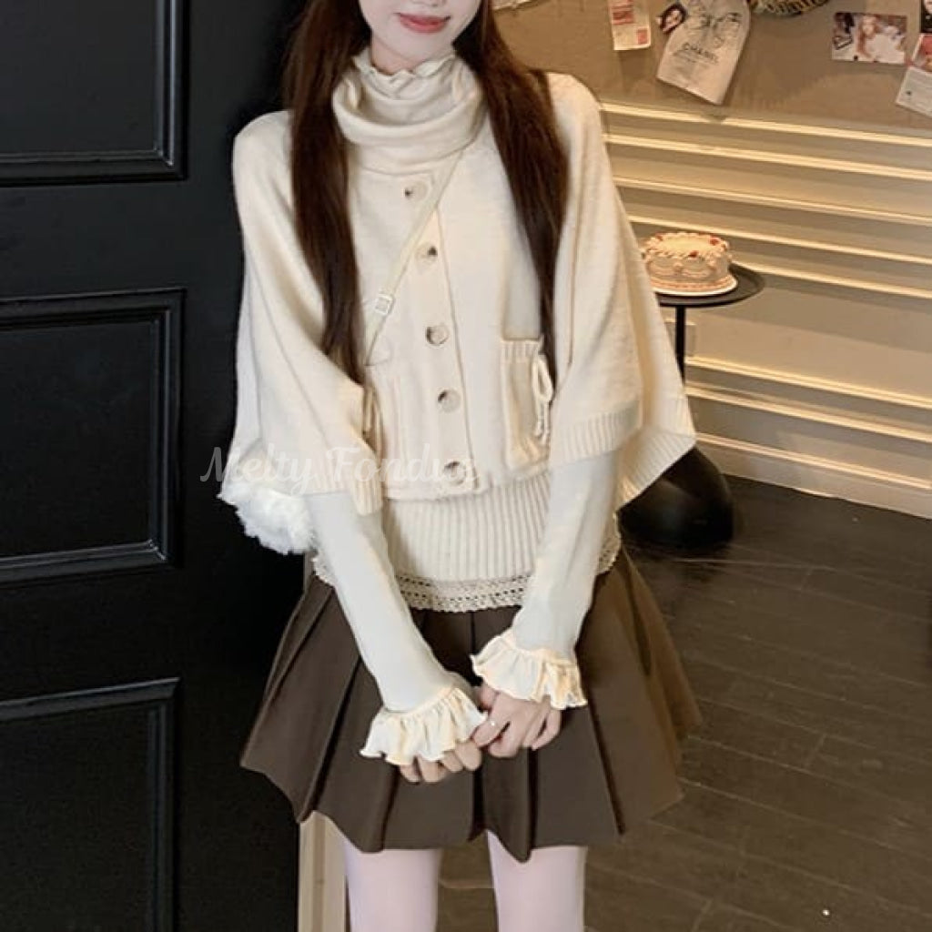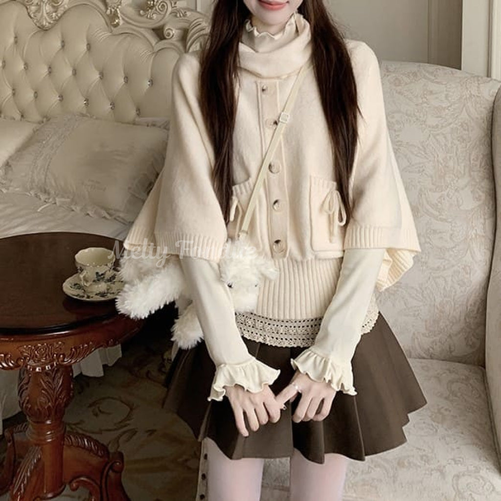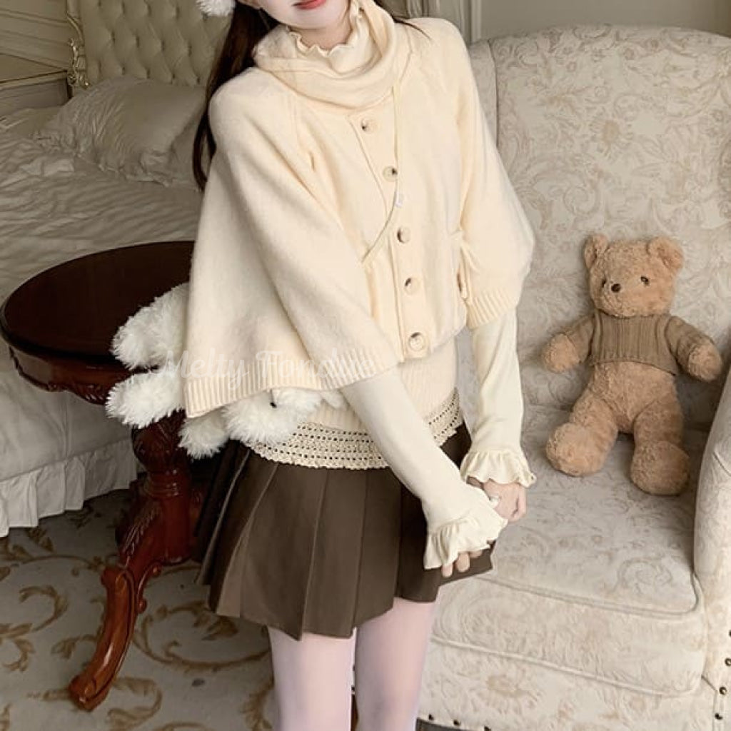 ・ボタンディテールとフリルレースがフェミニンさを引き立てるケープ風トップス。