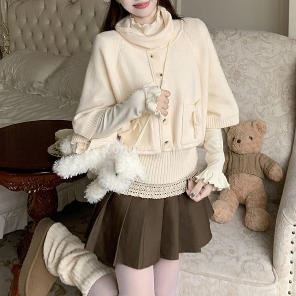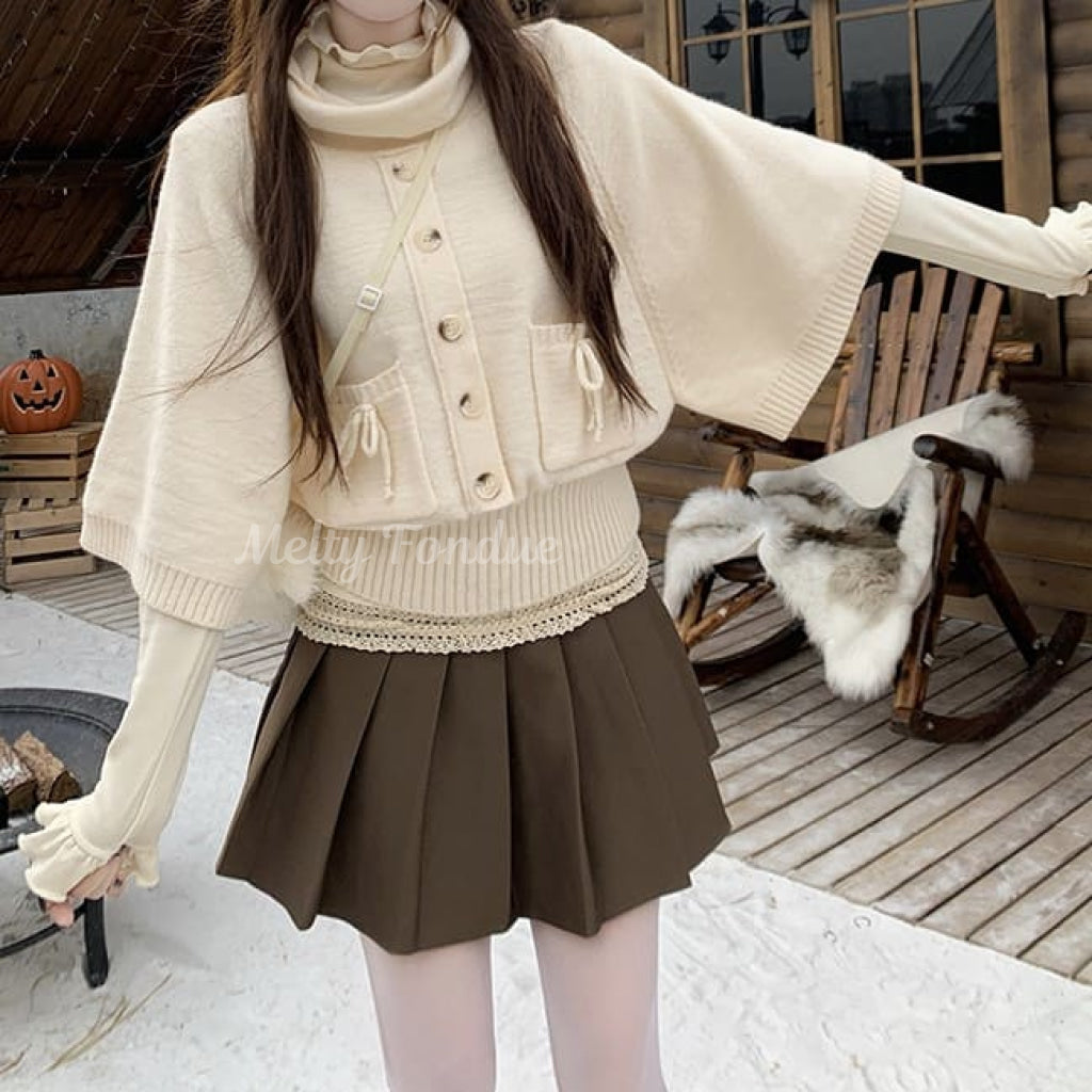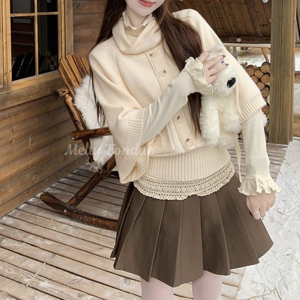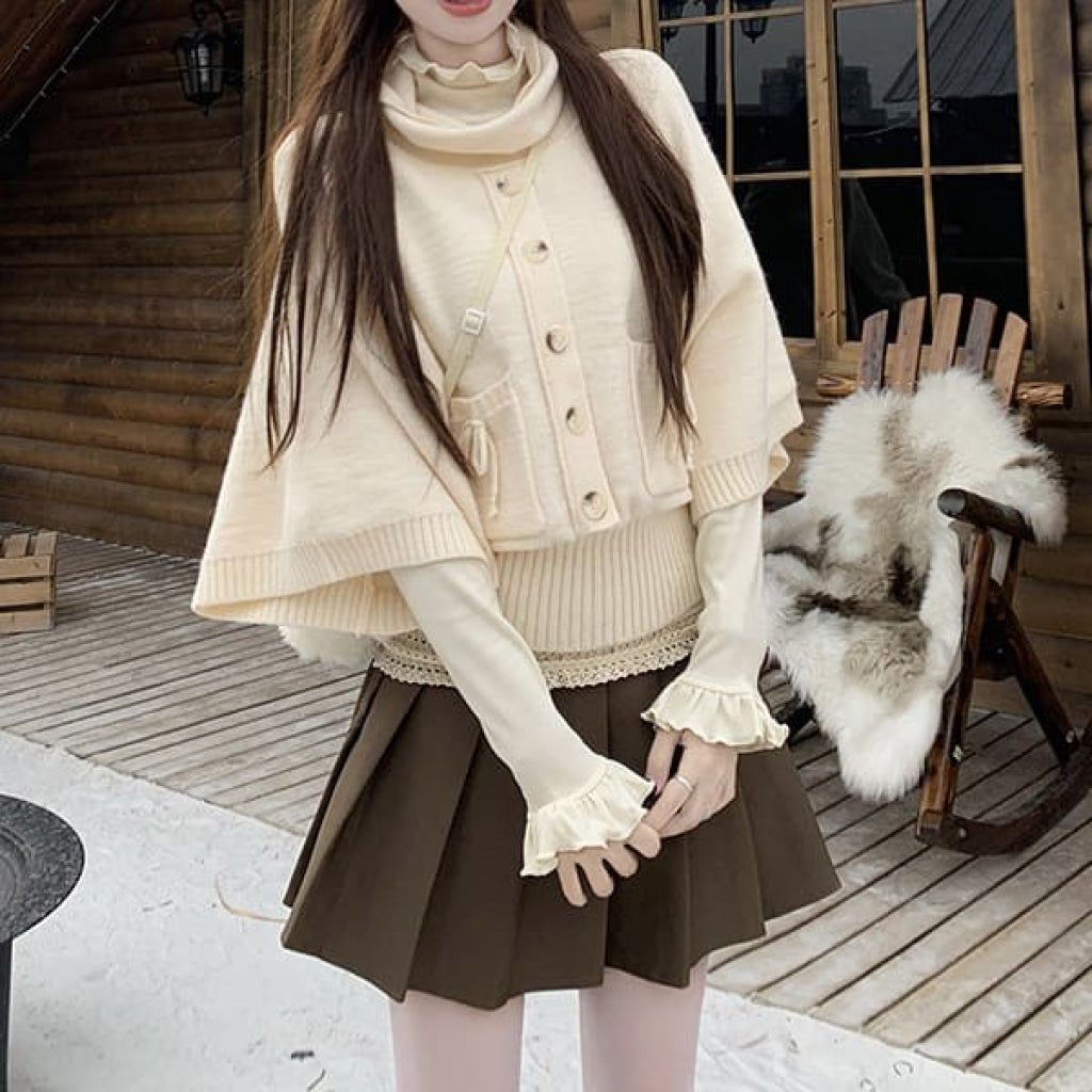 ・ボタンディテールとフリルレースがフェミニンさを引き立てるケープ風トップス。