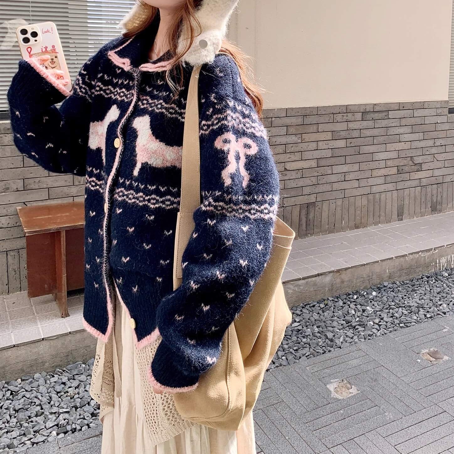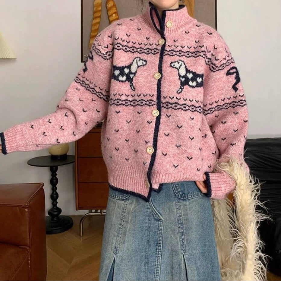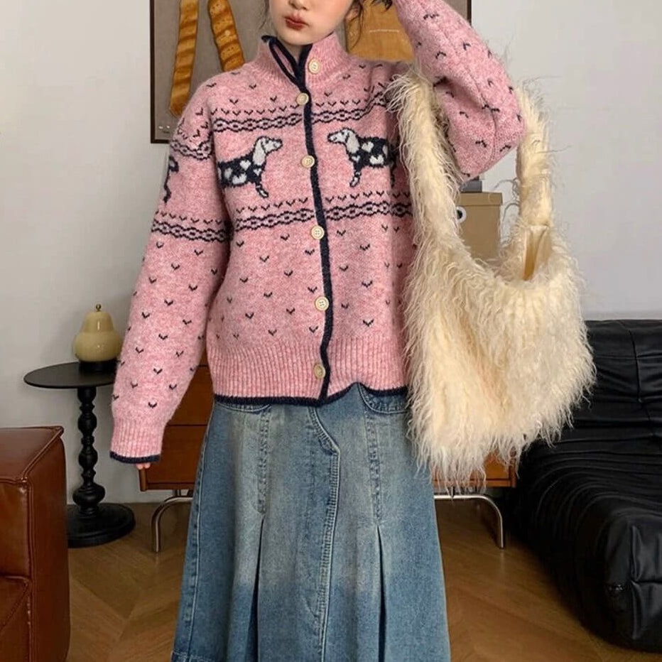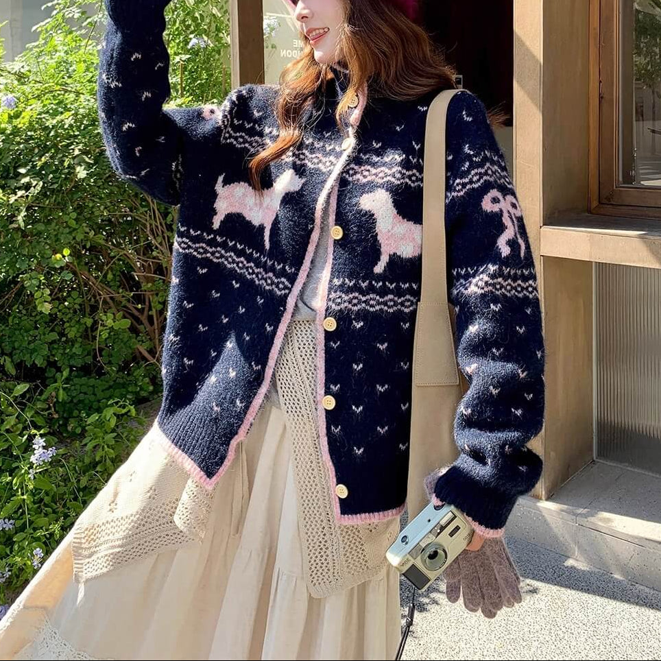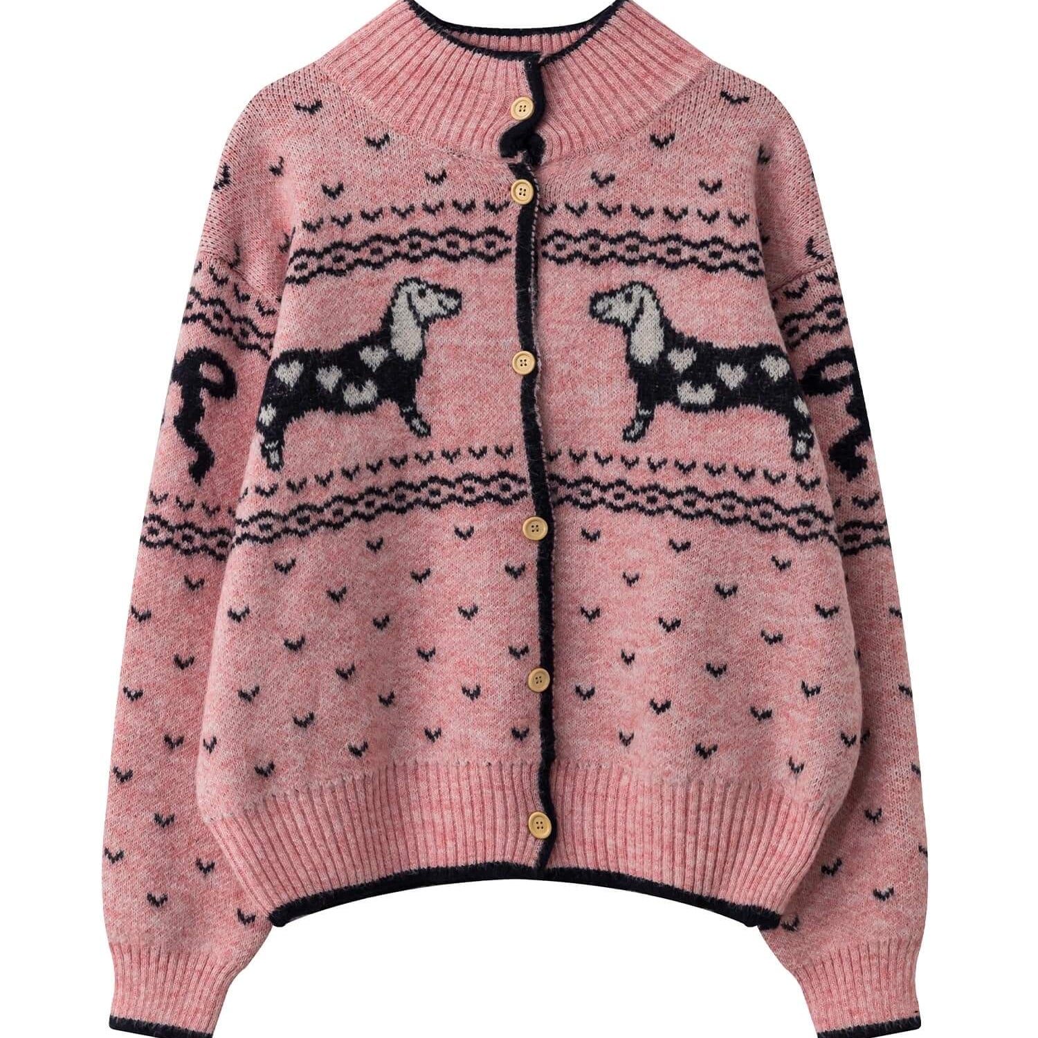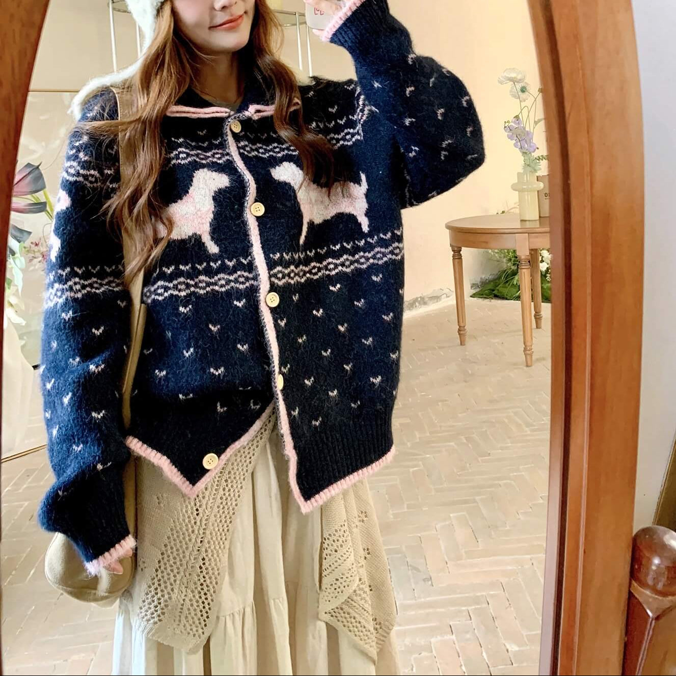 冬らしさ溢れるデザインとのわんこモチーフが愛らしい、主役級ふわもこカーディガン