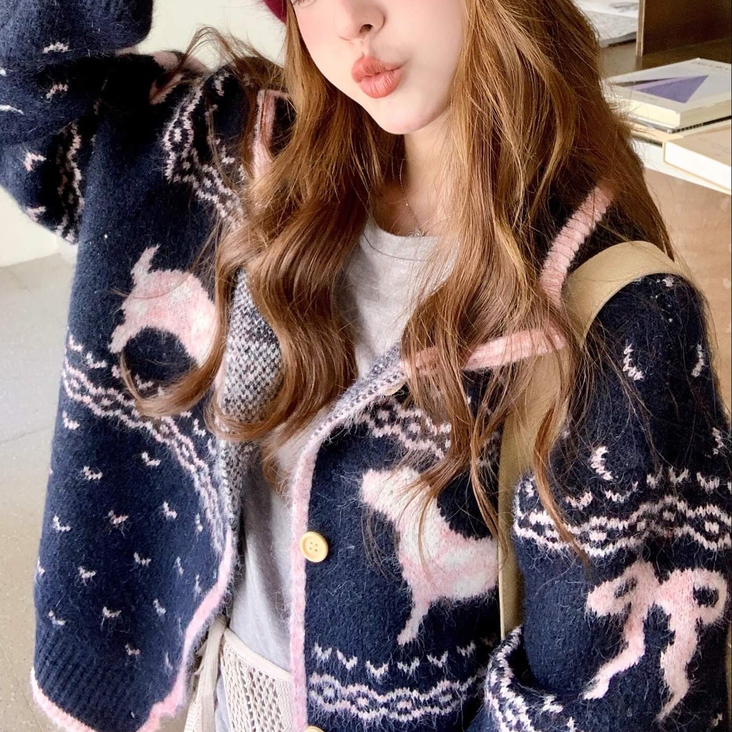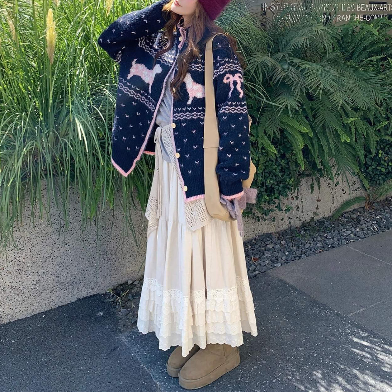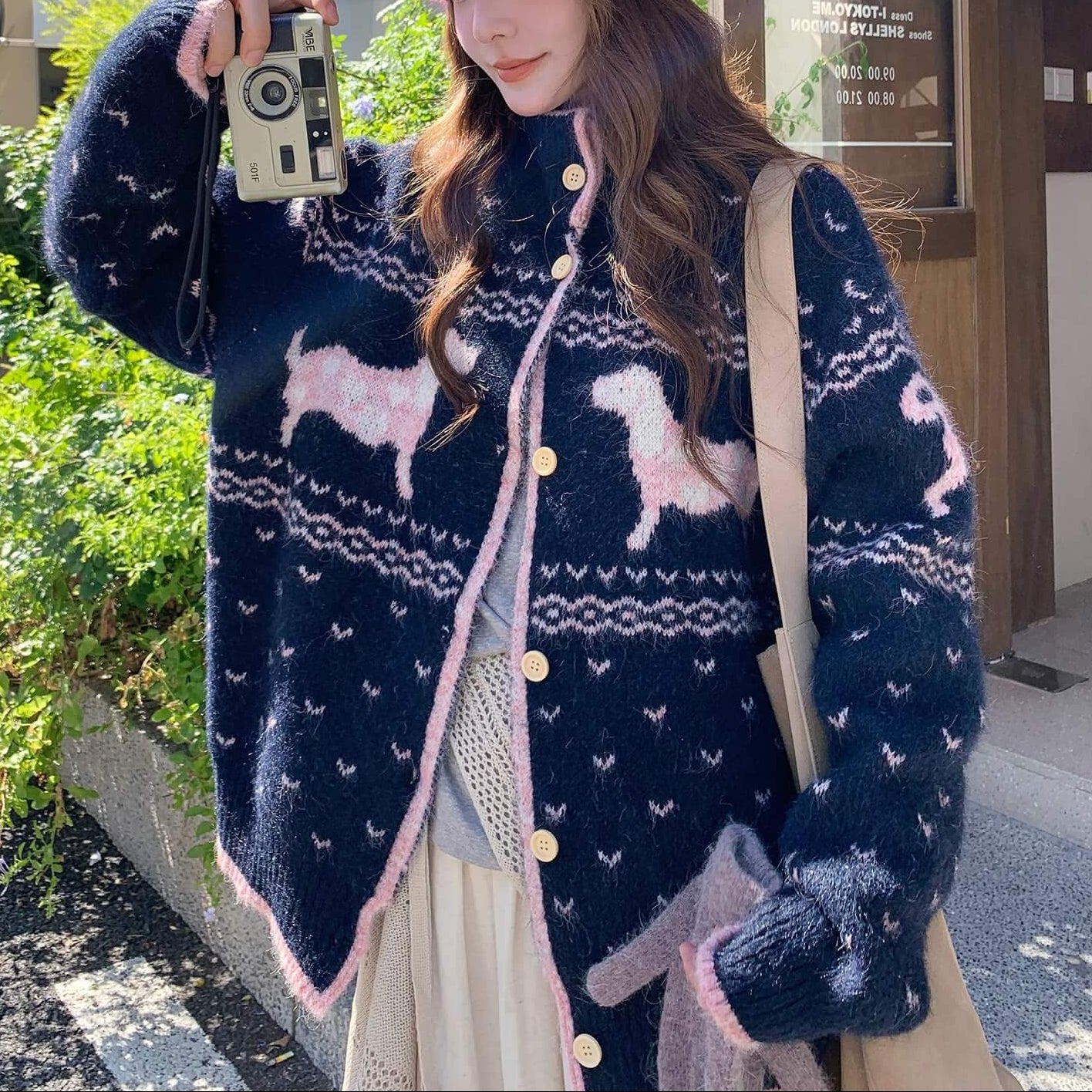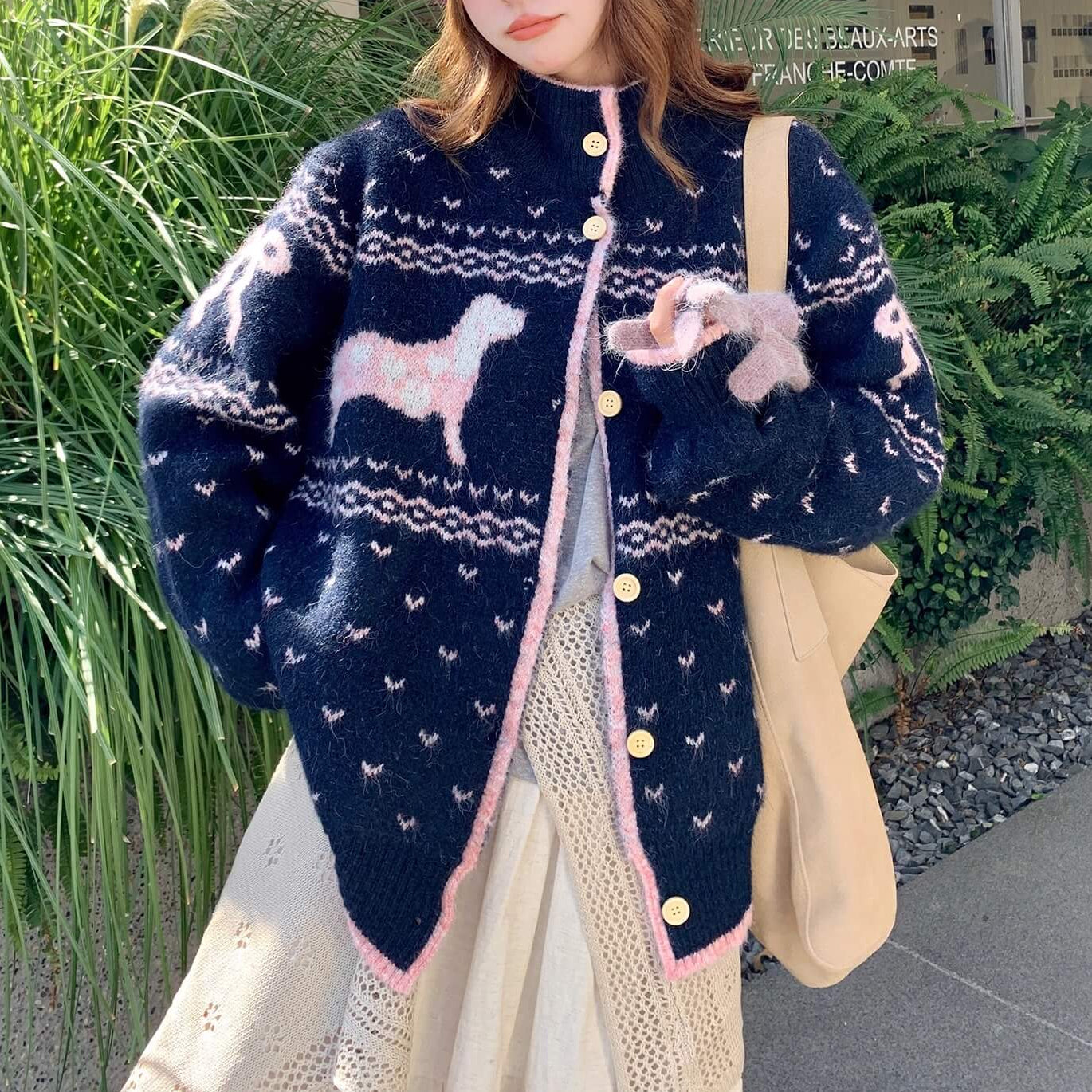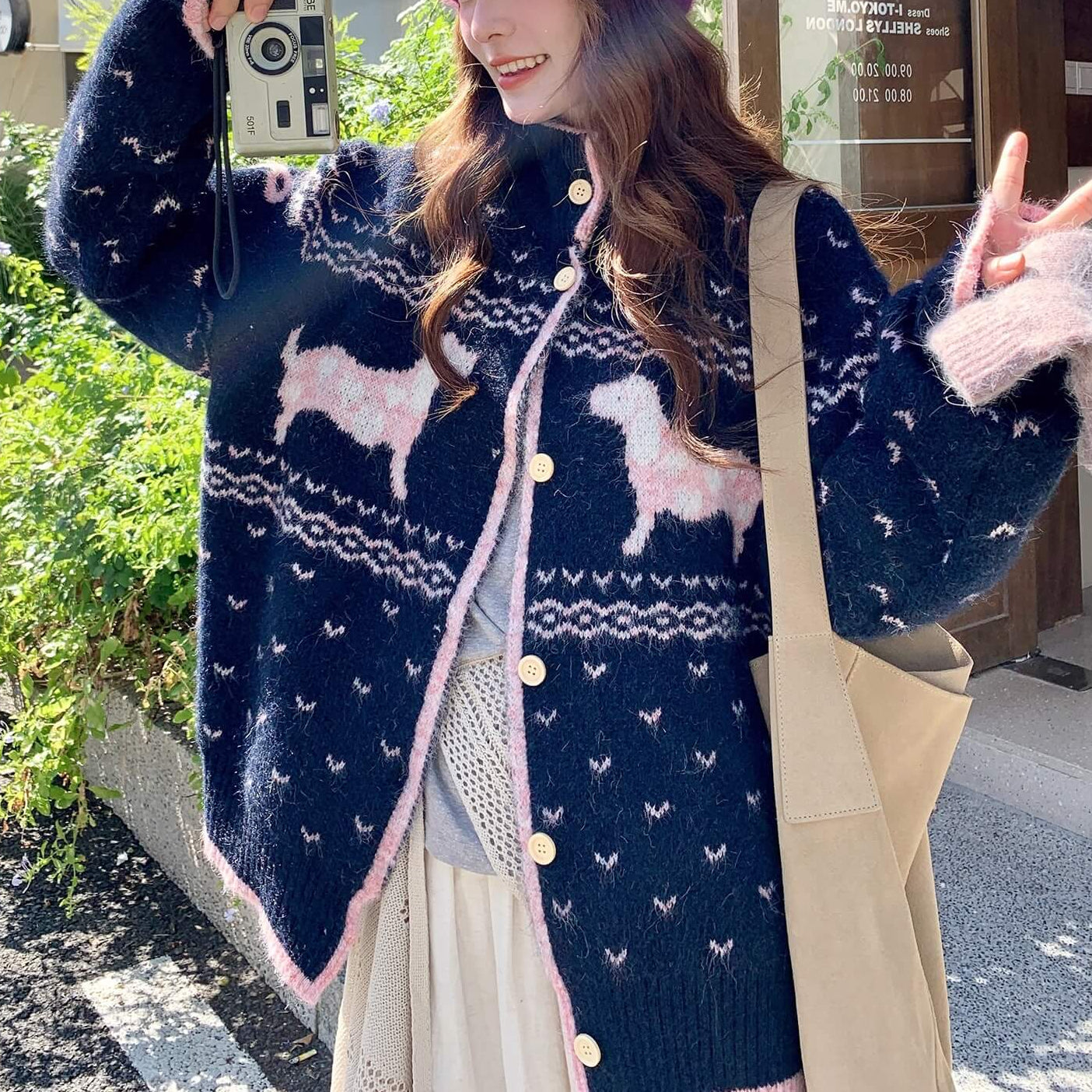 冬らしさ溢れるデザインとのわんこモチーフが愛らしい、主役級ふわもこカーディガン