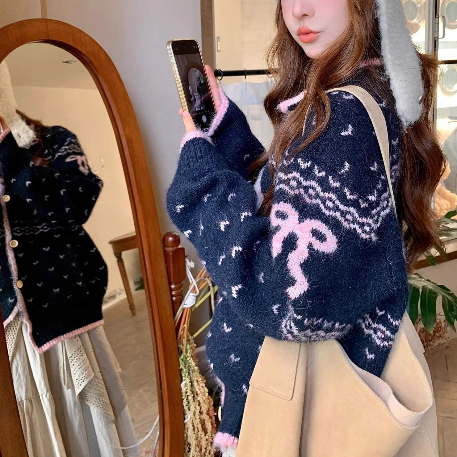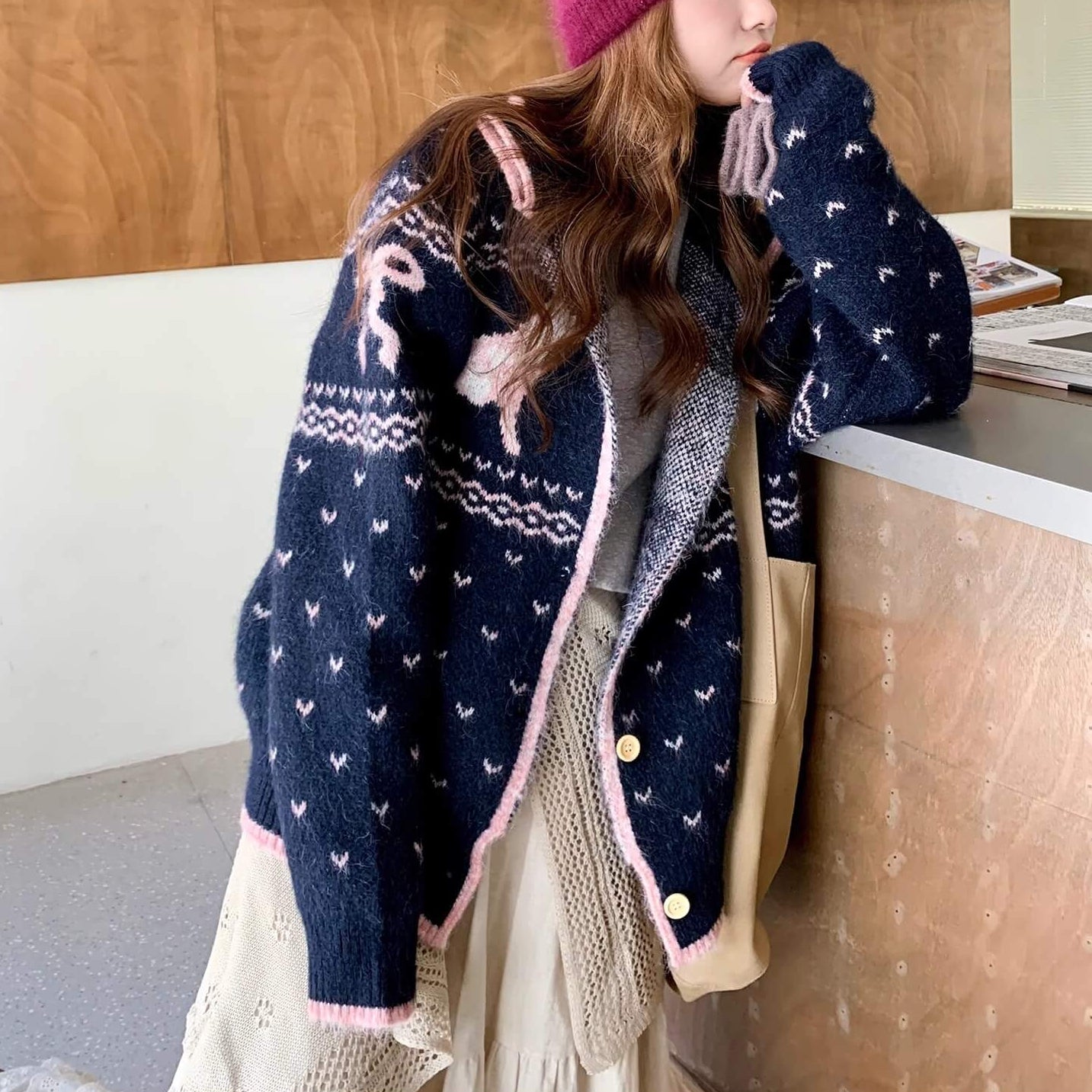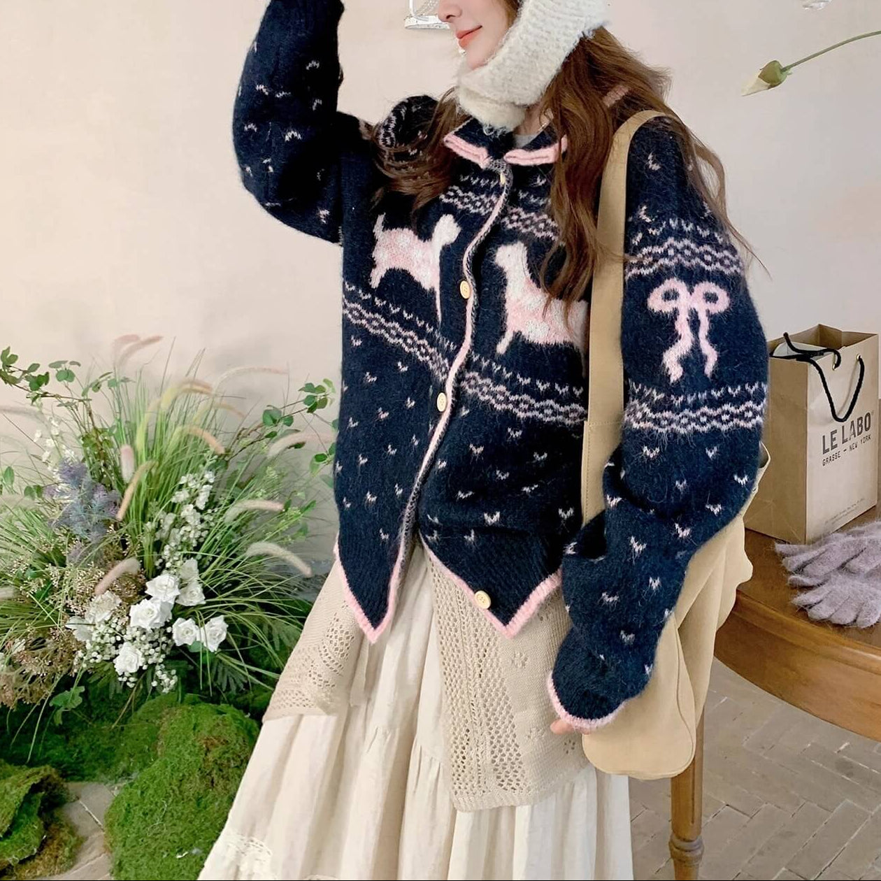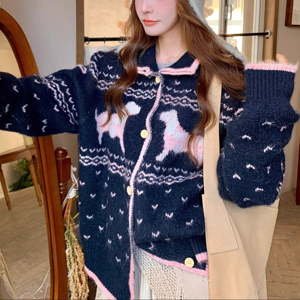 《癒しの冬ニット》でリボンと仔犬のメロディカーディガン(全2色)