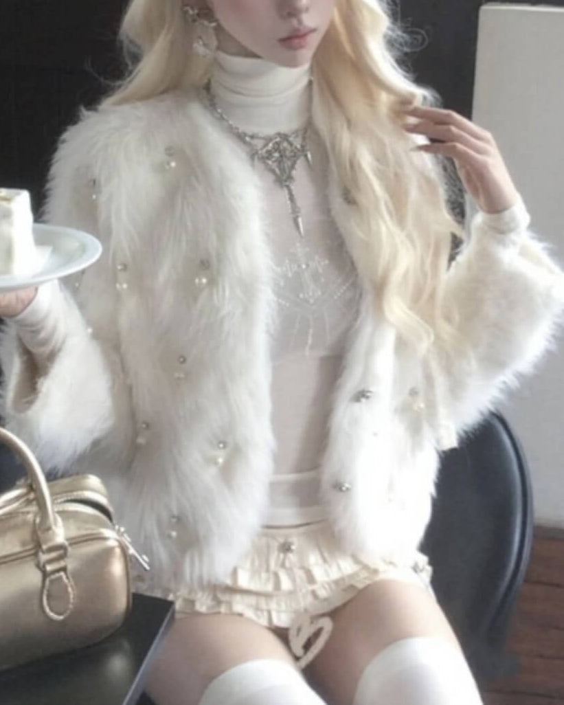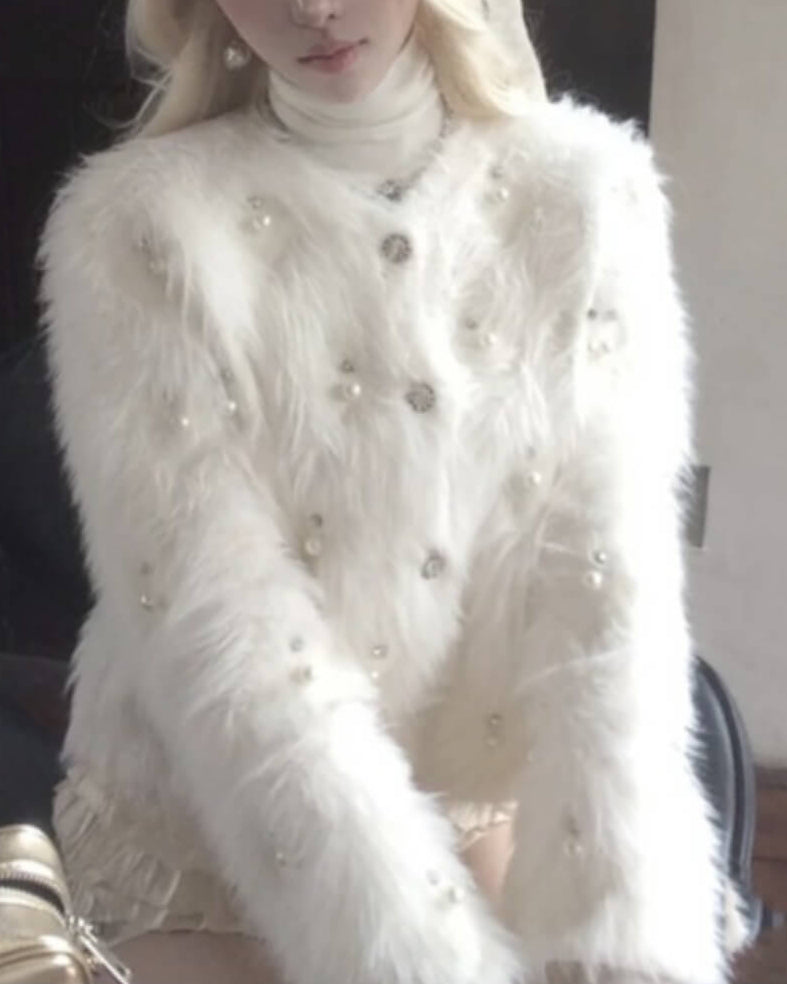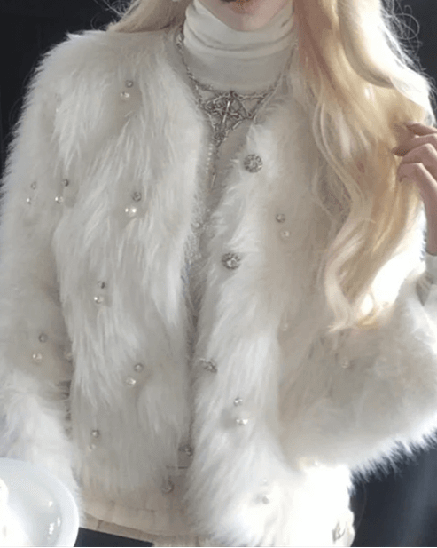 ビジューが輝く、ふんわり上品なホワイトファーコート。