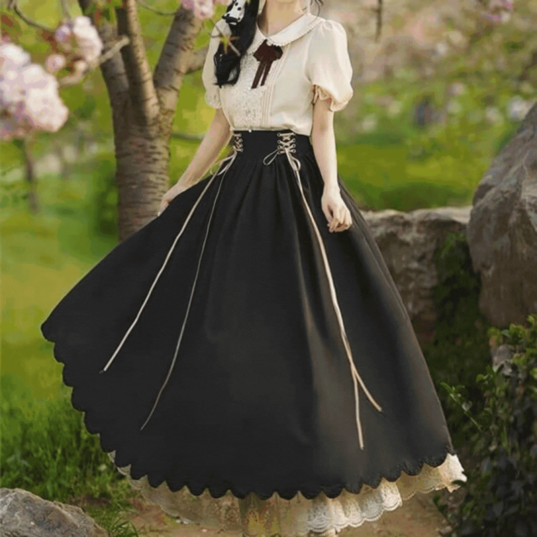 ・腰元の編み上げリボンと、スカートに伸びていくリボンは動く度にひらひらと動いて心躍るアイテムに。