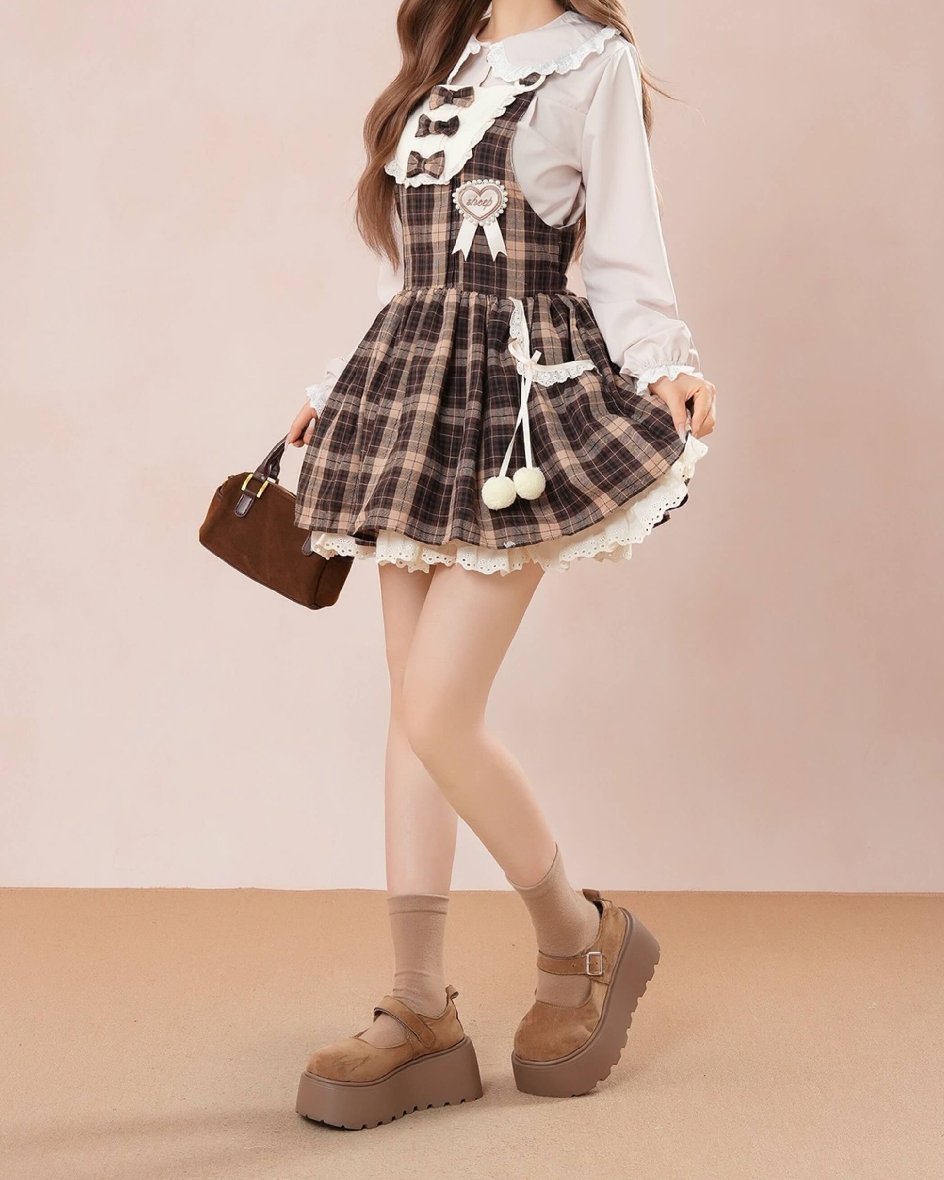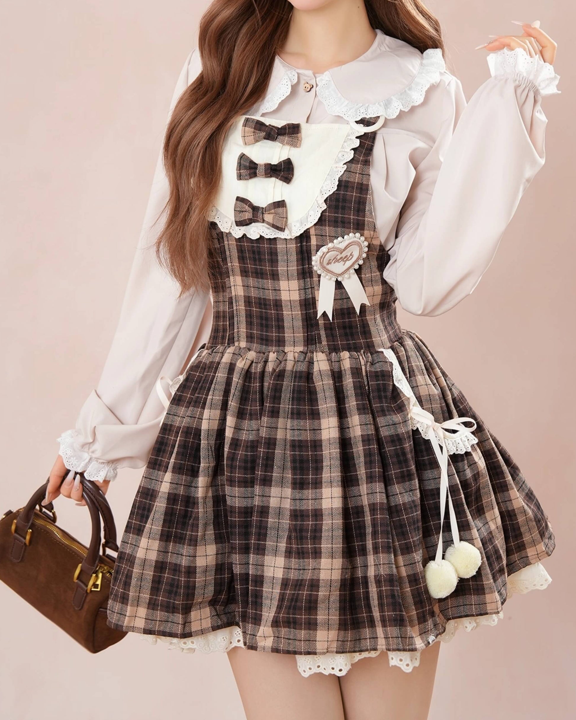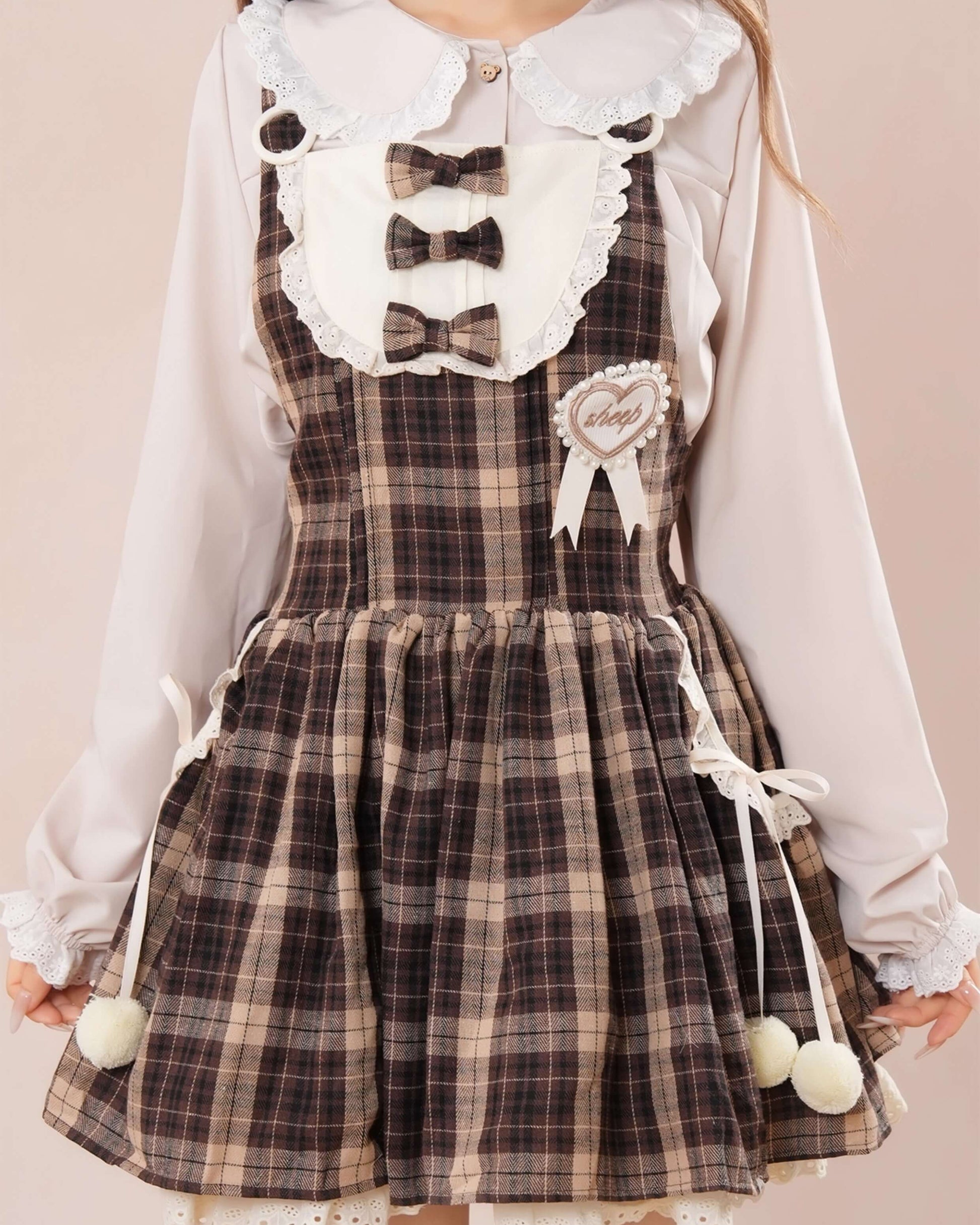 ブラウンのチェックが可憐に揺れる、ガーリーブラウス&ジャンパースカートの2点セット