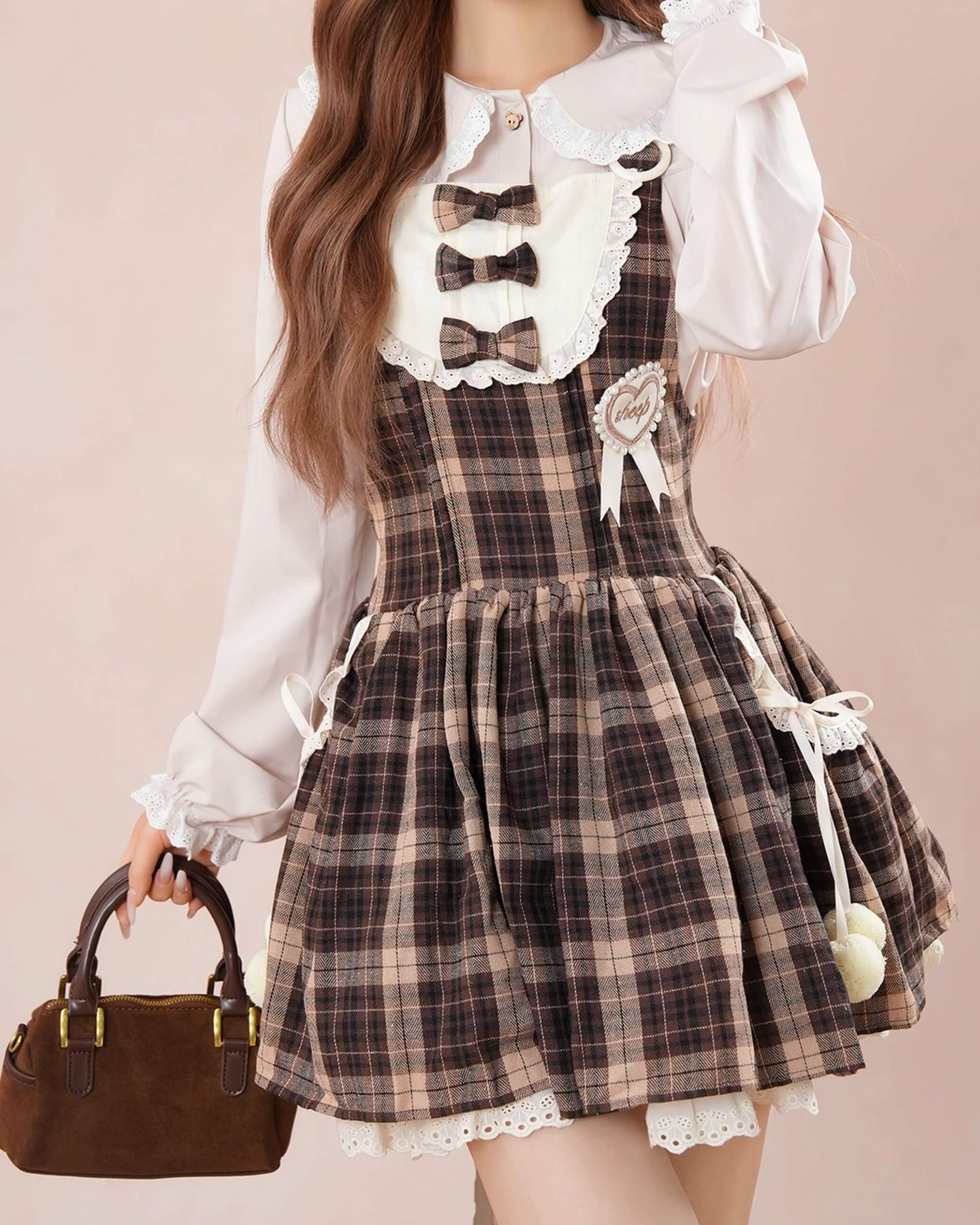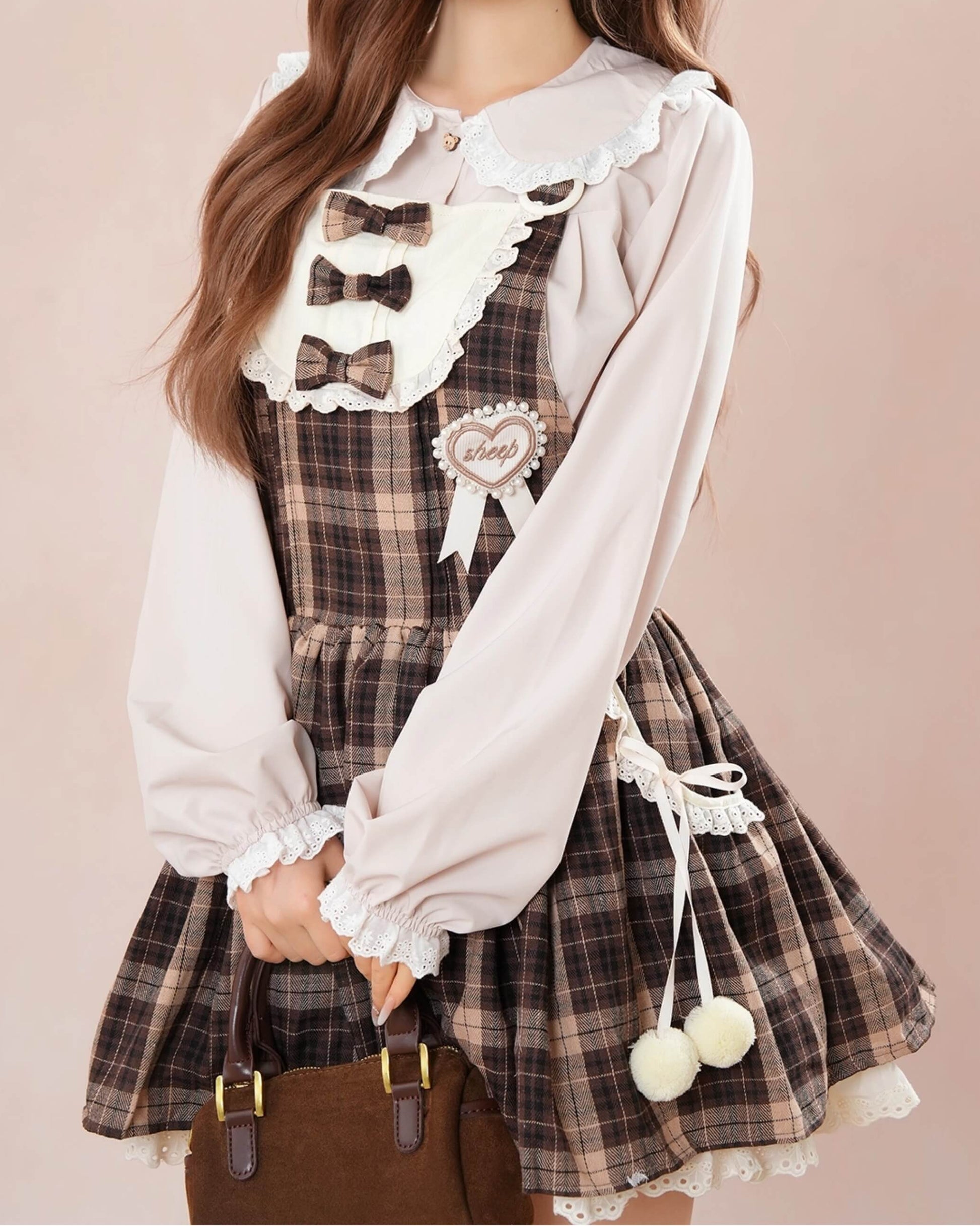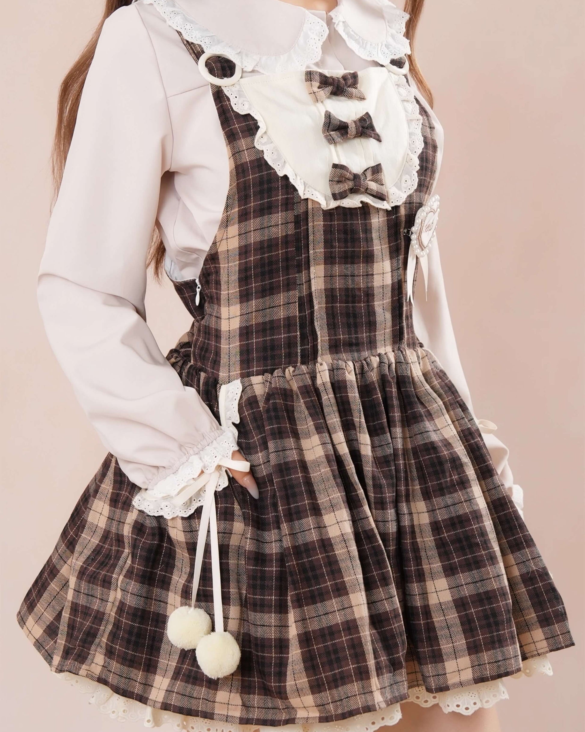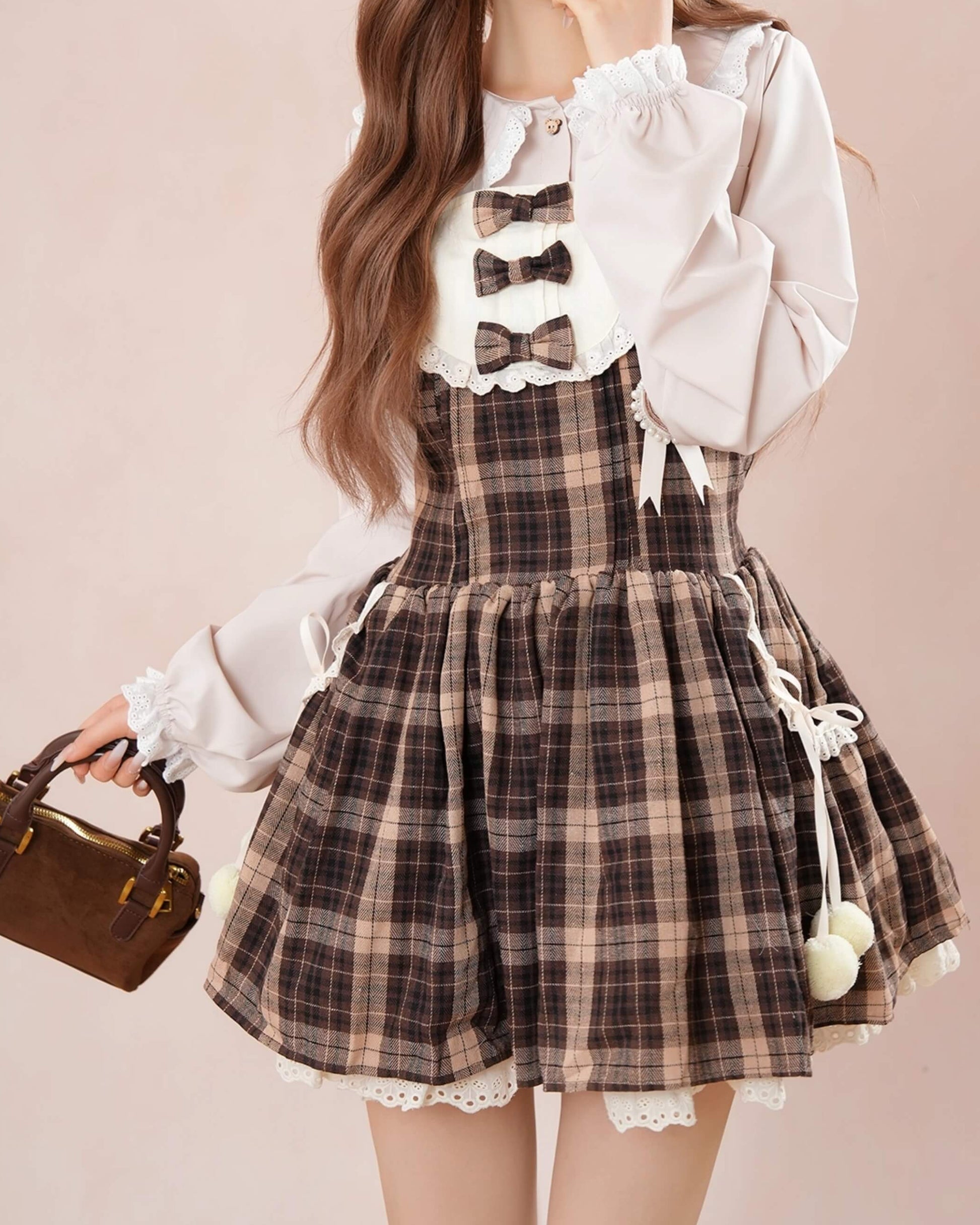 ブラウンのチェックが可憐に揺れる、ガーリーブラウス&ジャンパースカートの2点セット