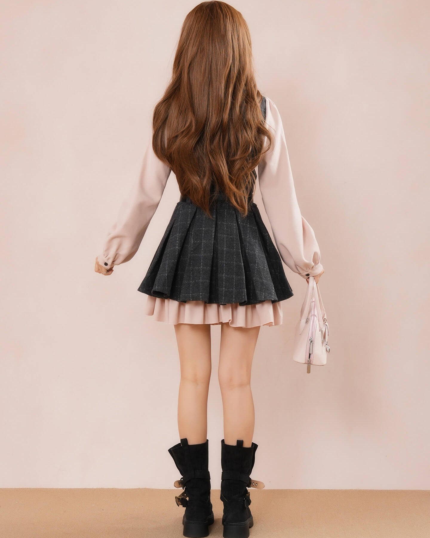 グレーチェックのスカートとピンクの二段フリルが、動くたびプリンセスのように揺れ、愛らしさをプラス。