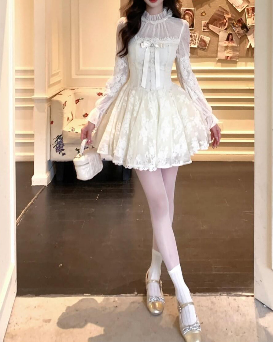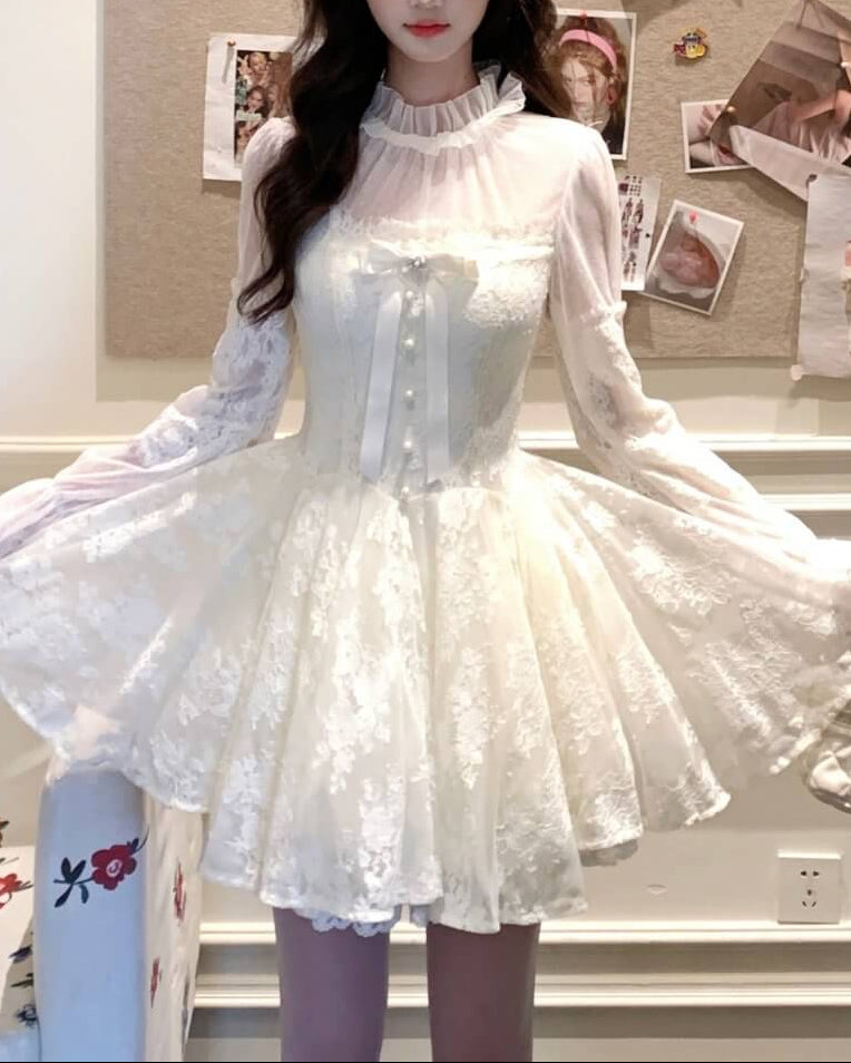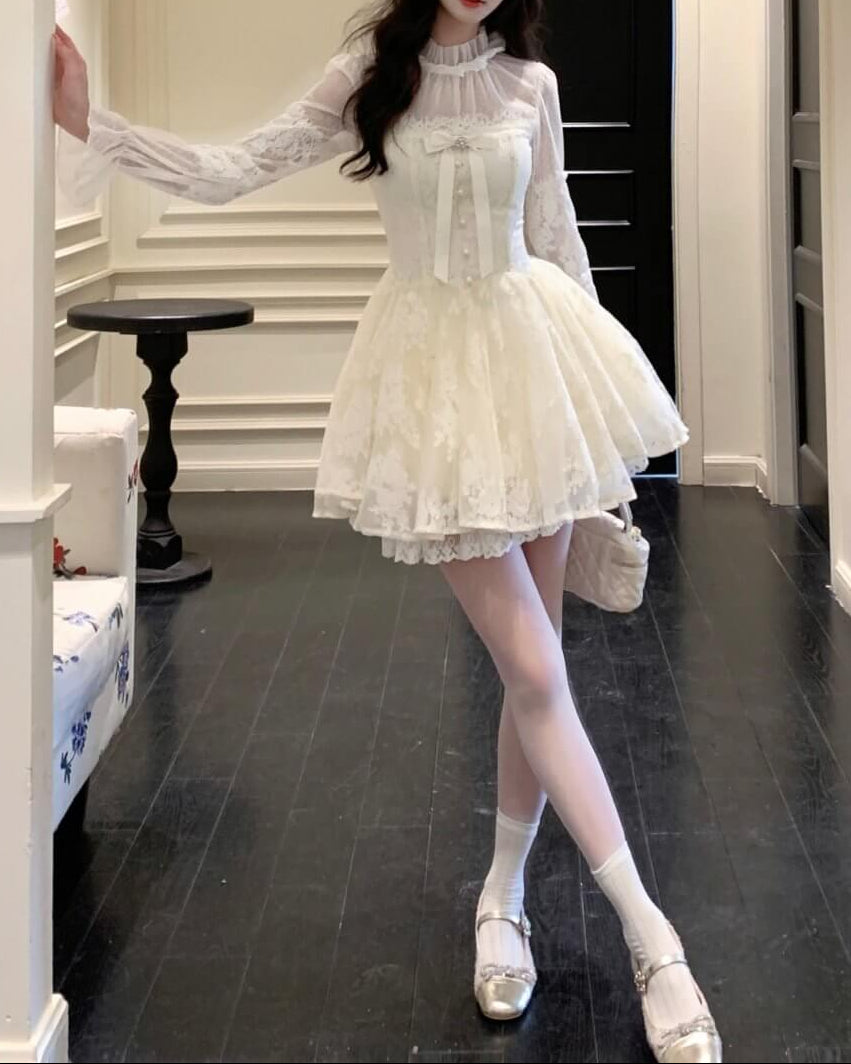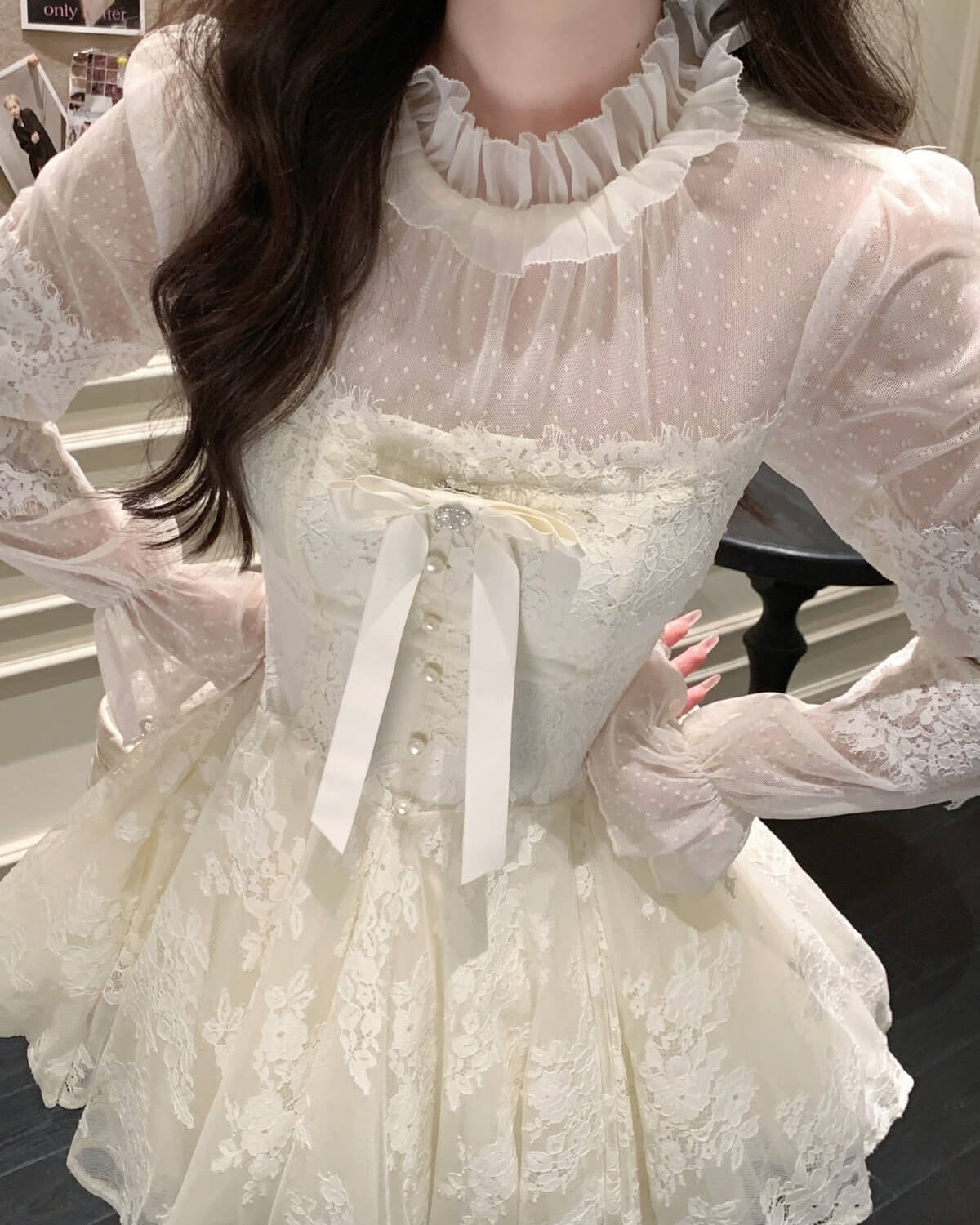 胸元のリボンとパール調ボタンが、物語のヒロインらしい甘さを演出。