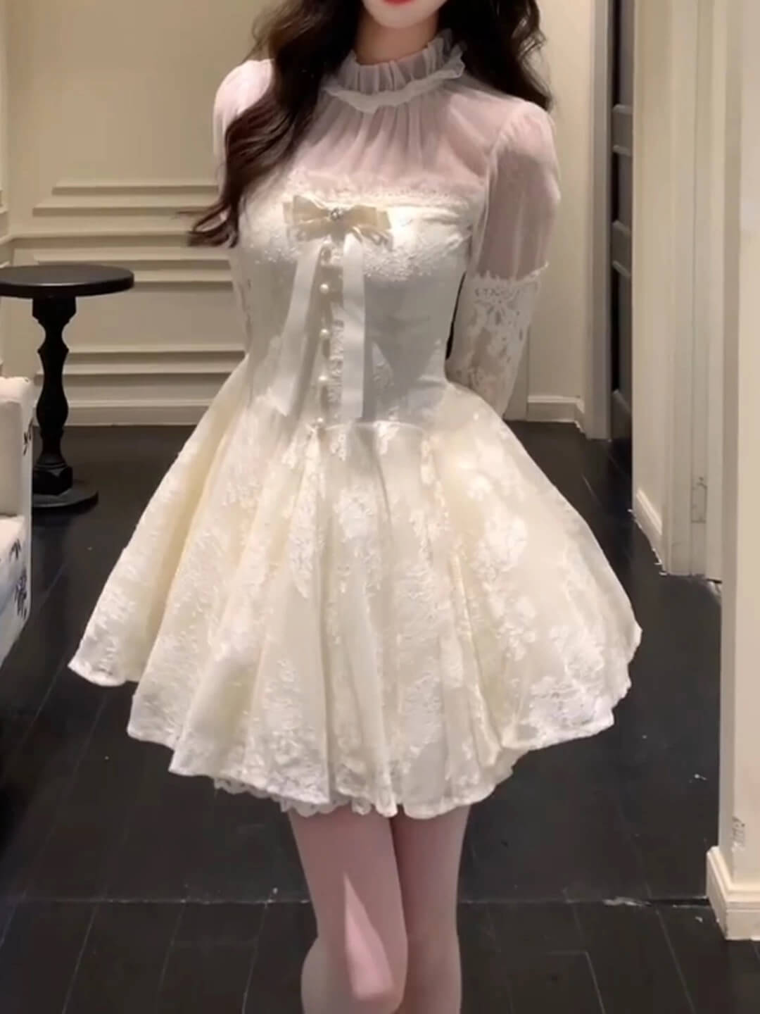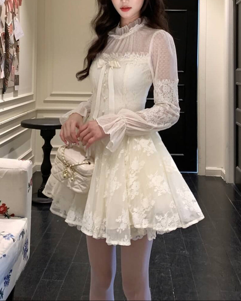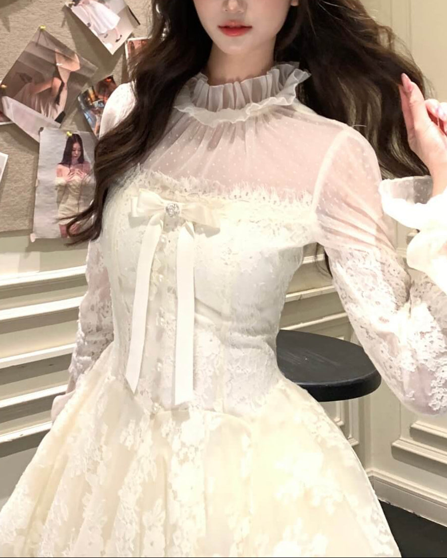 胸元のリボンとパール調ボタンが、物語のヒロインらしい甘さを演出。