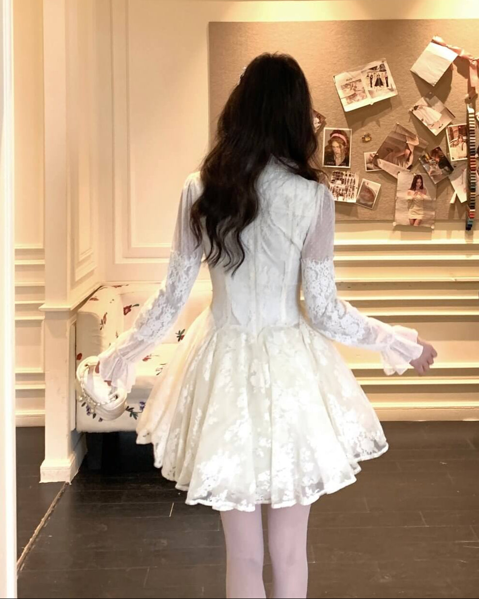 レースの重なりや透け感がとても美しく、着るだけで特別な一日が始まるようなワンピースです。 甘さの中に上品さがあり、写真映えも抜群なので、お出かけや特別な日にもぴったりです。