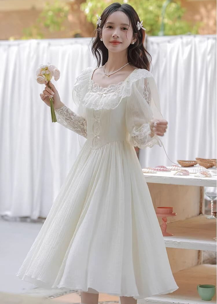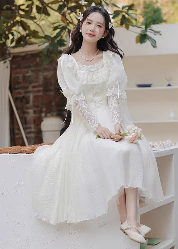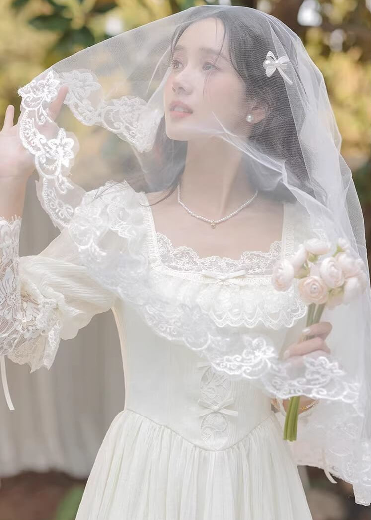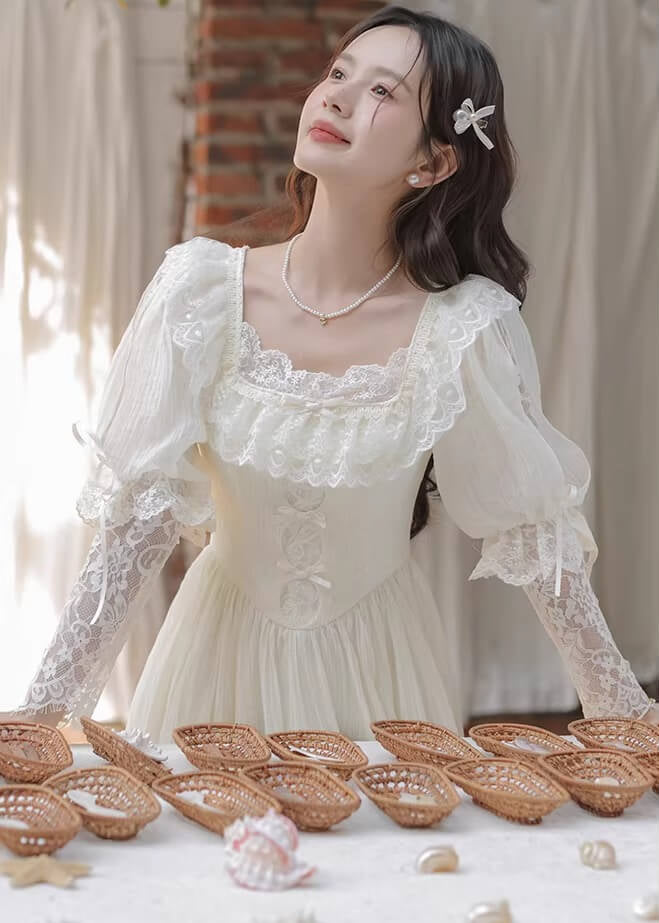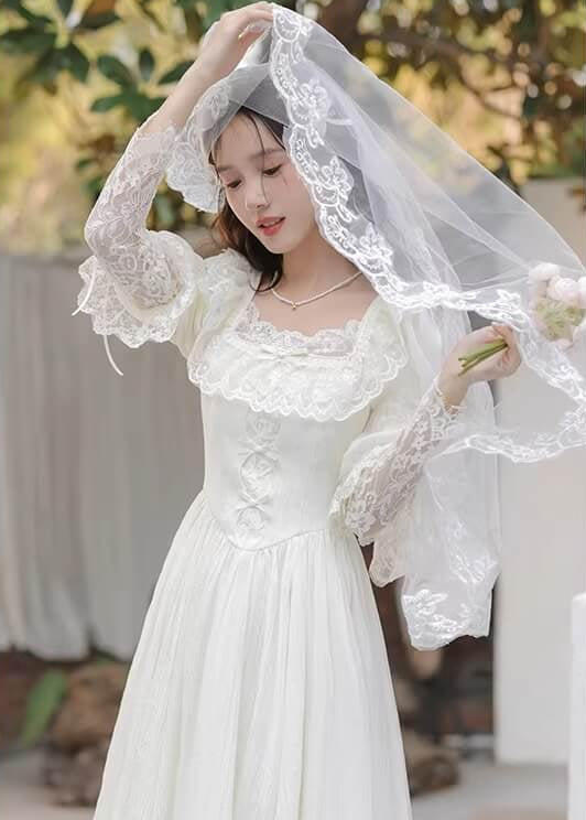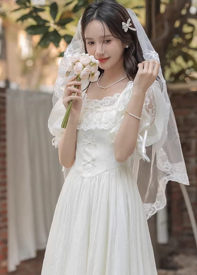 純白のカラーと繊細なレースがとても美しく、まるで物語のヒロインのような雰囲気を楽しめる一着です。 ふんわり広がるスカートがとても優雅で、歩くたびにロマンティックなシルエットを演出してくれます。