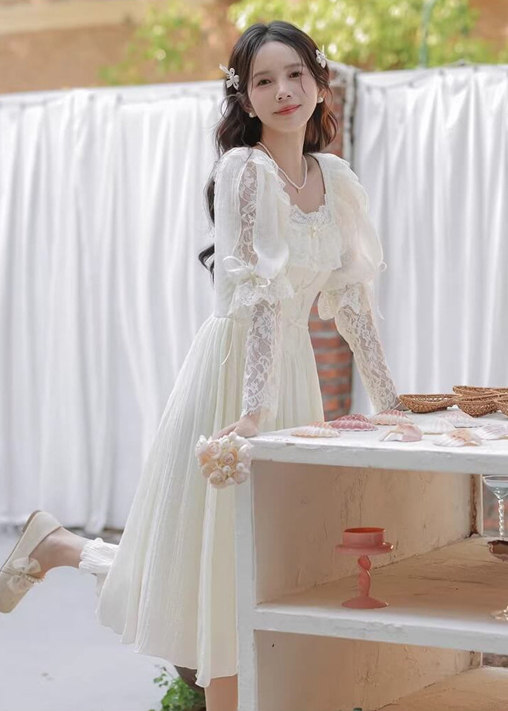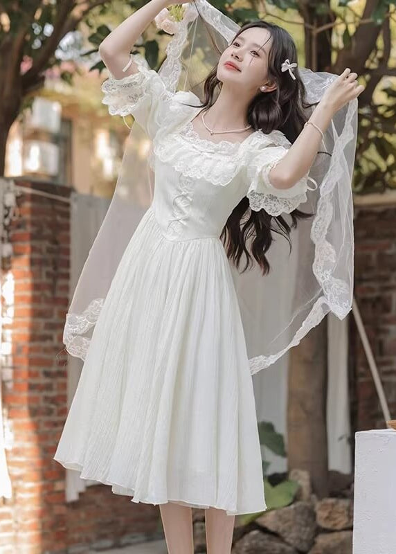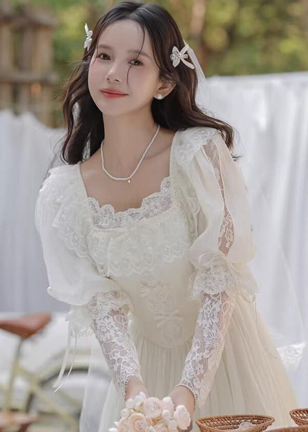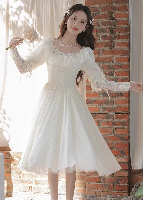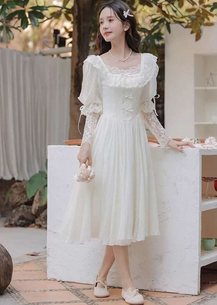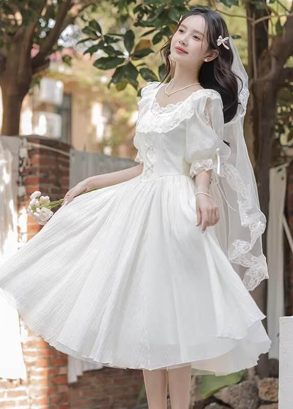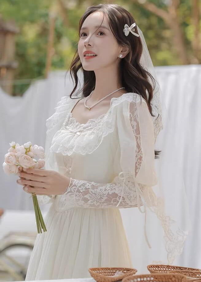 純白のカラーと繊細なレースがとても美しく、まるで物語のヒロインのような雰囲気を楽しめる一着です。 ふんわり広がるスカートがとても優雅で、歩くたびにロマンティックなシルエットを演出してくれます。