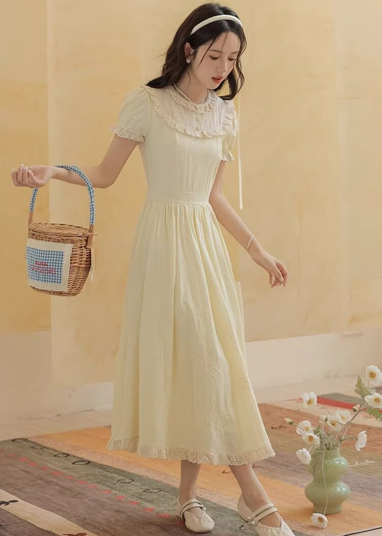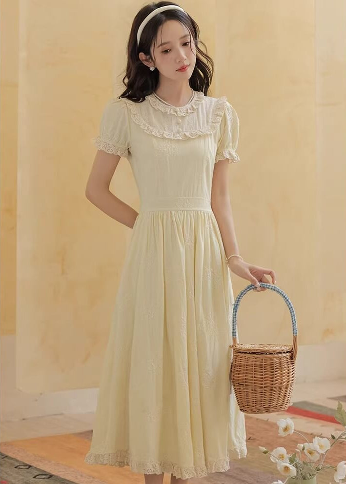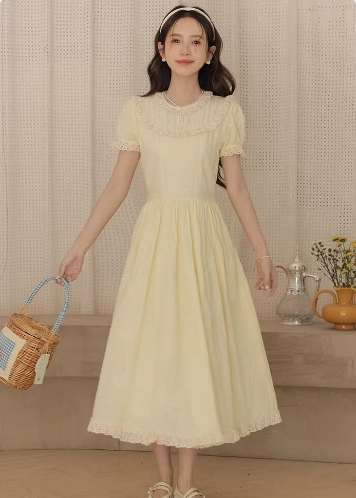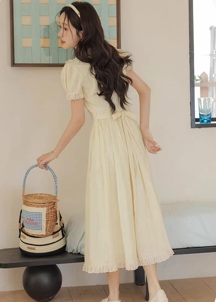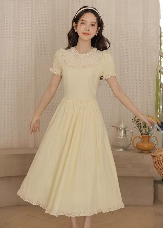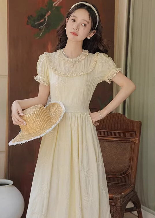 やさしいレモンカラーがとても可愛らしく、着るだけで春の庭園にいるような気分になれるワンピースです。 ふんわり広がるスカートラインが美しく、歩くたびにロマンティックな雰囲気を演出してくれます。