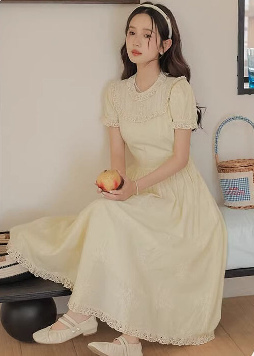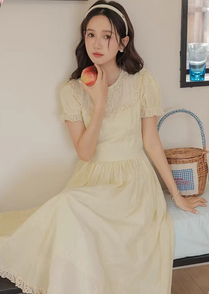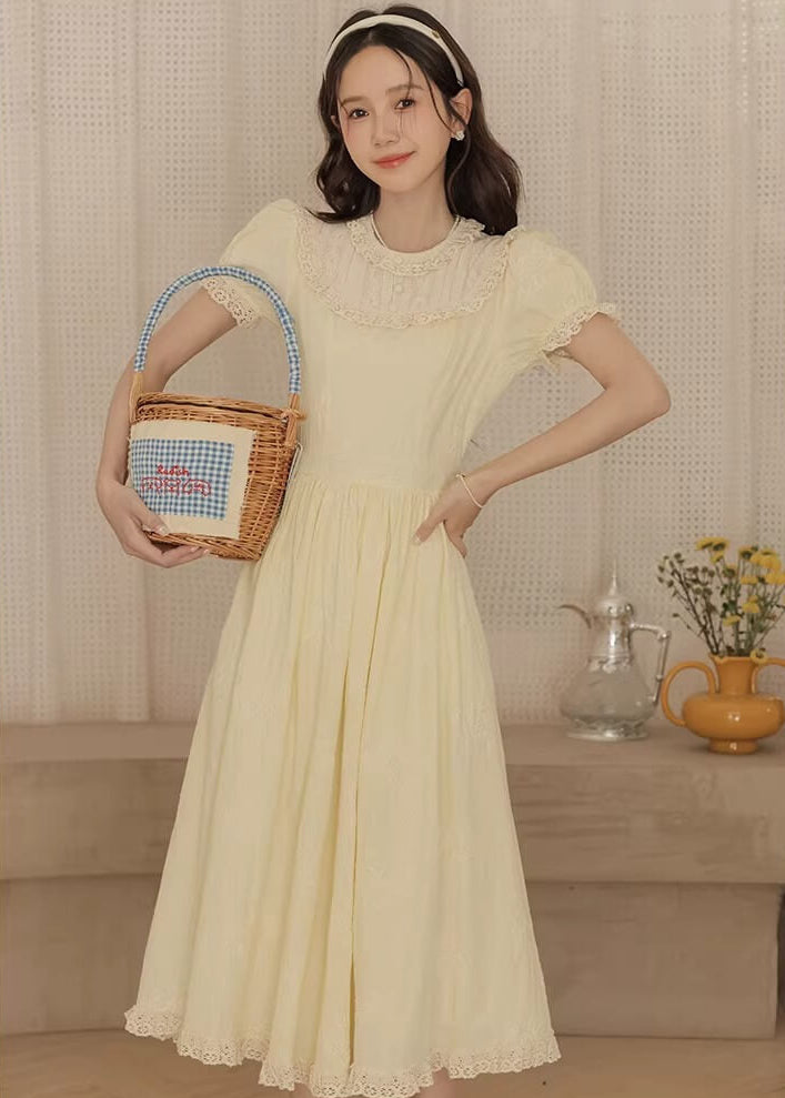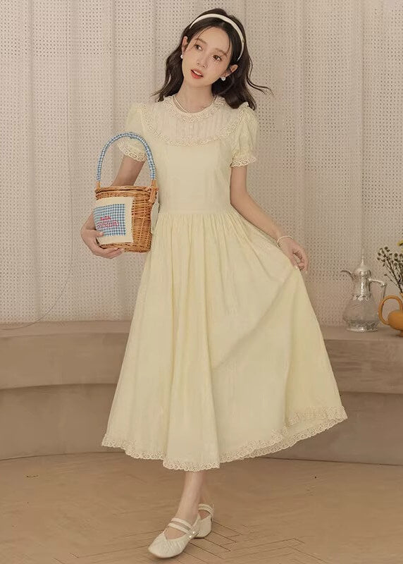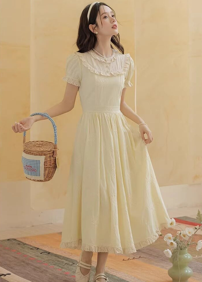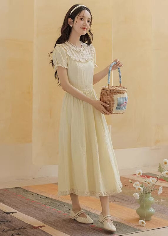 やさしいレモンカラーがとても可愛らしく、着るだけで春の庭園にいるような気分になれるワンピースです。 ふんわり広がるスカートラインが美しく、歩くたびにロマンティックな雰囲気を演出してくれます。