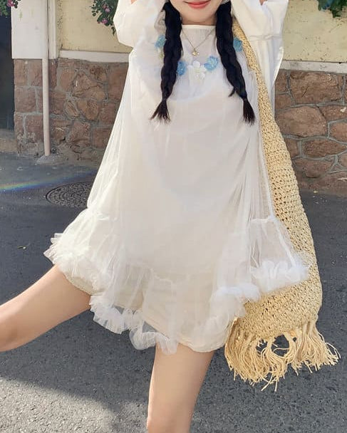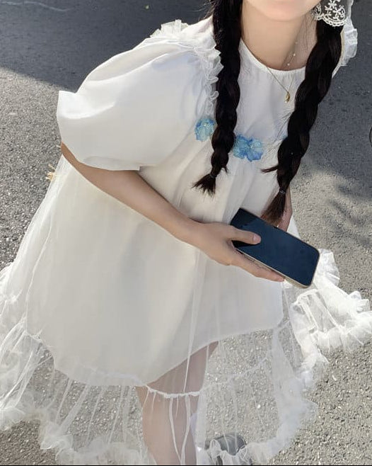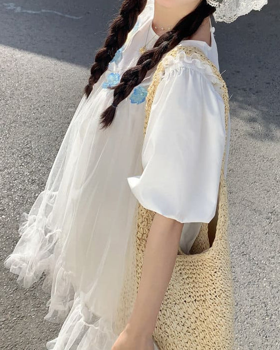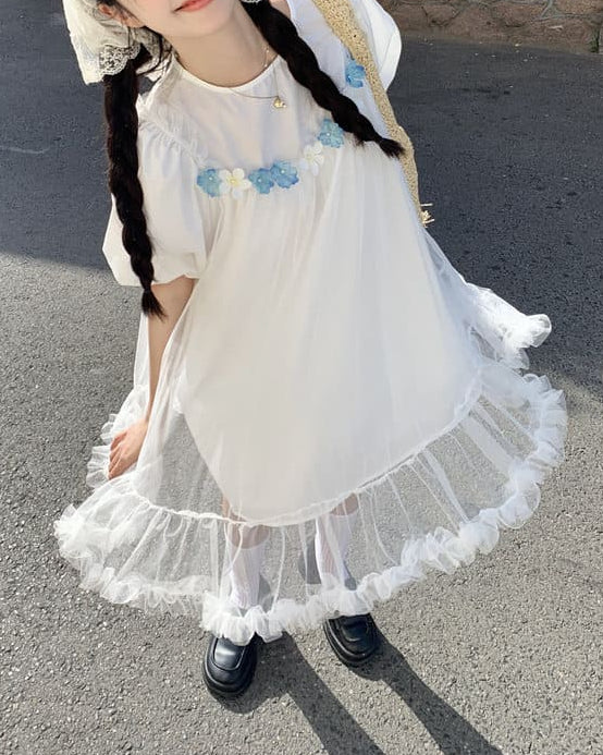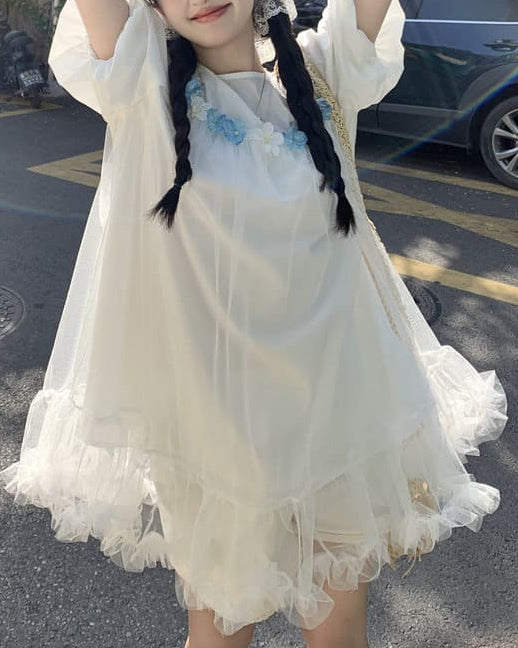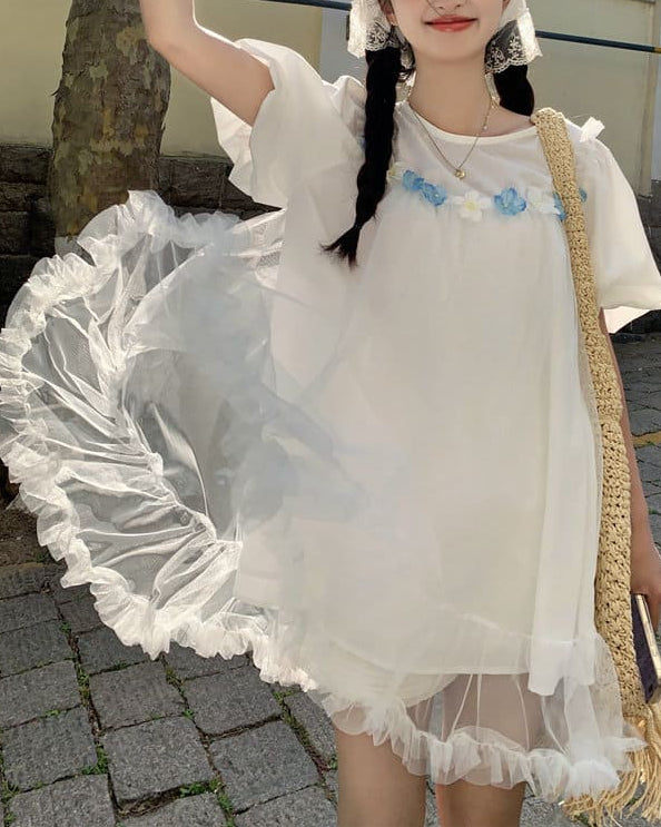 ふんわりとしたチュールと小花の組み合わせがとても可愛らしく、まるでおとぎ話の中に入り込んだような一着です。海辺や公園、テーマパークなど、特別な日に着たくなるロマンティックな雰囲気が魅力です。ゆったりした着心地なので、長時間のお出かけでもストレスなく着ていただけます。