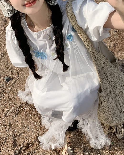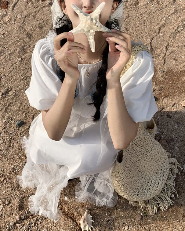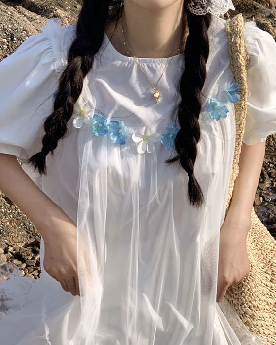 《一目で恋する透明感》きらめく海辺と白花のプリンセスワンピース