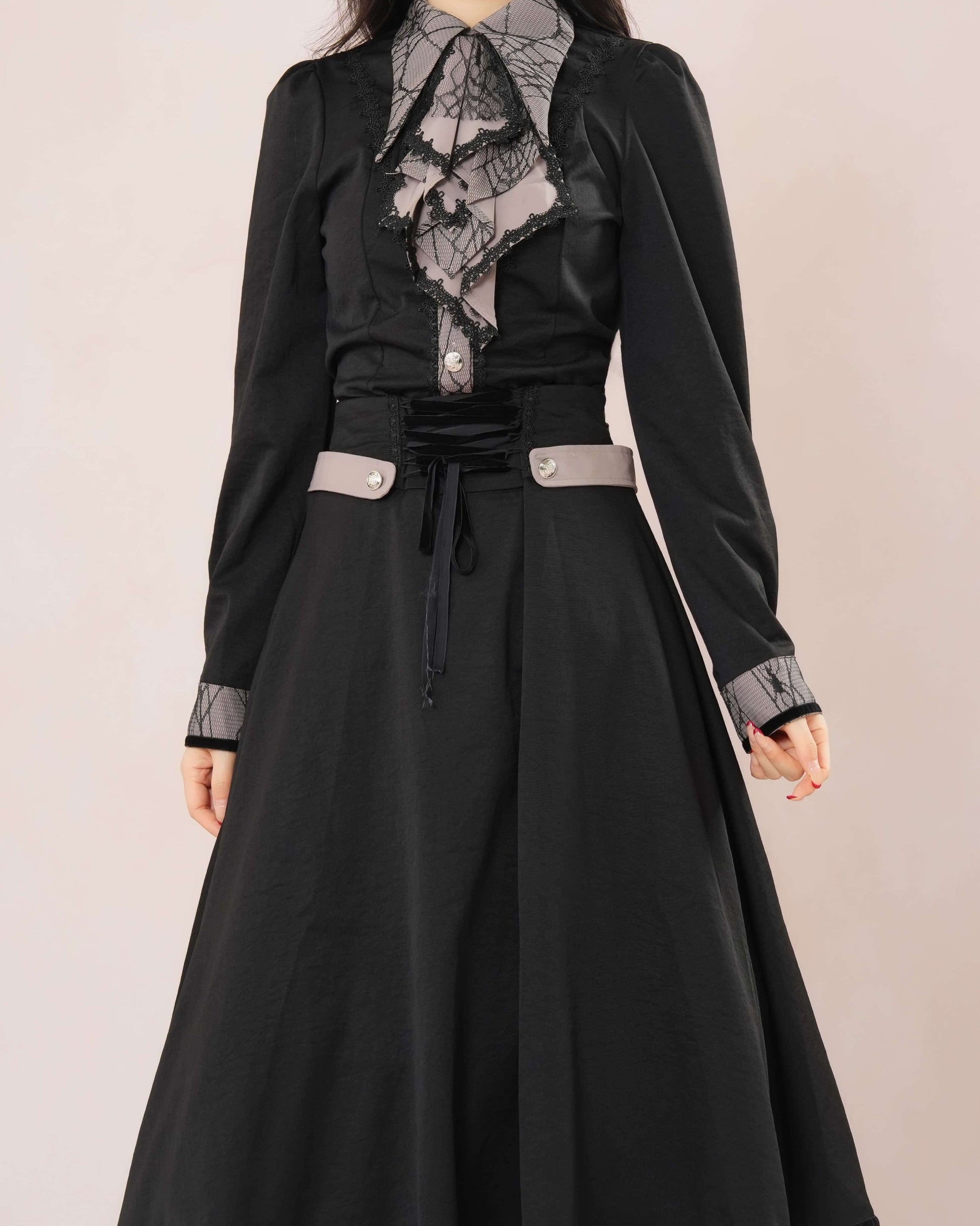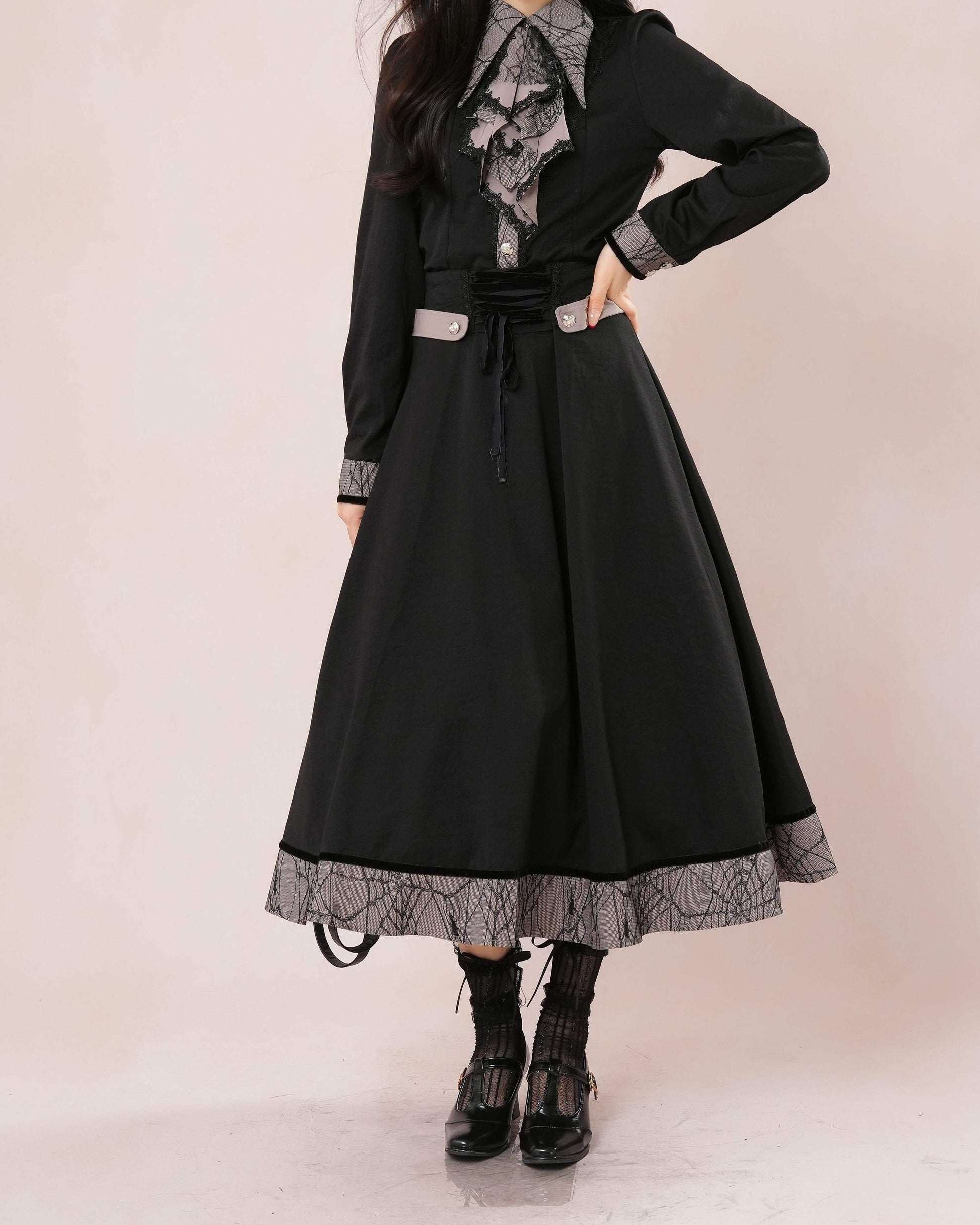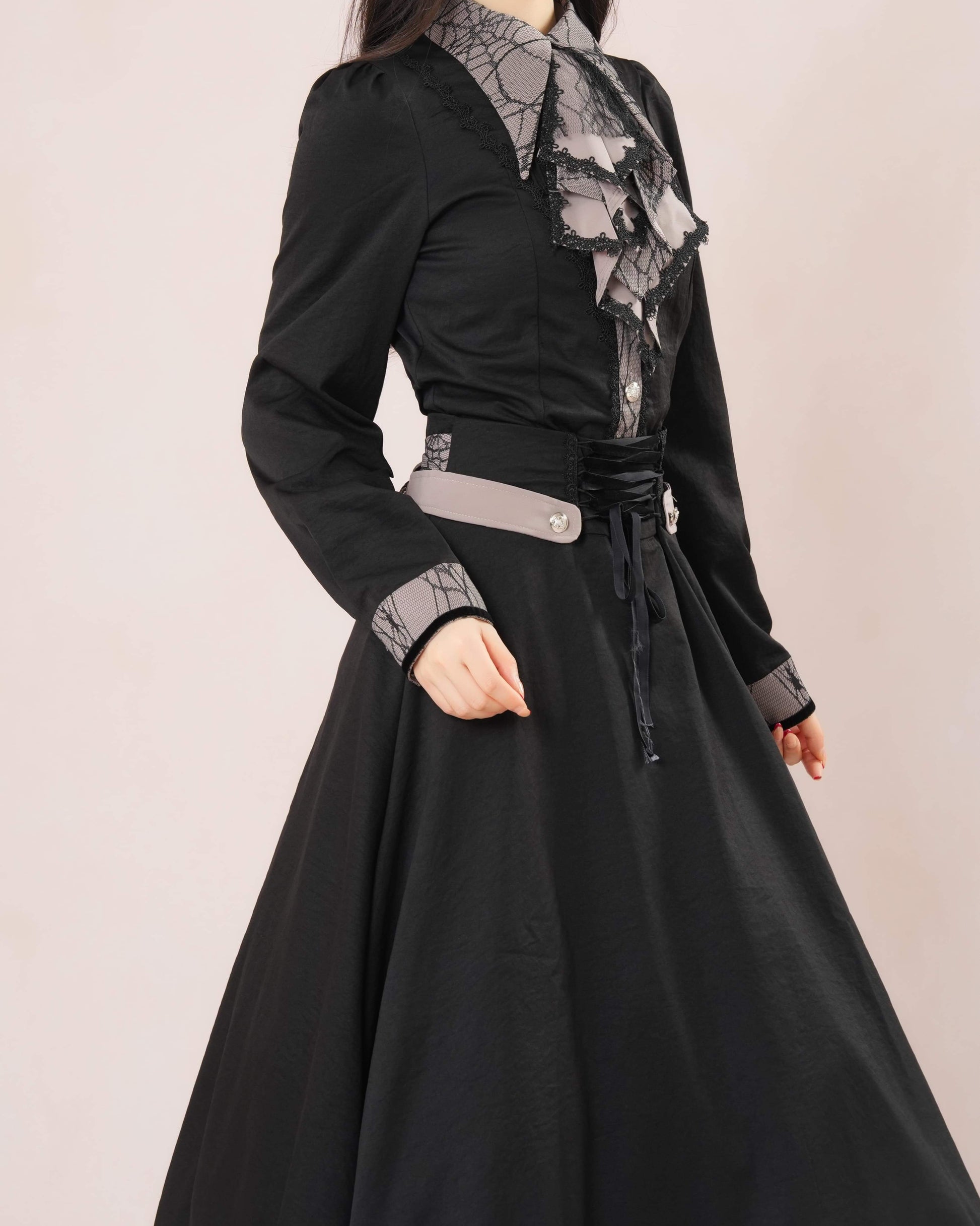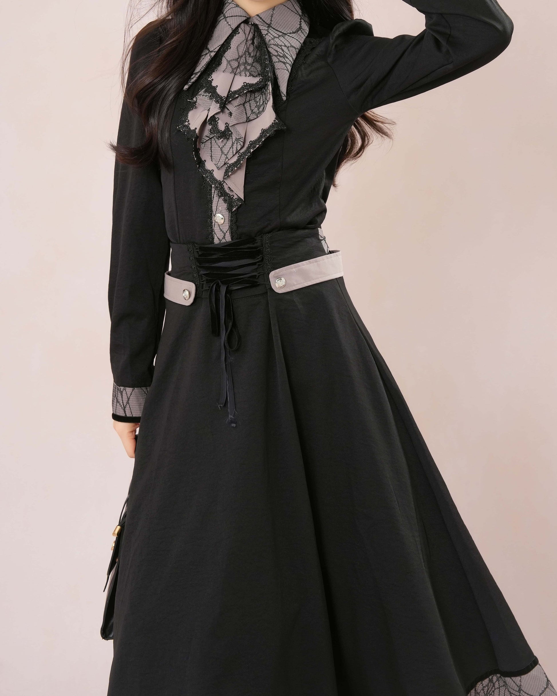 気品漂うレース襟とロングフレアが織りなす、
