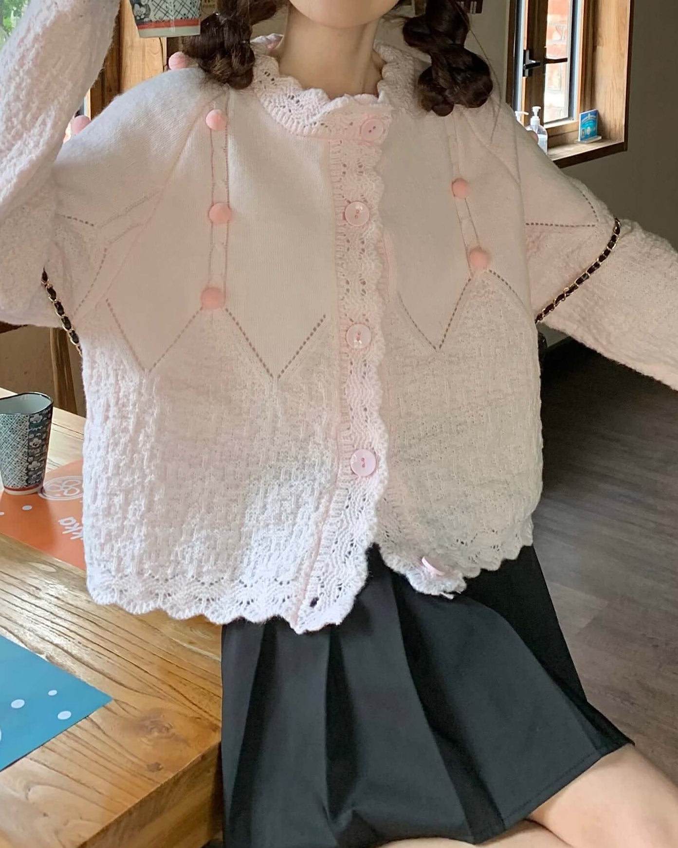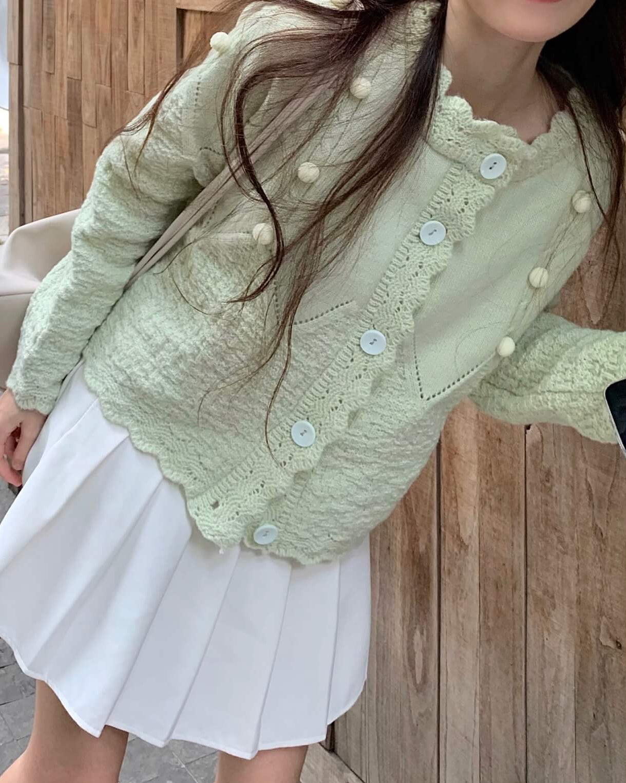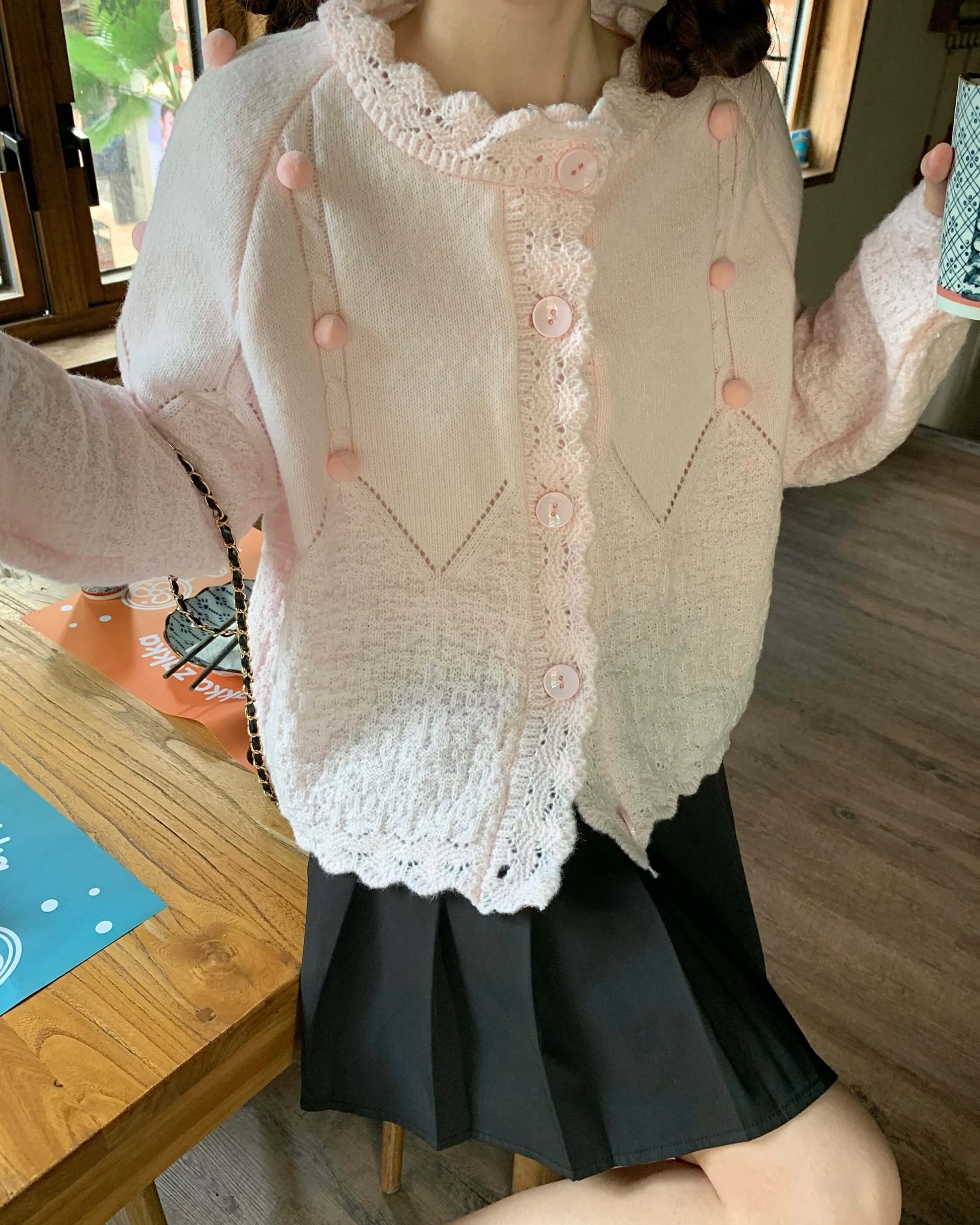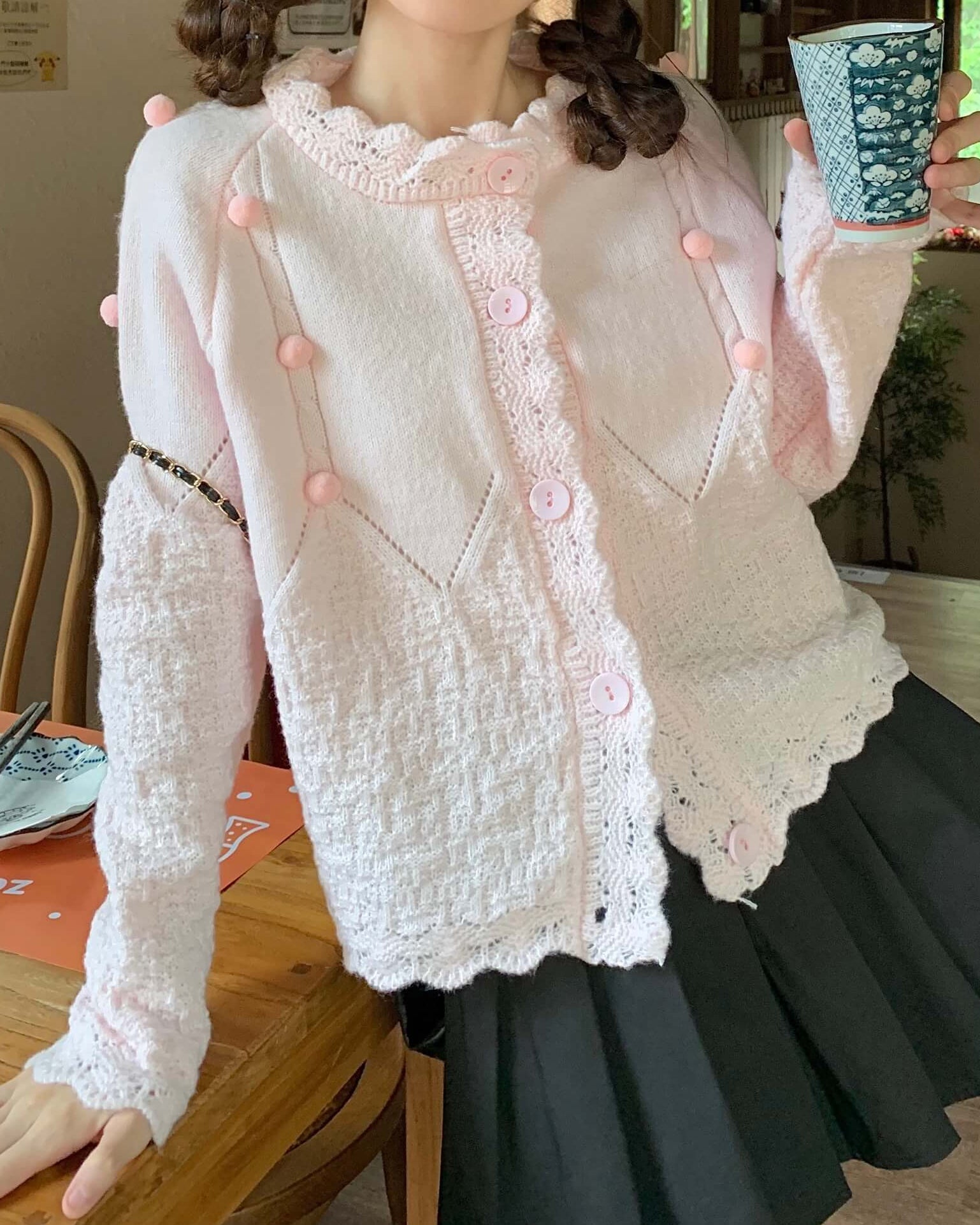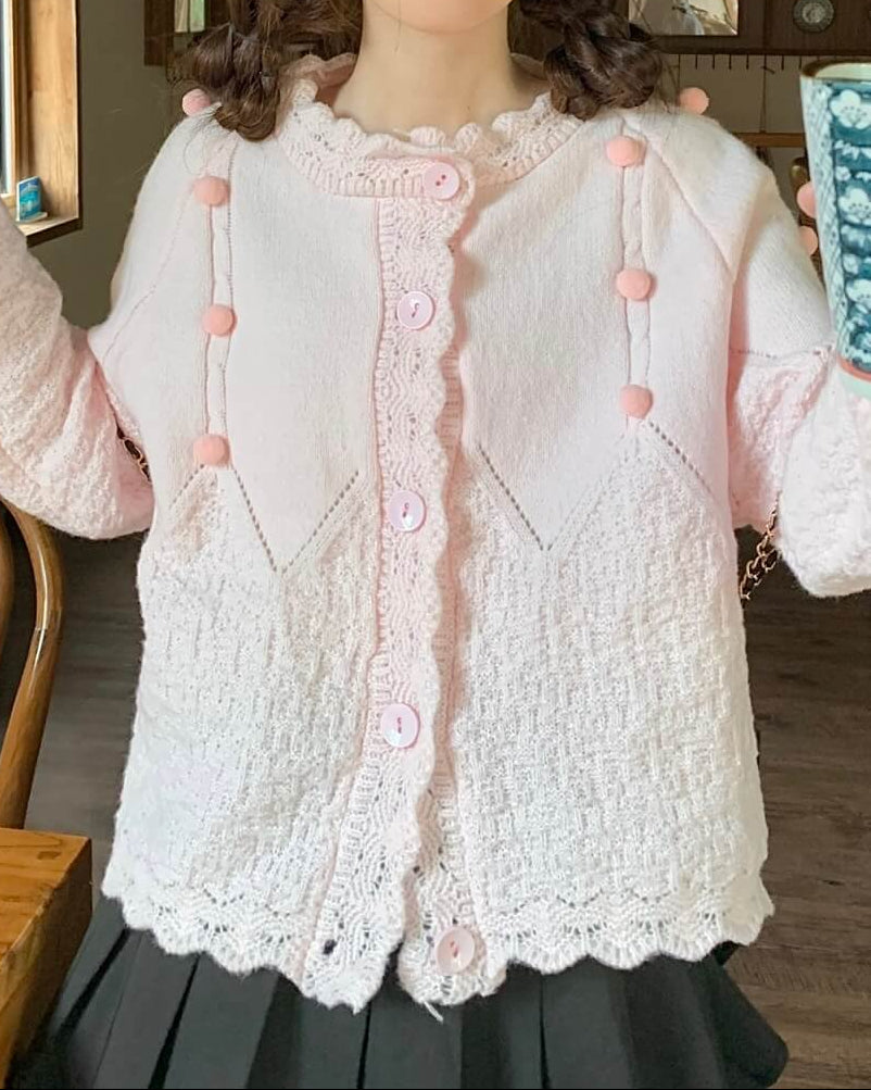 ・襟元のスカラップとぽんぽんボタンが甘く上品なアクセントに。