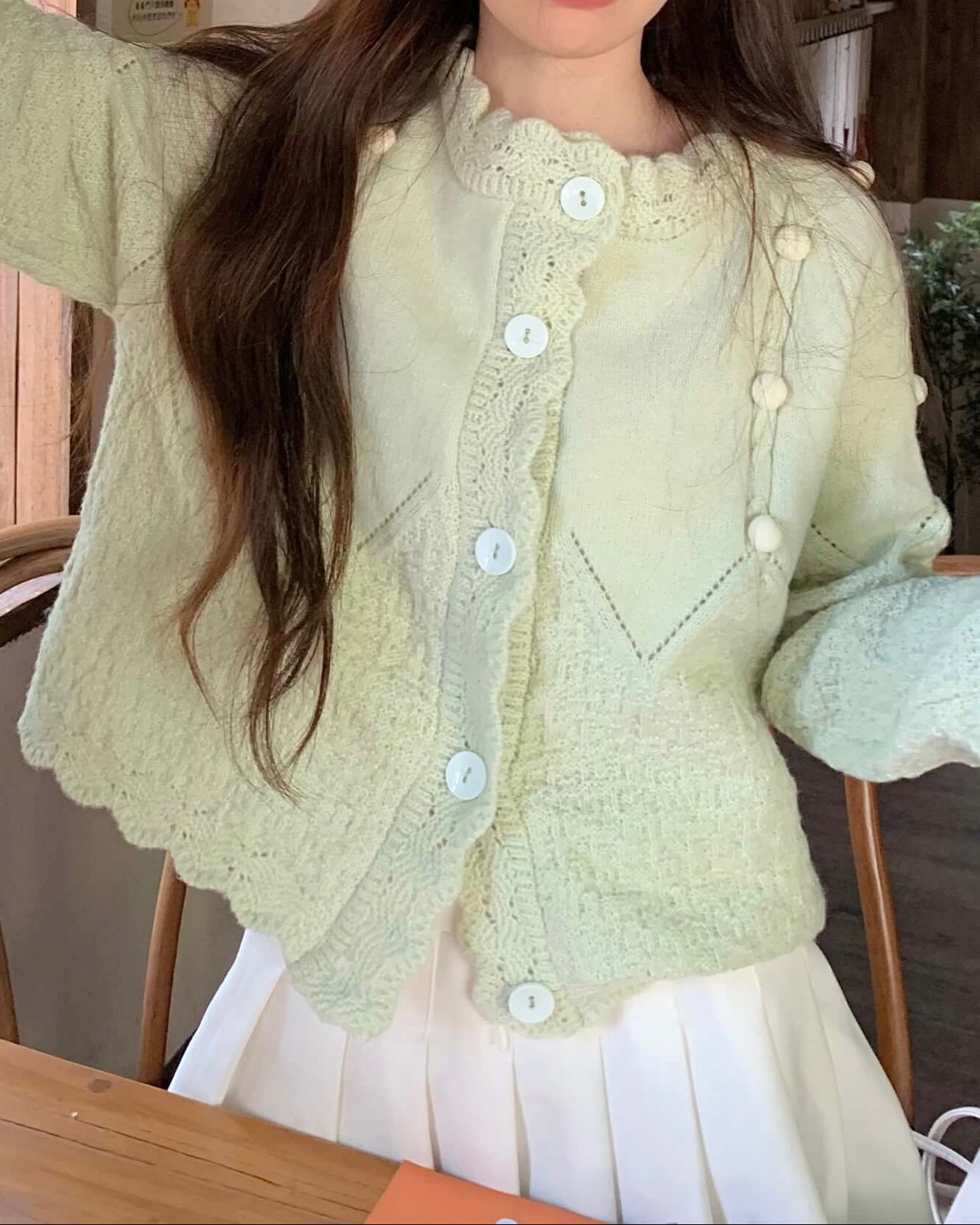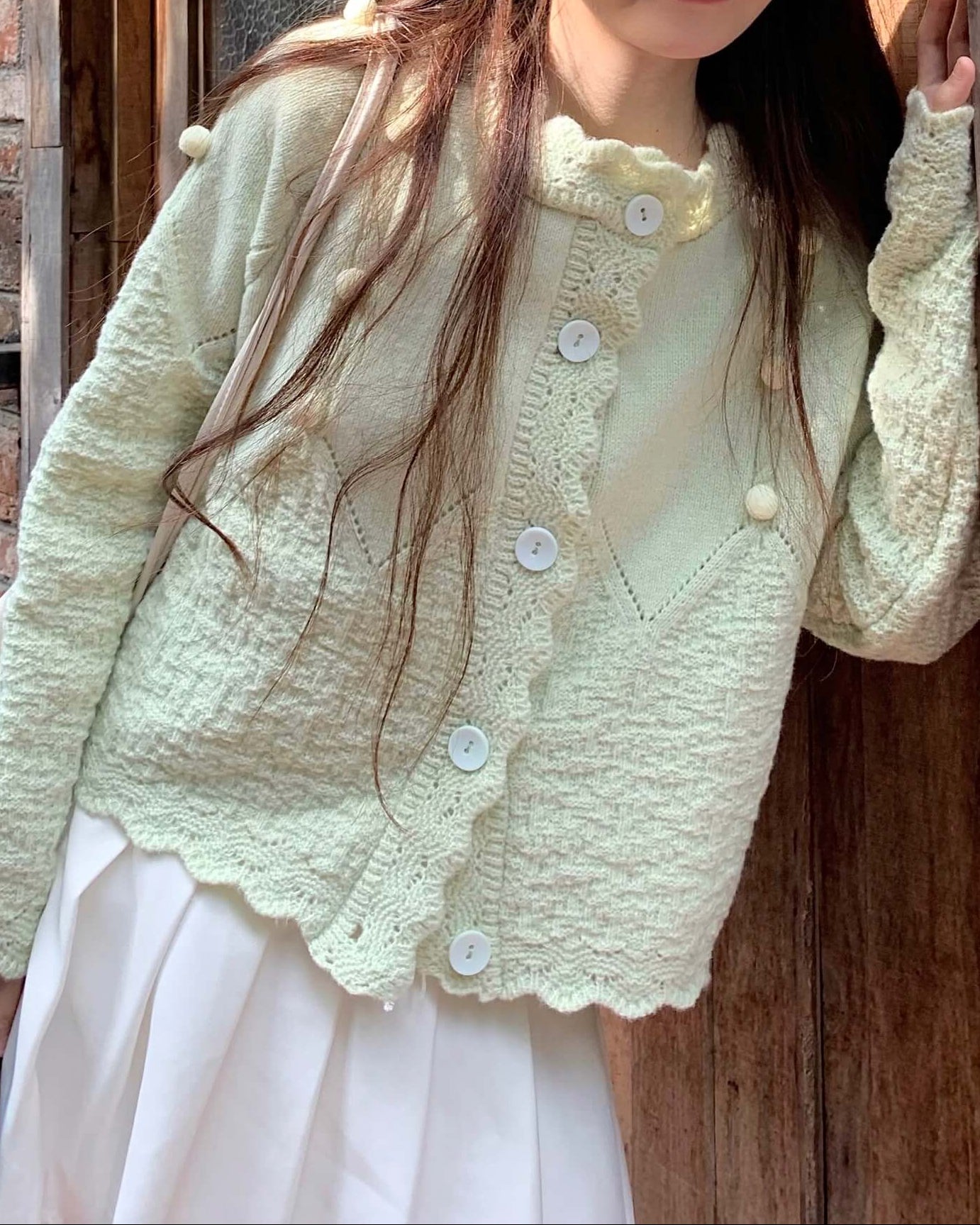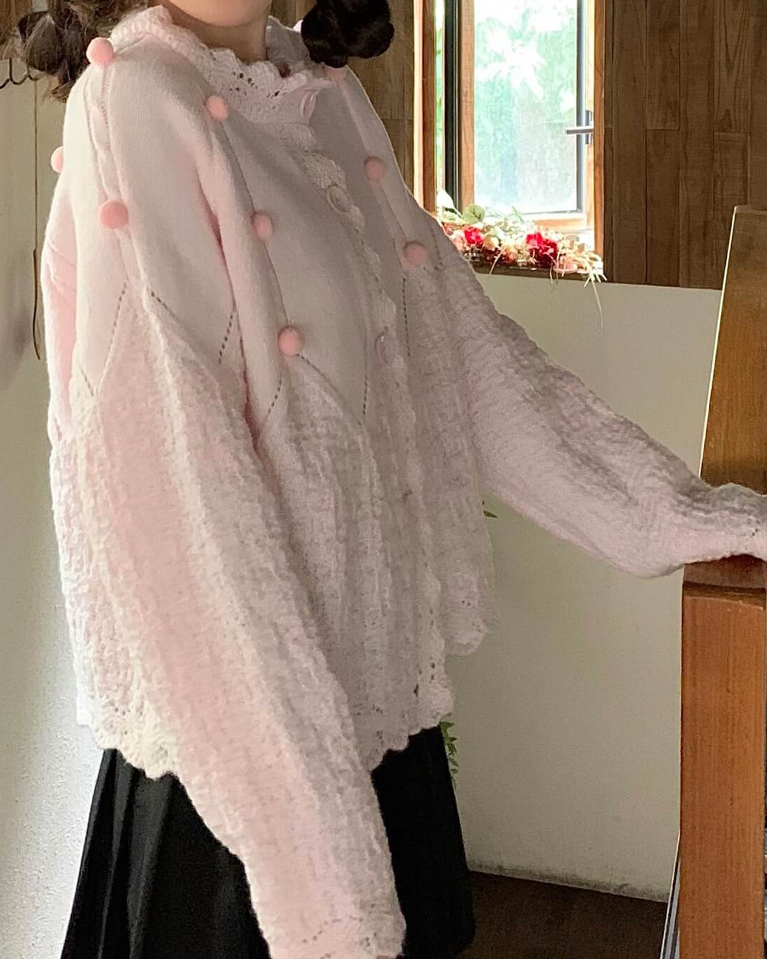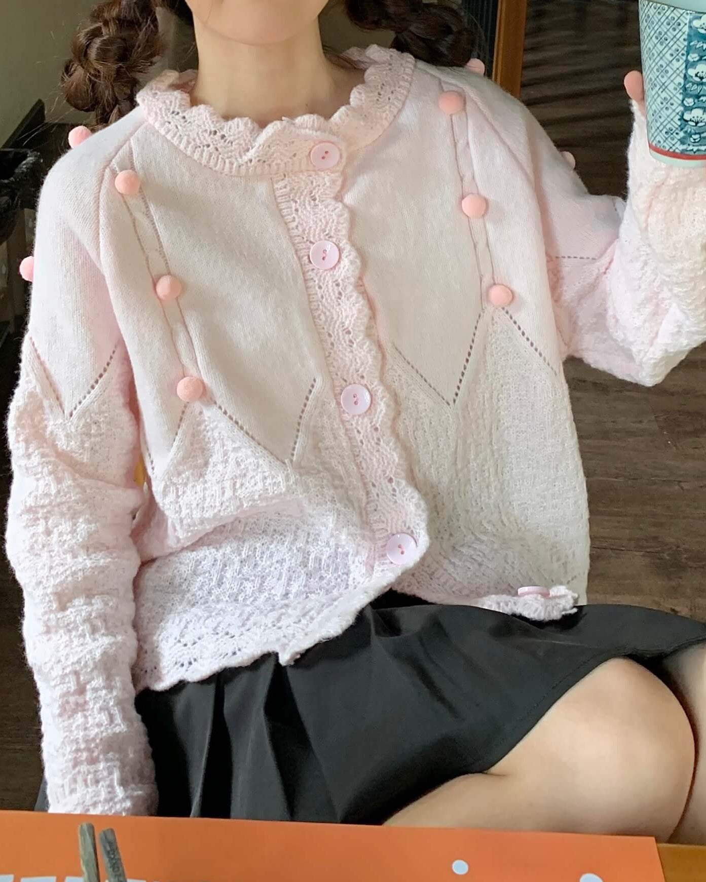・襟元のスカラップとぽんぽんボタンが甘く上品なアクセントに。