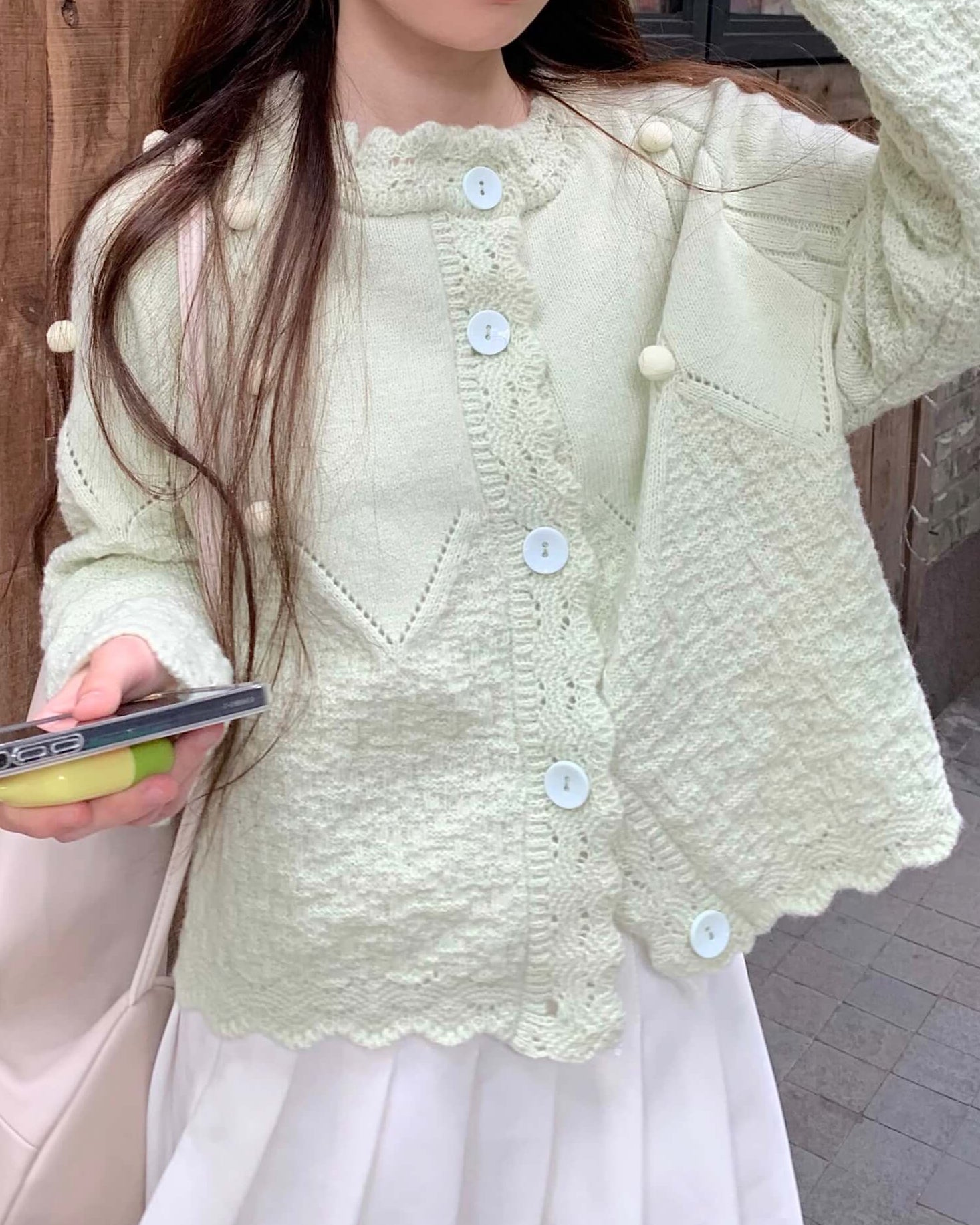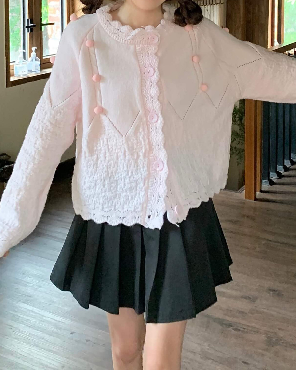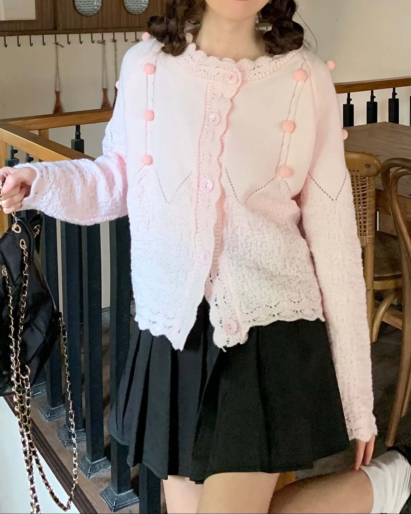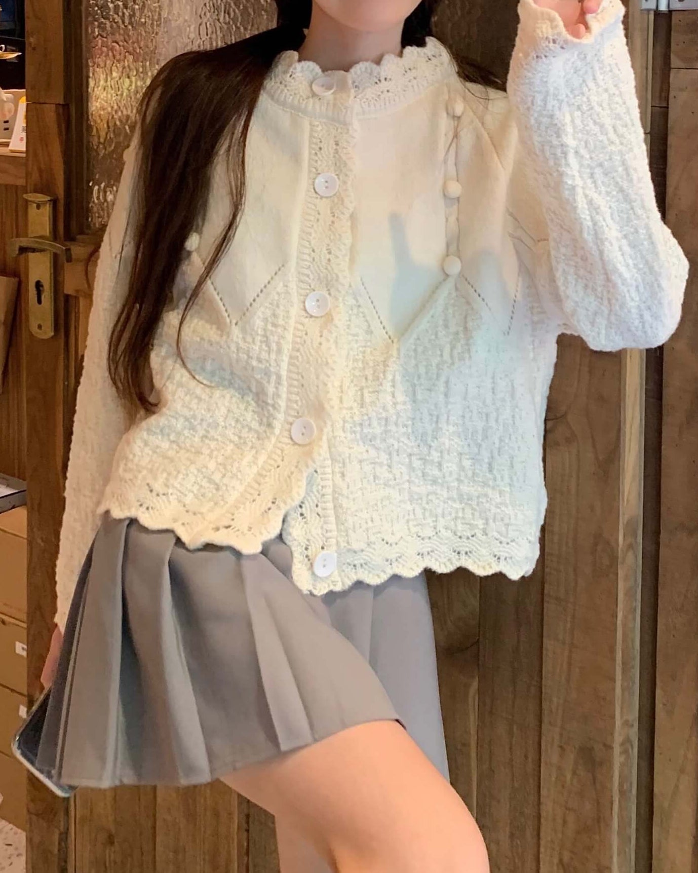 ・襟元のスカラップとぽんぽんボタンが甘く上品なアクセントに。