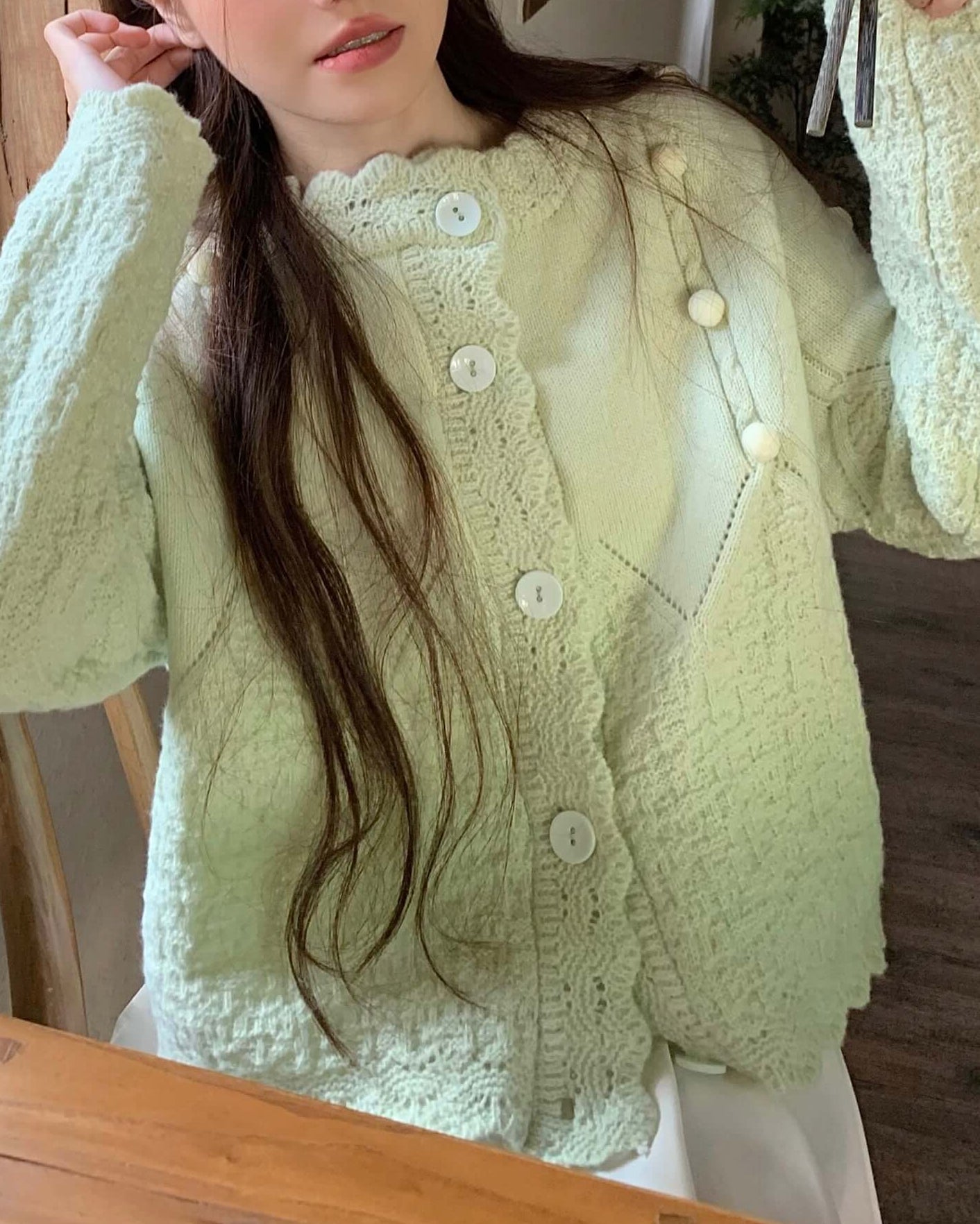 淡く優しいカラーと丸襟デザインが可憐な印象を与える、ふわふわニットカーディガン